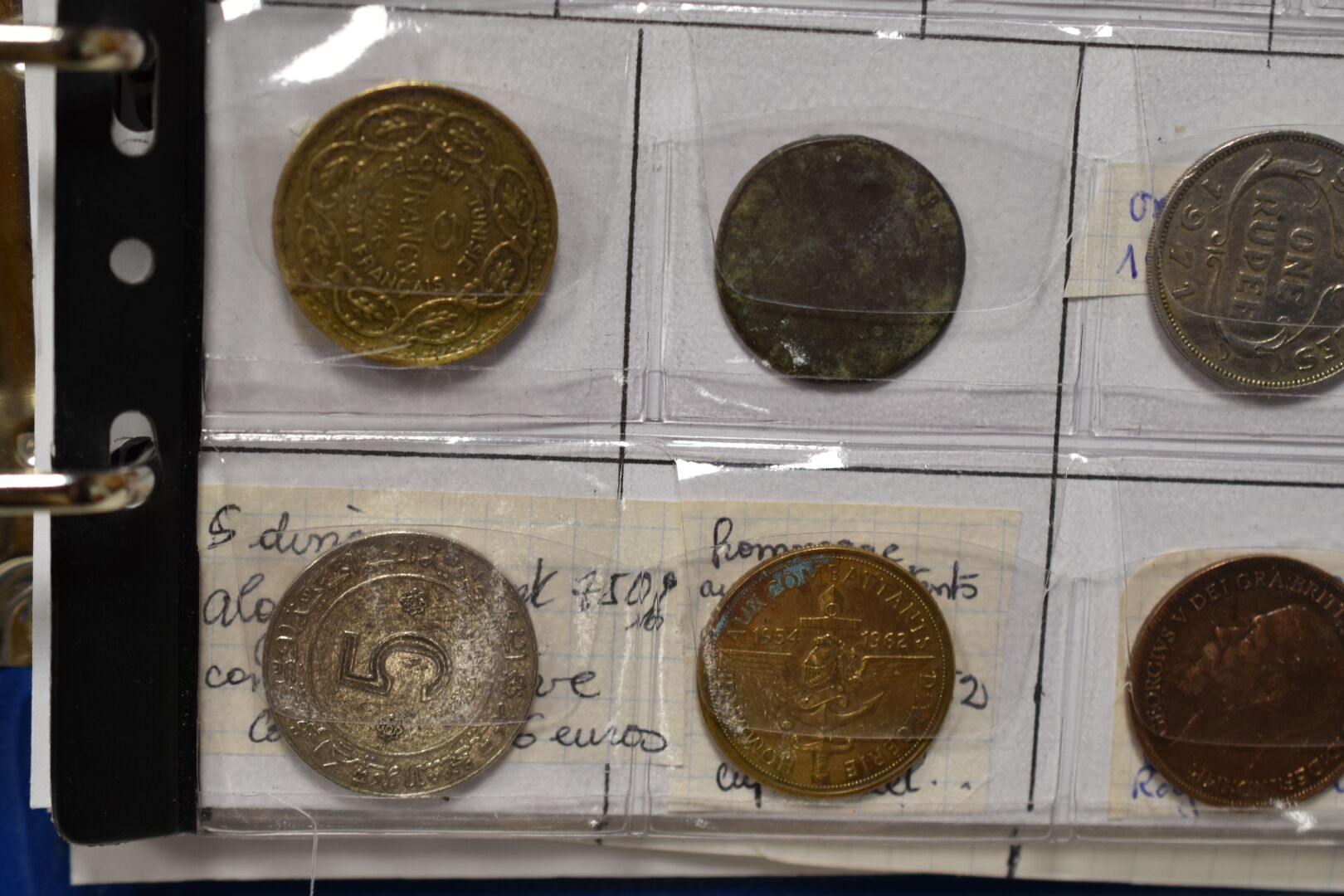 Classeur contenant environ 180 pièces de monnaie modernes dont Allemagne, Seychelles, Chypre, Belgique, Grèce, Italie, Espagne, Djibouti, France. Également 1 pièce de 5 Dinars Algérien en argent 750/1000e – Poids : 12g et 1 pièce hommage aux combattants d’Algérie .