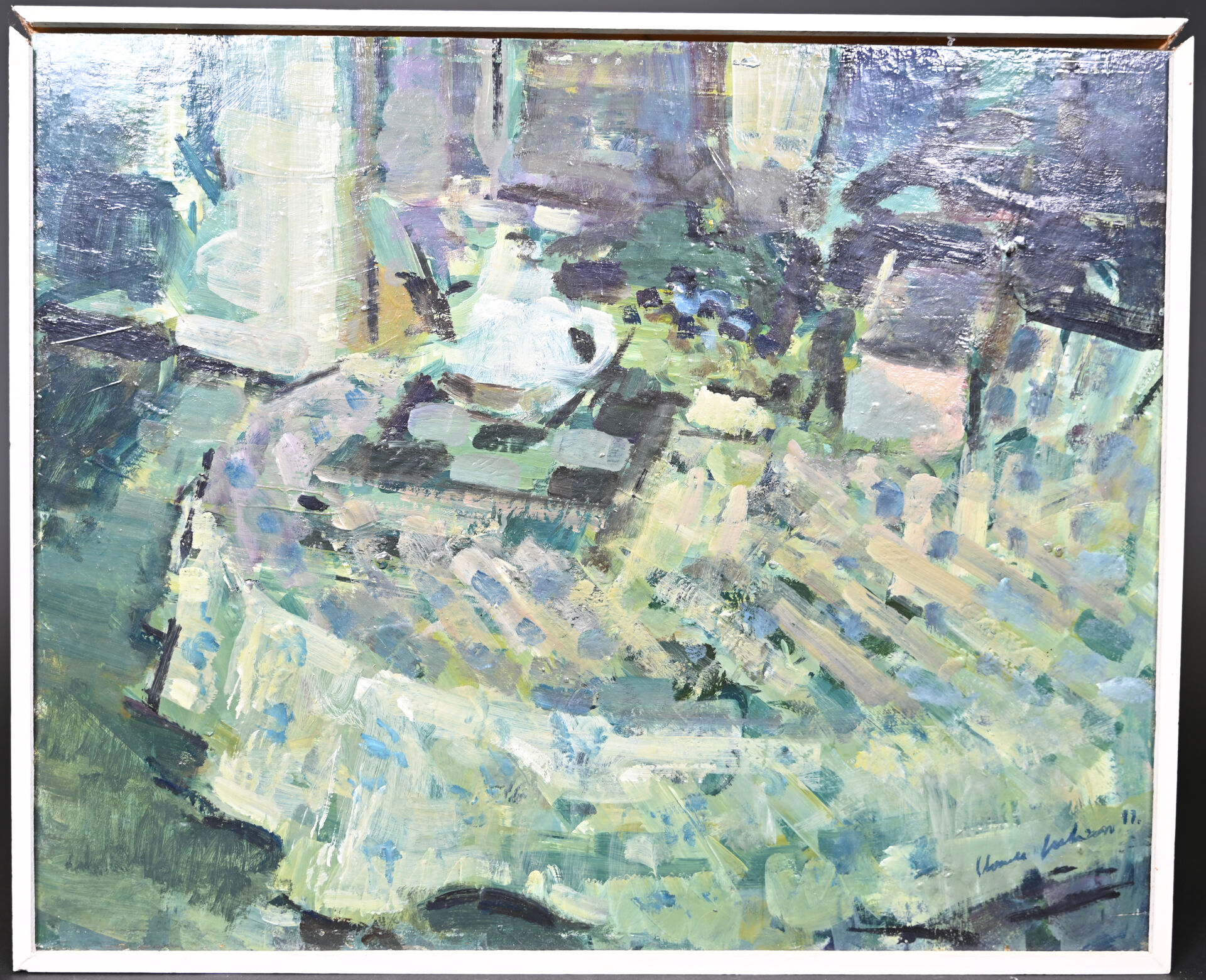 Claude JULIAN (XXème). Nature morte à la table. Huile sur panneau signée et datée 1977 ? en bas à droite. 40 x 50 cm.