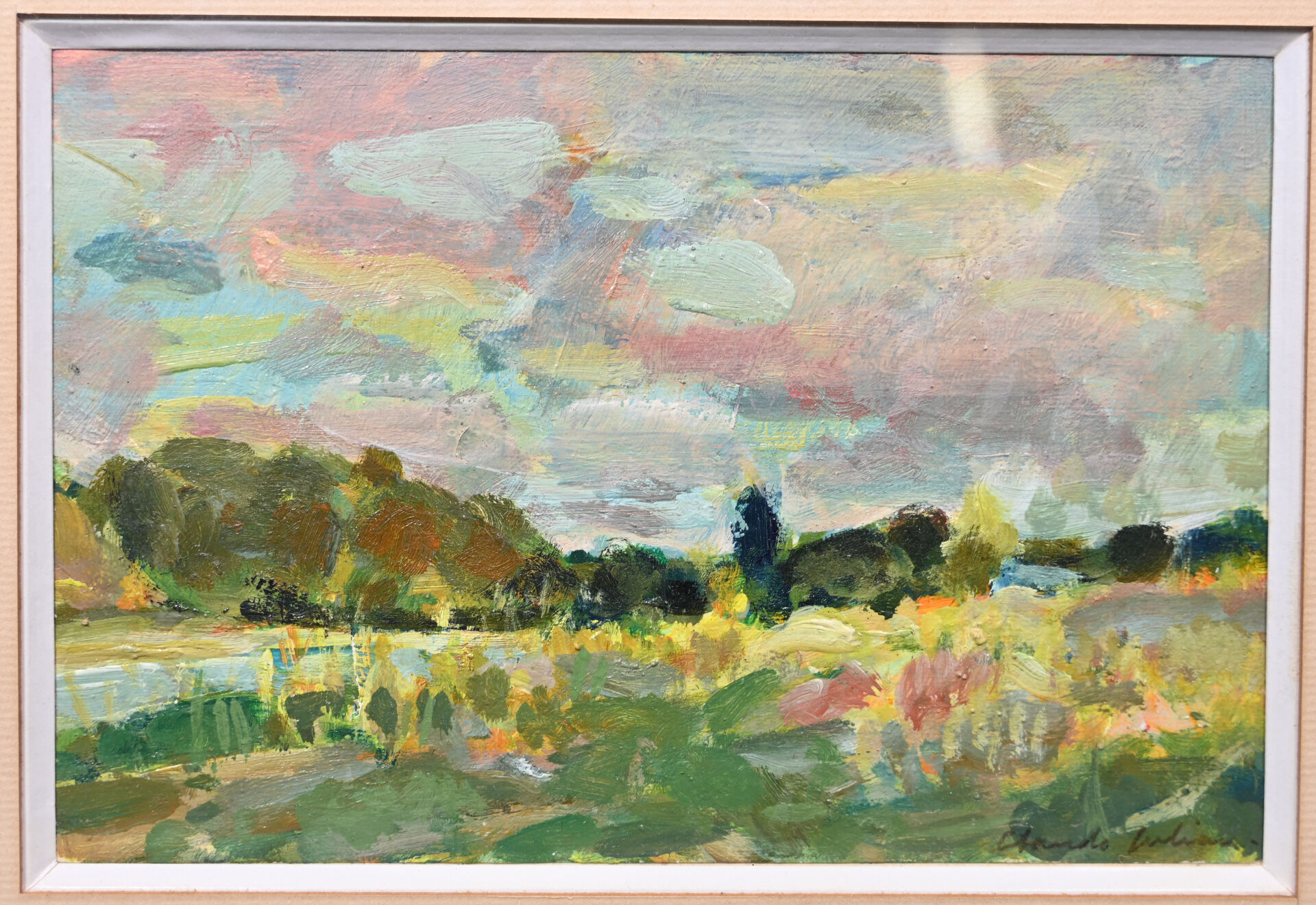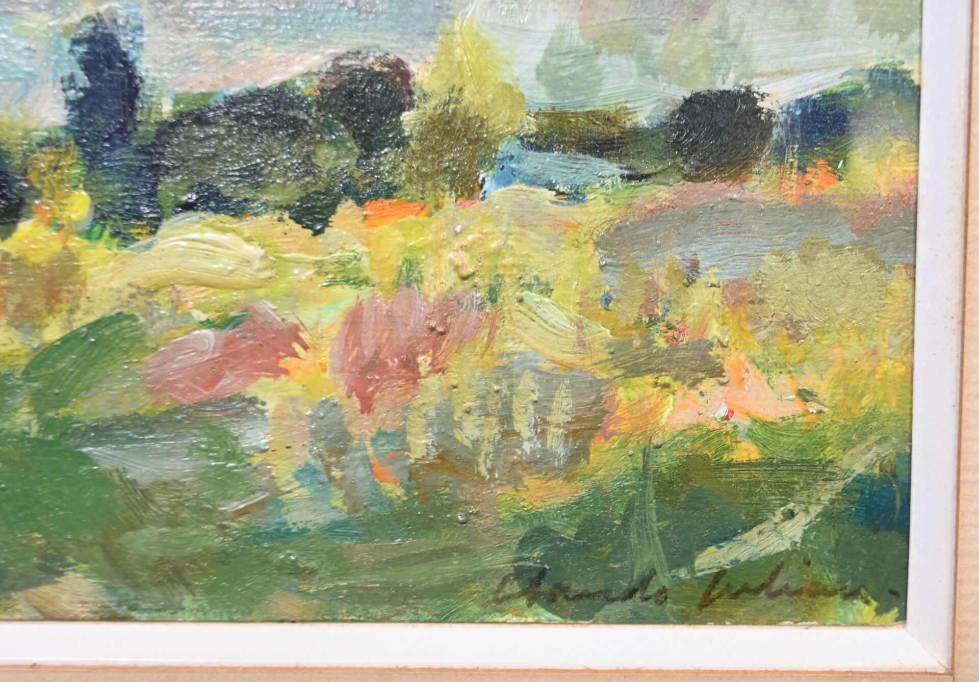 Claude JULIAN (XXème). Paysage à la rivière. Huile sur carton signée en bas à droite. 14 x 20 cm à vue.