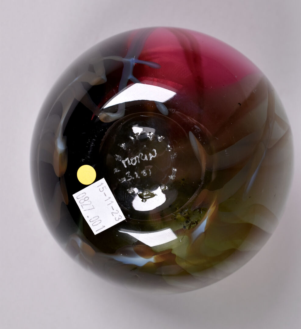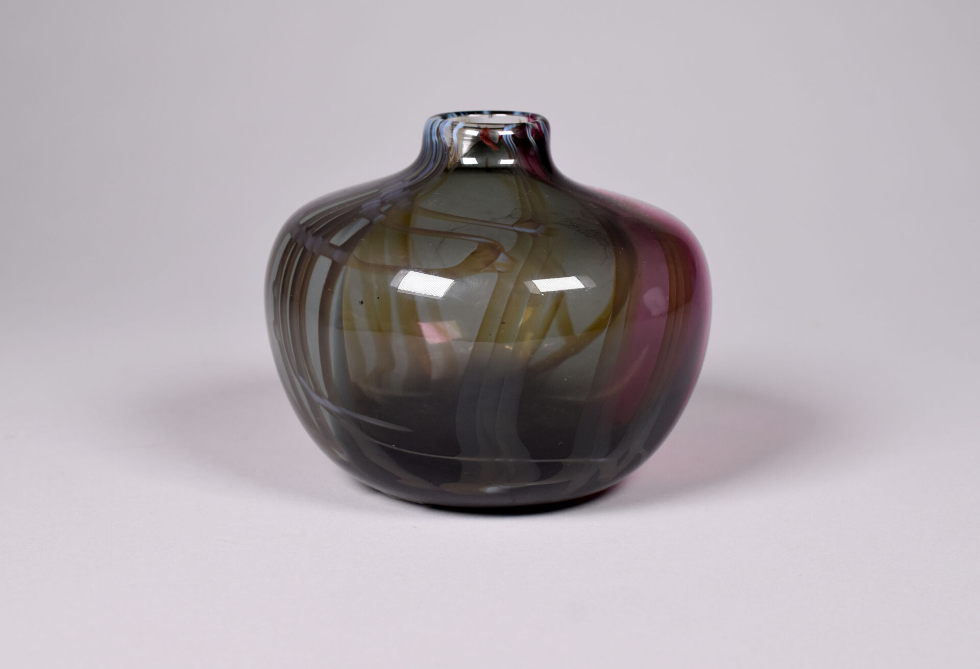 Claude MORIN (1933-2021). Petit vase boule à col rétréci en verre mauve, vert et fumé. Signé au dessous. Haut. : 12 cm.