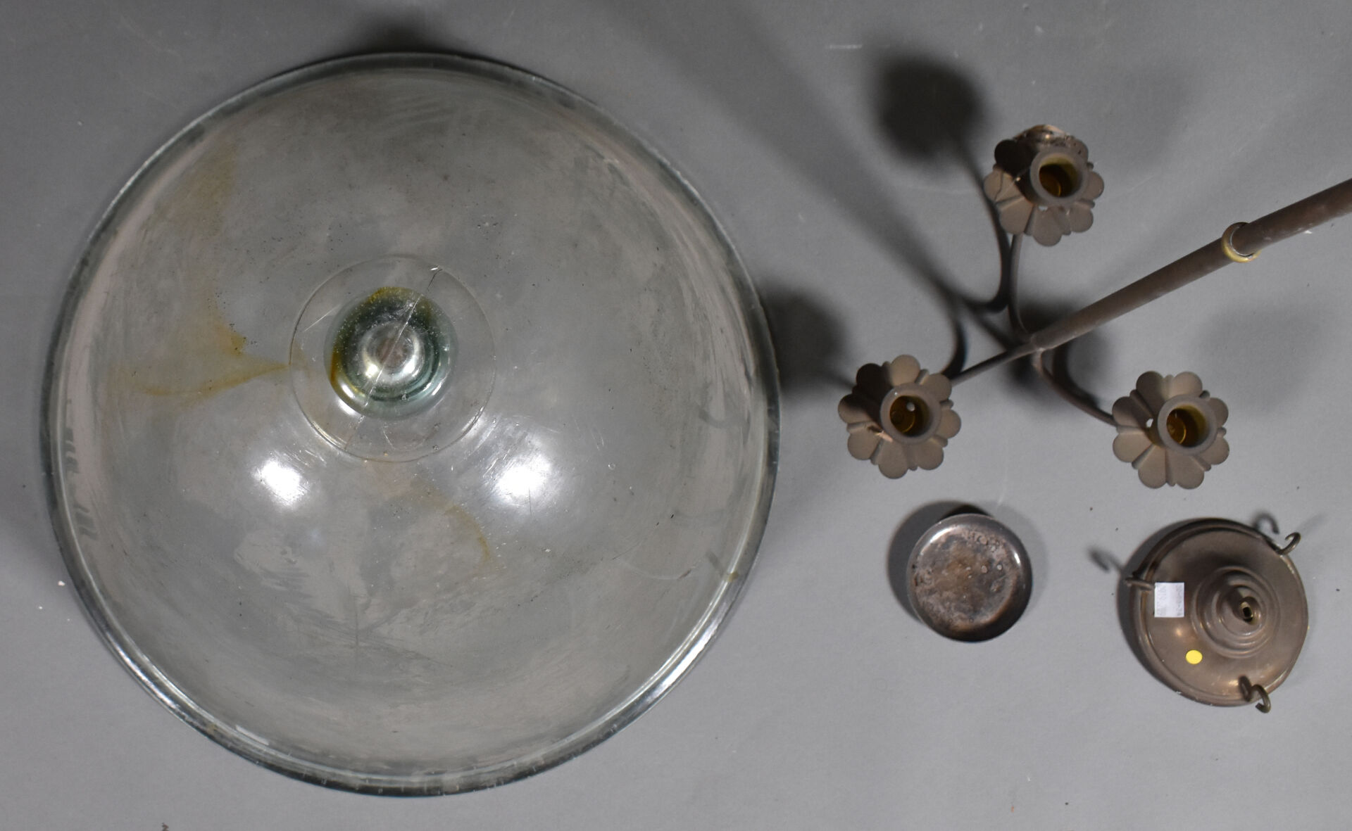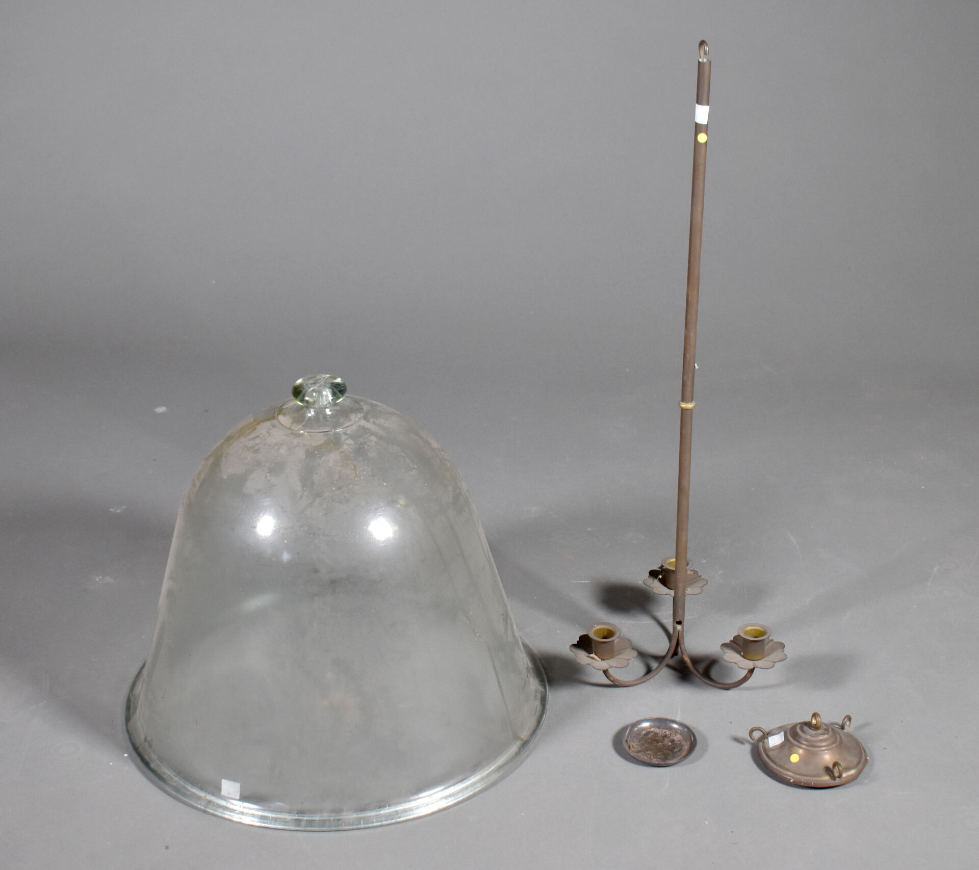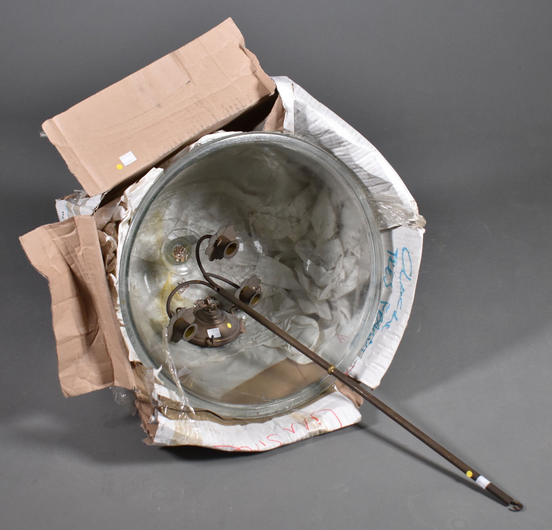 Cloche de lanterne de château en verre, avec son bras de lumière (manque l’anneau et les chaînes de portage. Haut de la cloche. : 40 cm – Diam. : Diam. : 44 cm.