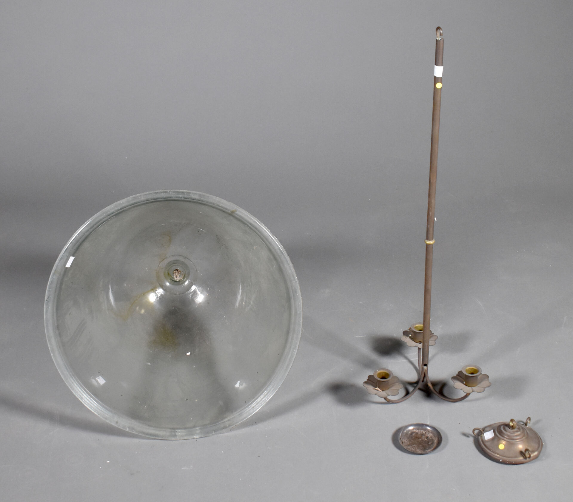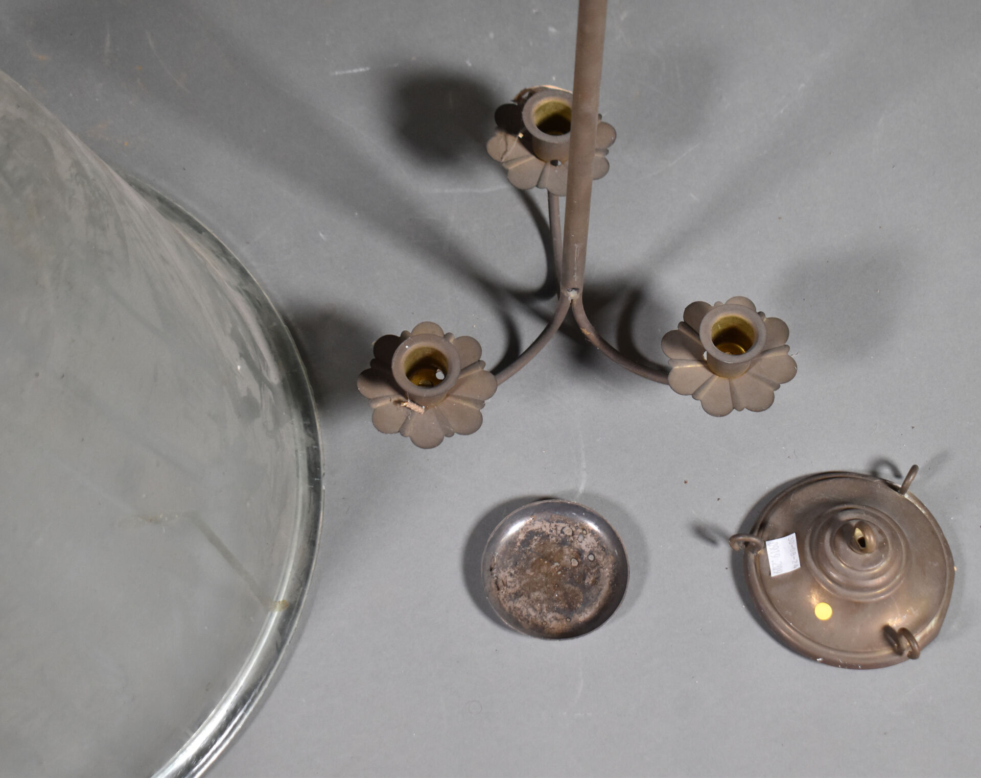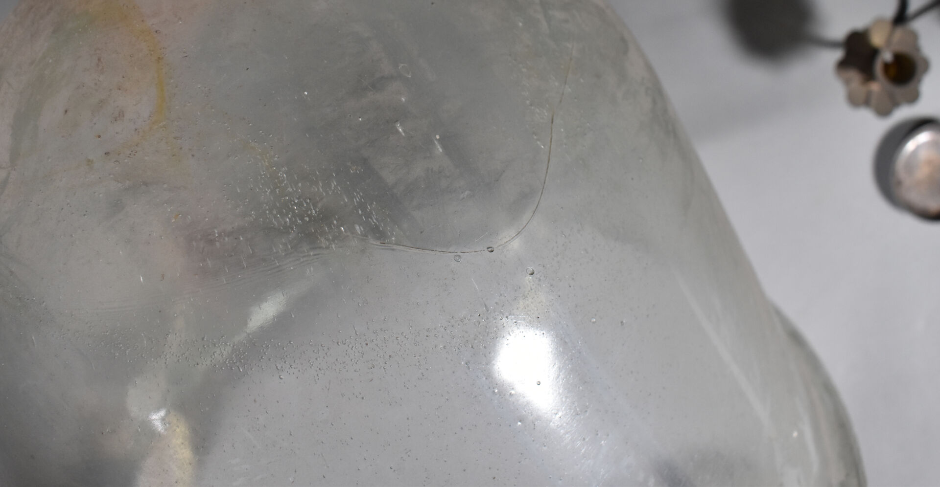 Cloche de lanterne de château en verre, avec son bras de lumière (manque l’anneau et les chaînes de portage. Haut de la cloche. : 40 cm – Diam. : Diam. : 44 cm.