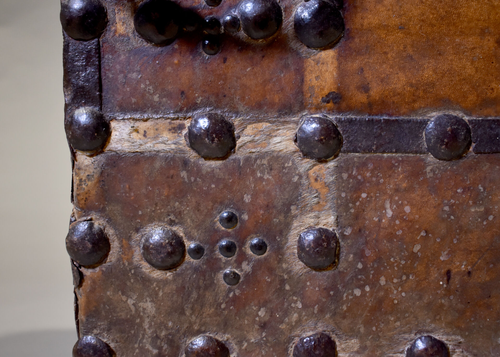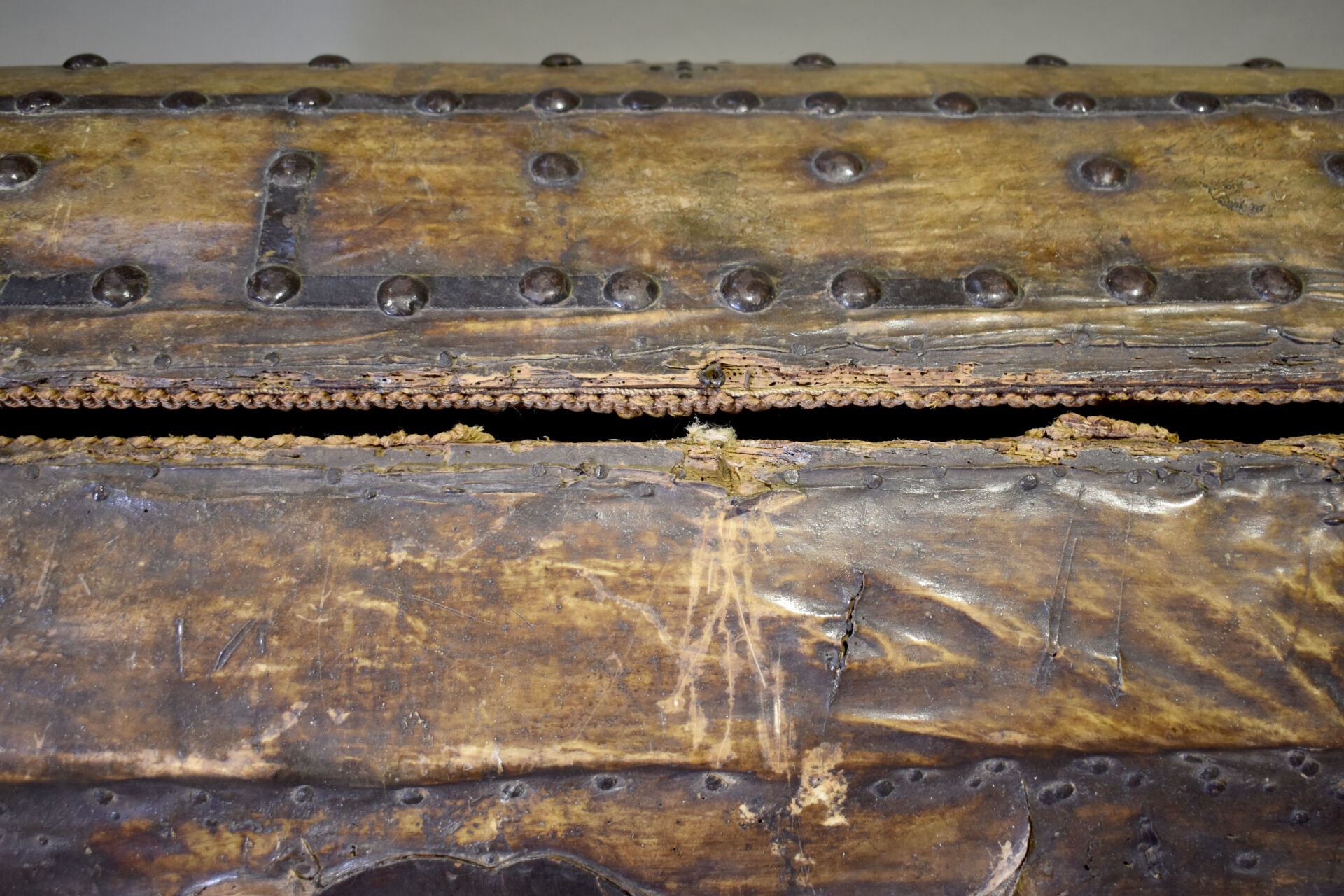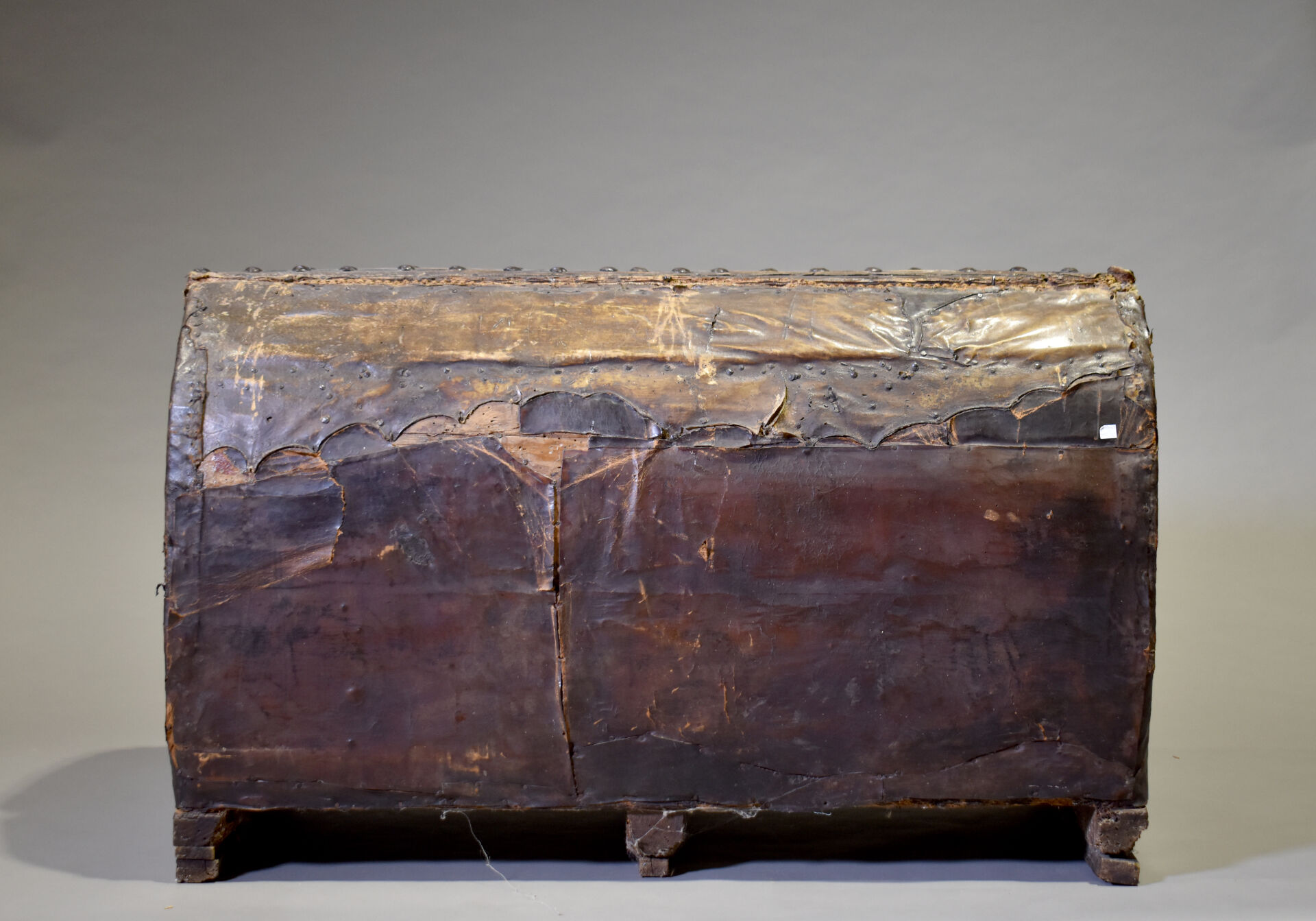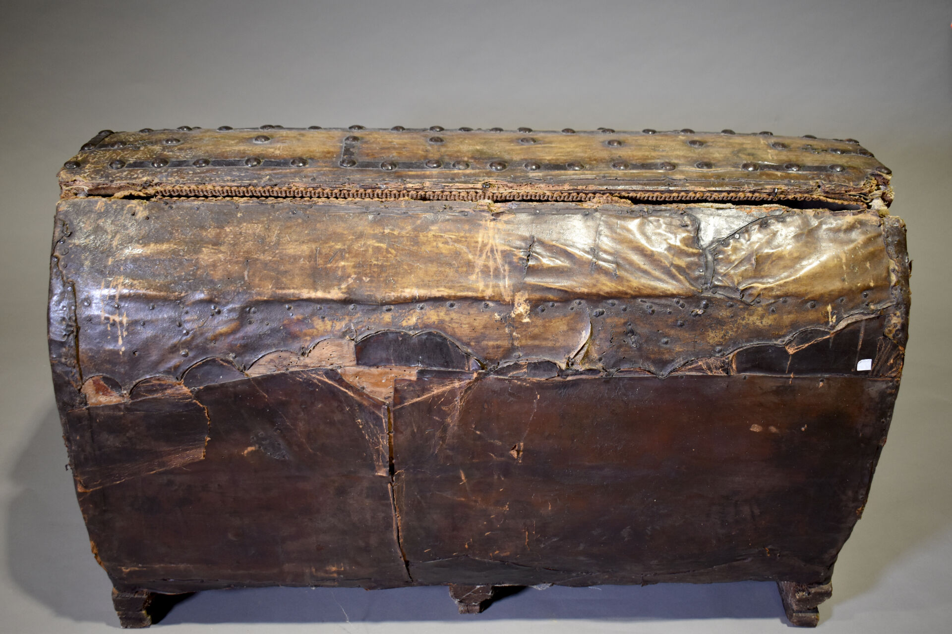 Coffre à couvercle bombé à âme en bois foncé de cuir à décor de clous, à poignées latérales ( accidents, fentes, manques, traces d’insectes xylophages, réparations ). XVIIIe siècle. Haut. : 77 cm – Larg. : 125 cm – Prof. : 58 cm.