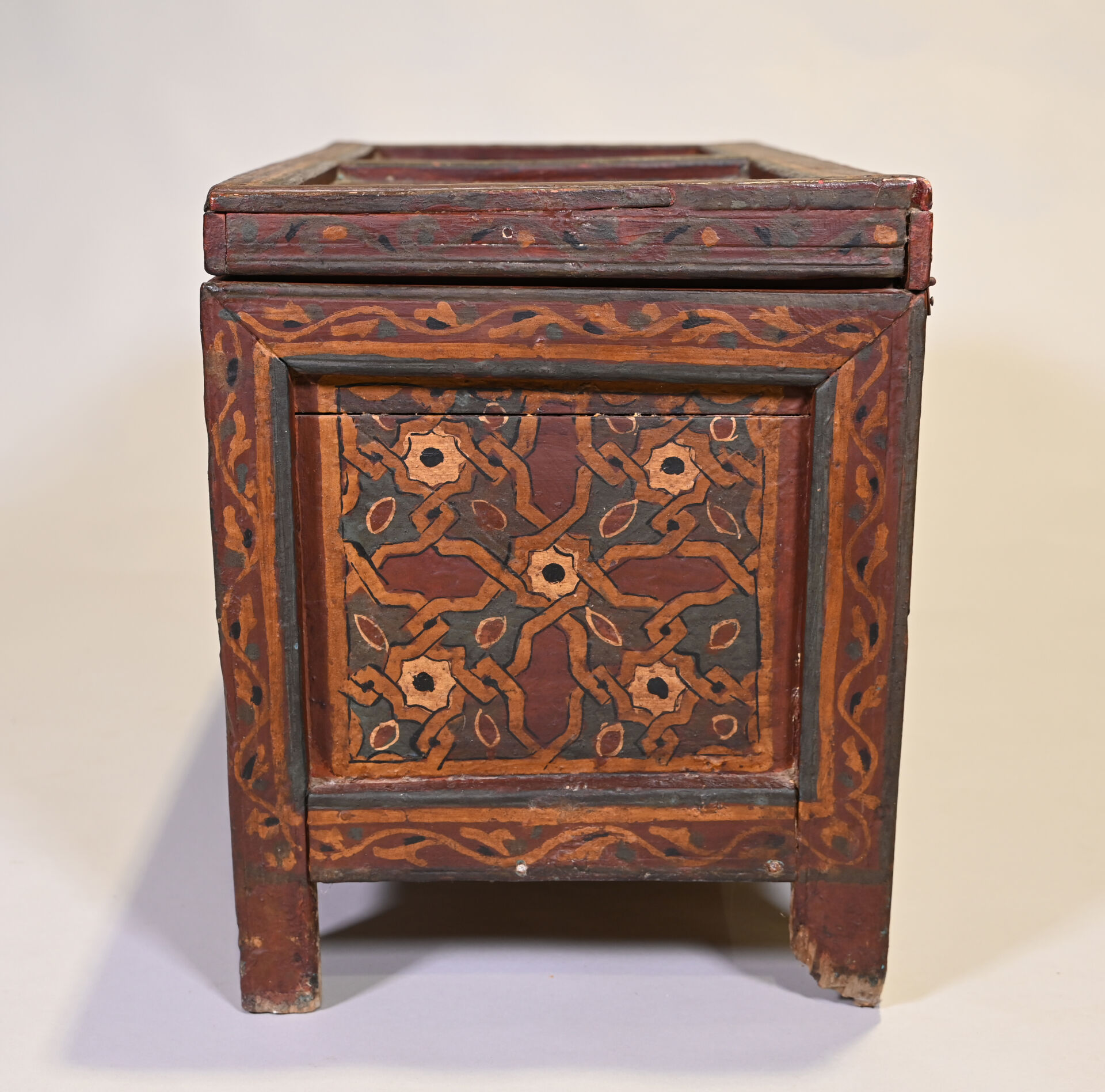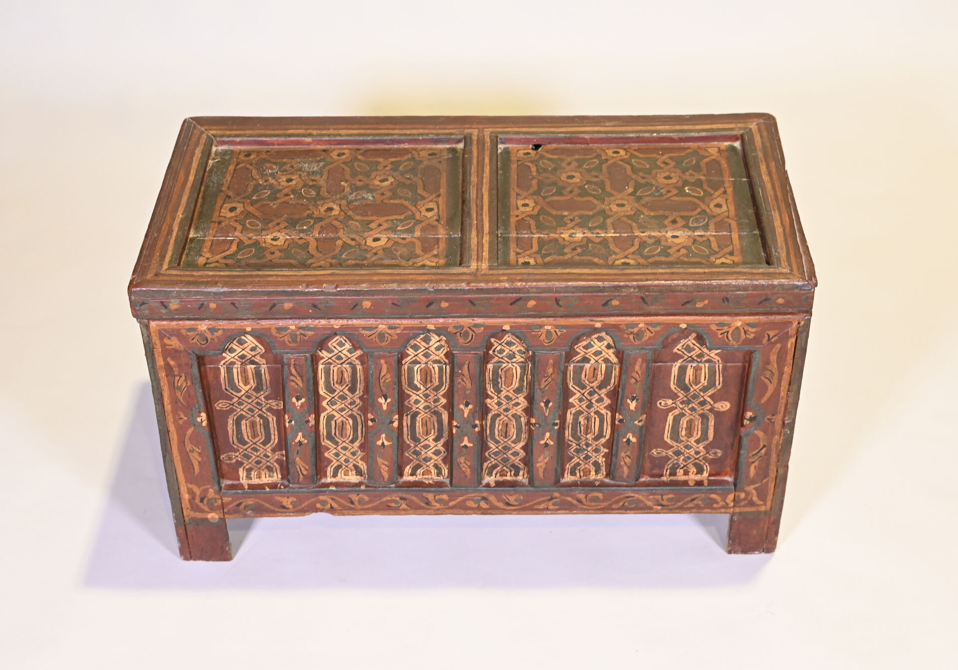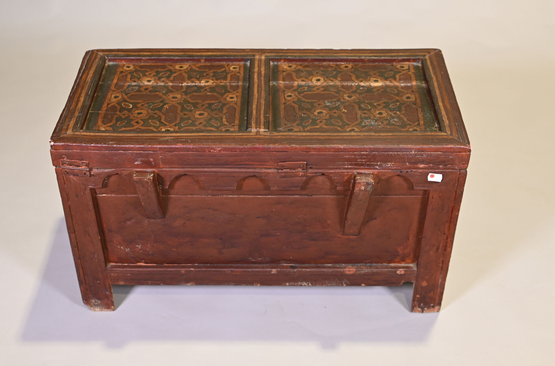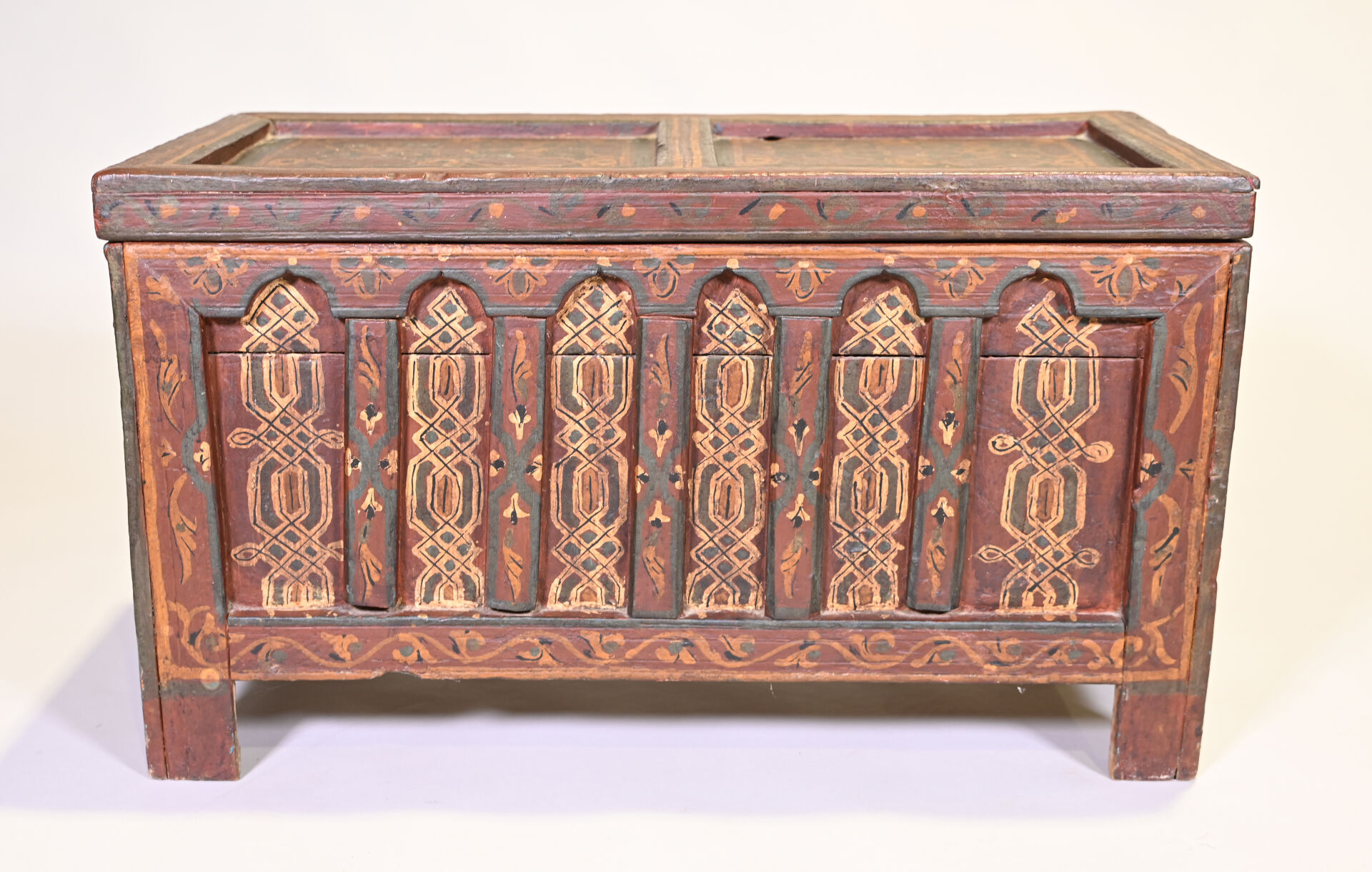 Coffre en bois (cèdre ?) peint à décors géométriques. Afrique du Nord, probablement Maroc. Haut. : 44,5 cm – Larg. : 77,5 cm – Prof. : 41 cm.