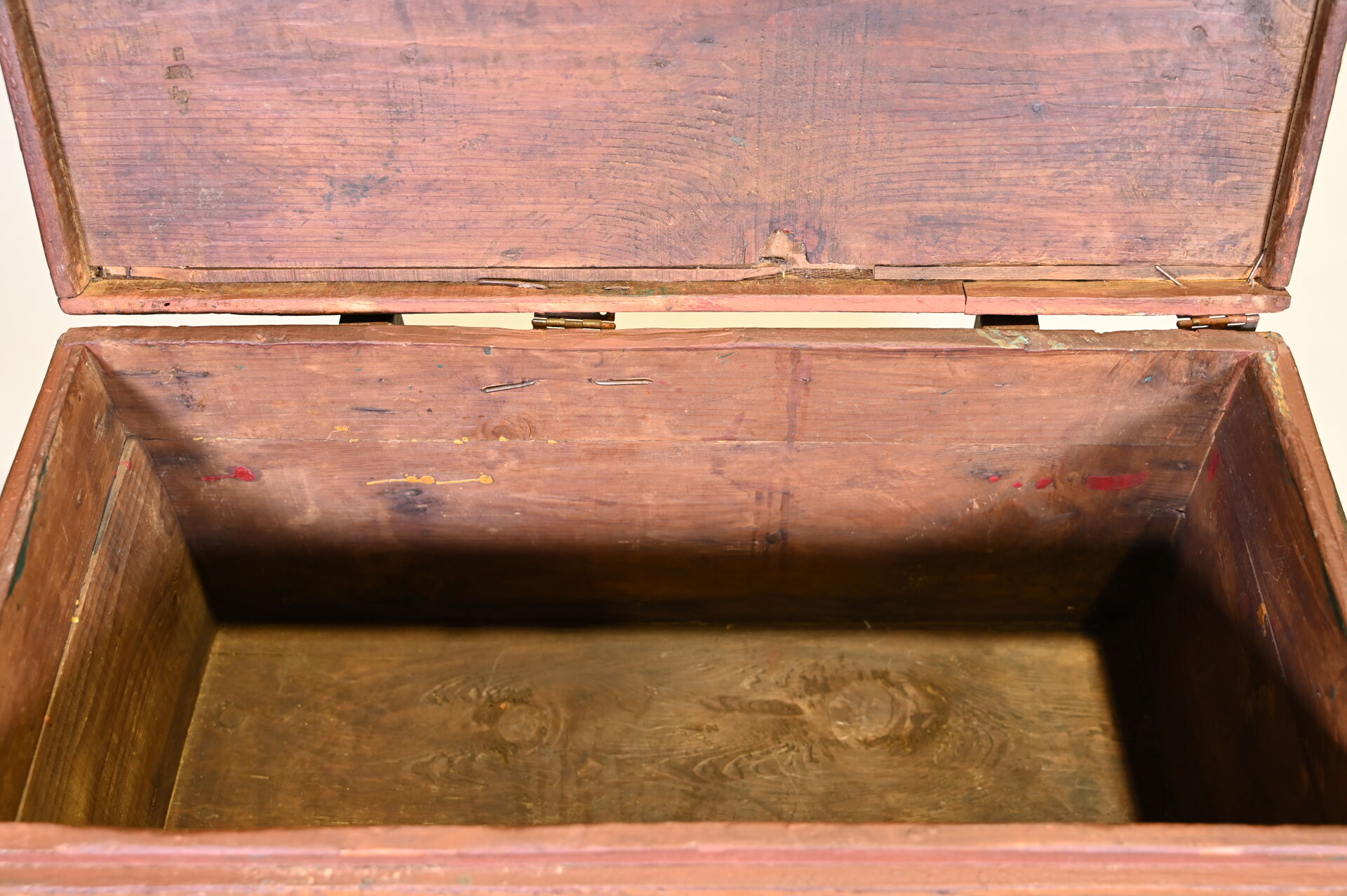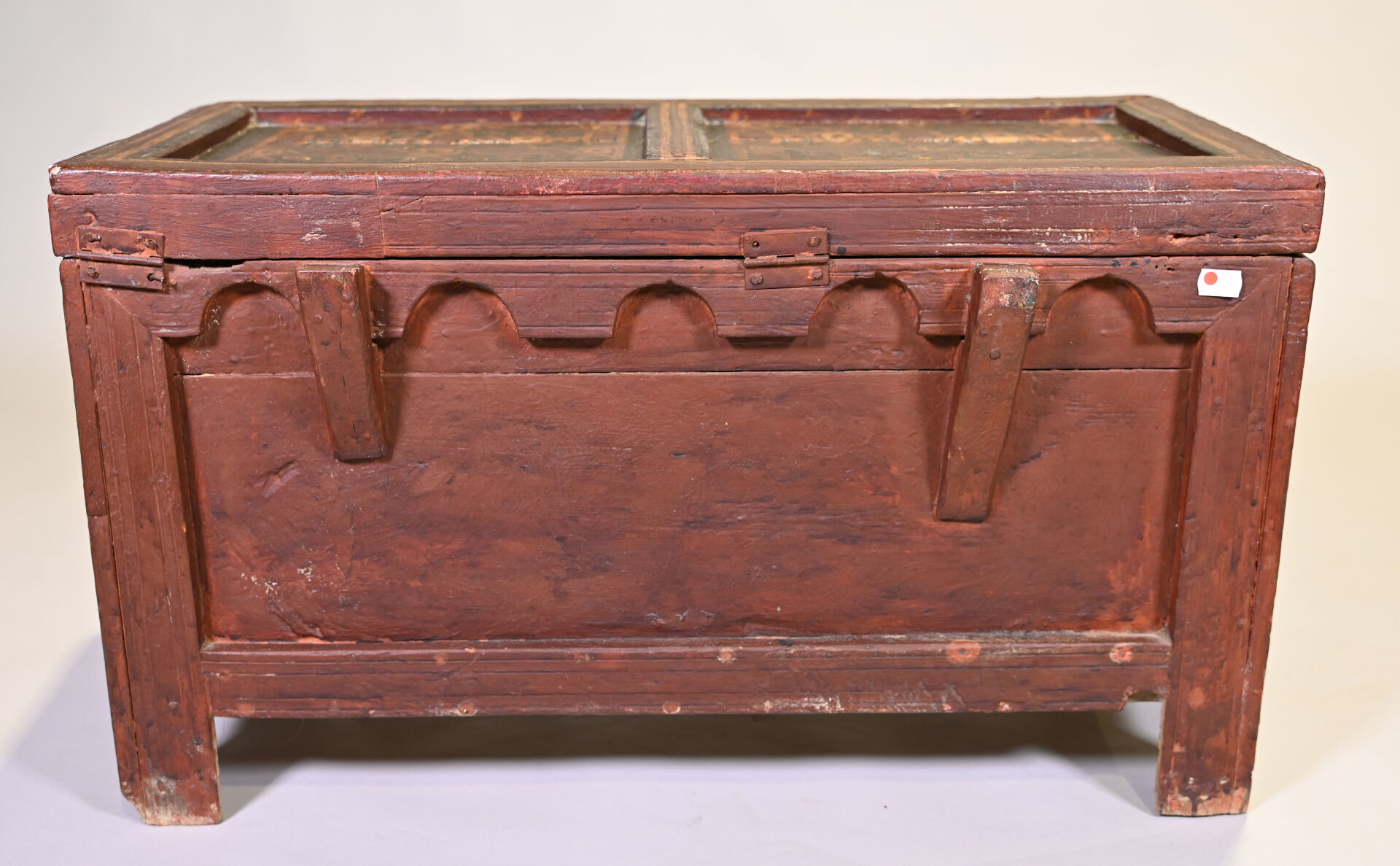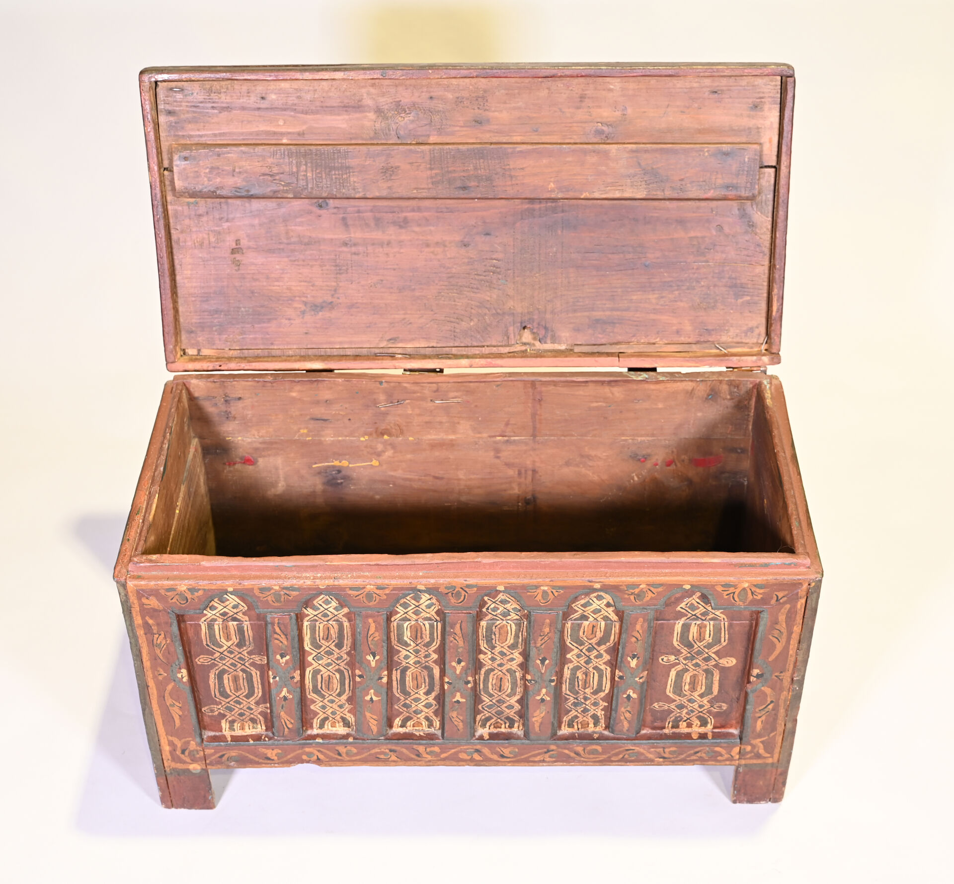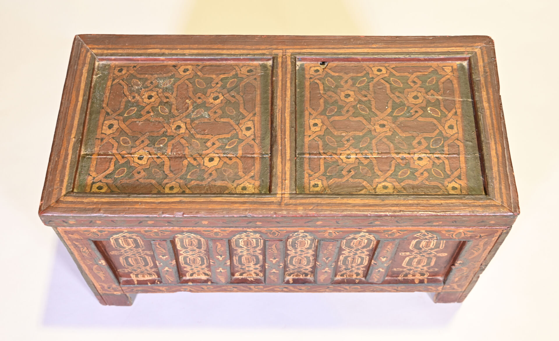 Coffre en bois (cèdre ?) peint à décors géométriques. Afrique du Nord, probablement Maroc. Haut. : 44,5 cm – Larg. : 77,5 cm – Prof. : 41 cm.