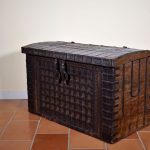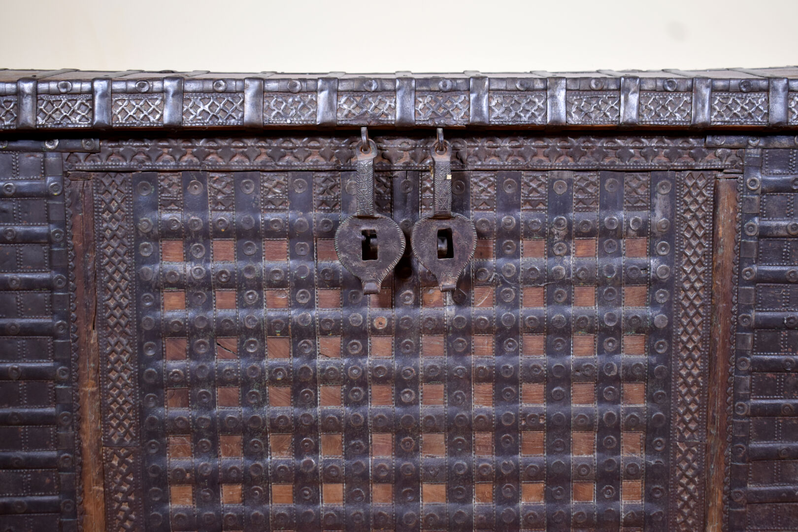 Coffre en bois exotique à décor de plaques de métal martelé. Inde ? Haut. : 70 cm – Larg. : 114 cm – Prof. : 60 cm.