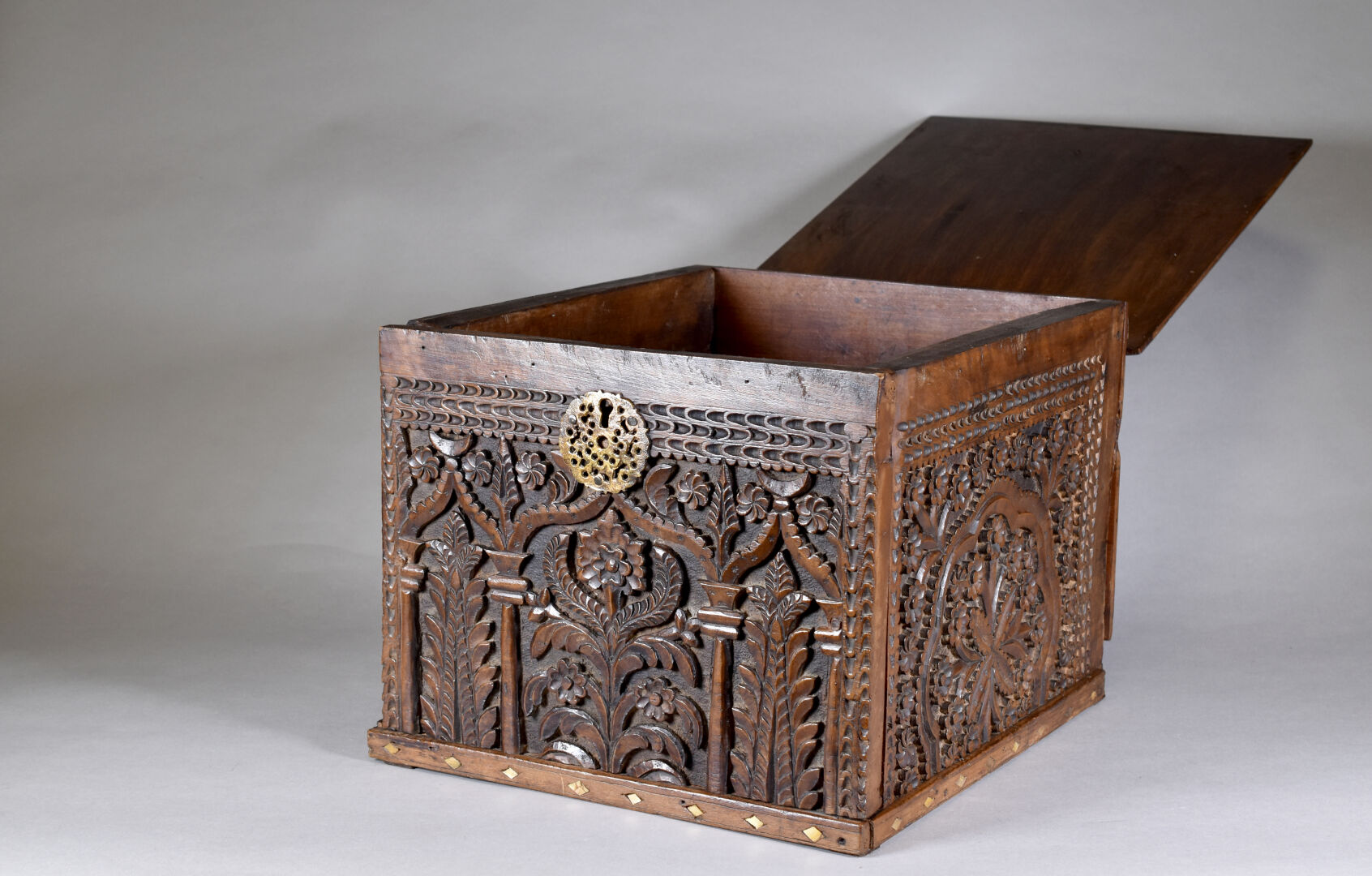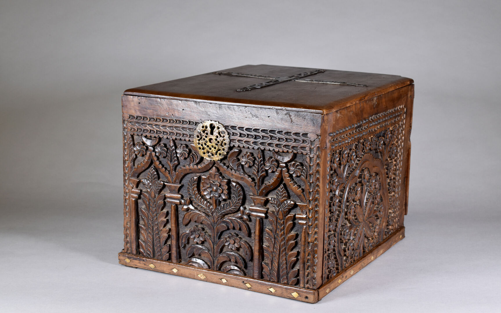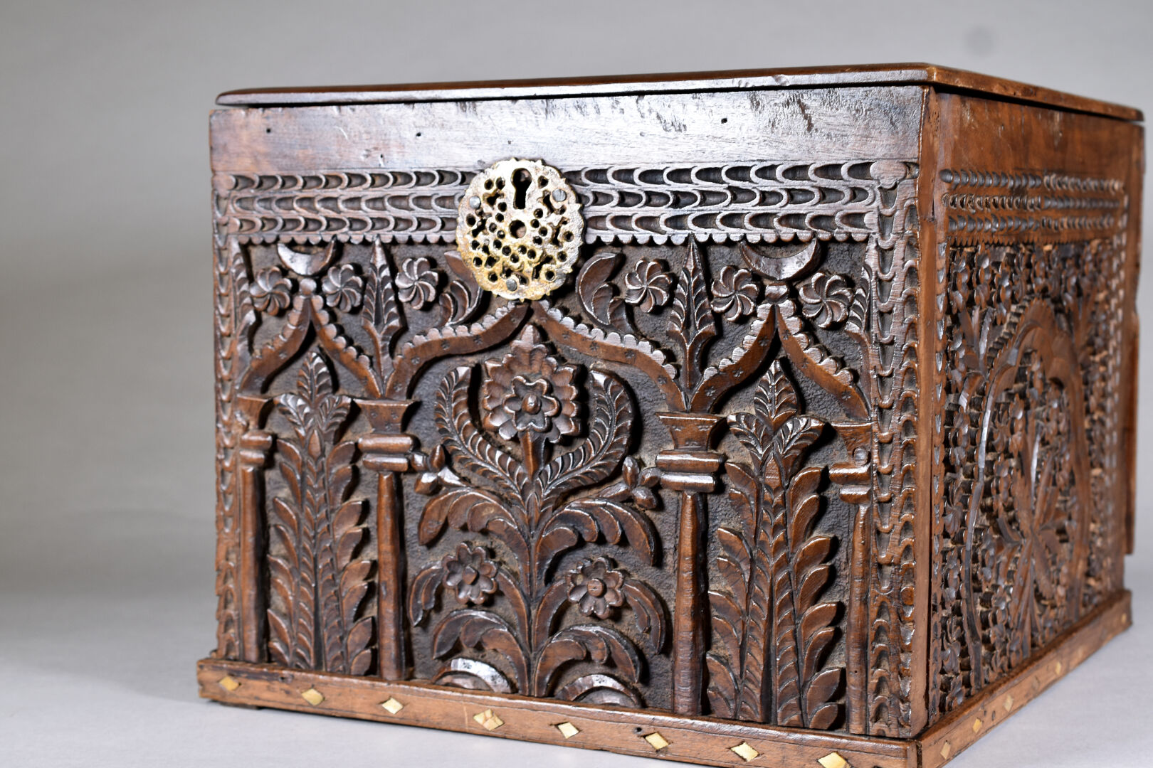 Coffre en bois sculpté à décor de fleurs, jardins et mirhab. Perse ou Afrique du Nord. Haut. : 32 cm – Larg. : 39 cm – Prof. : 45 cm.