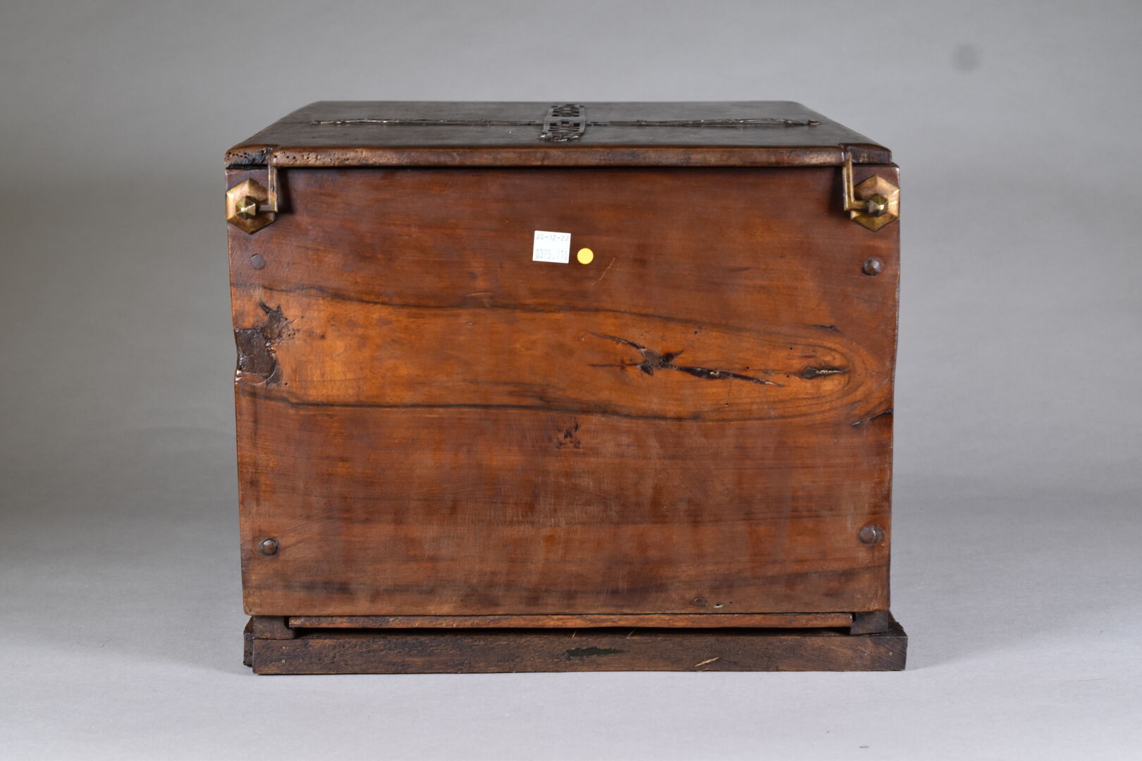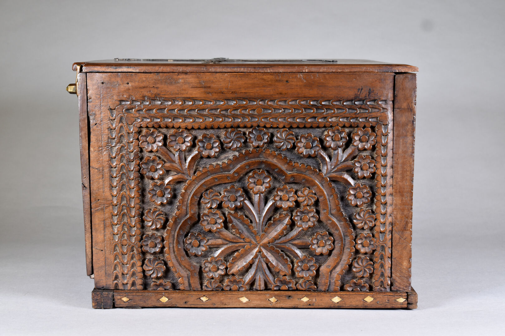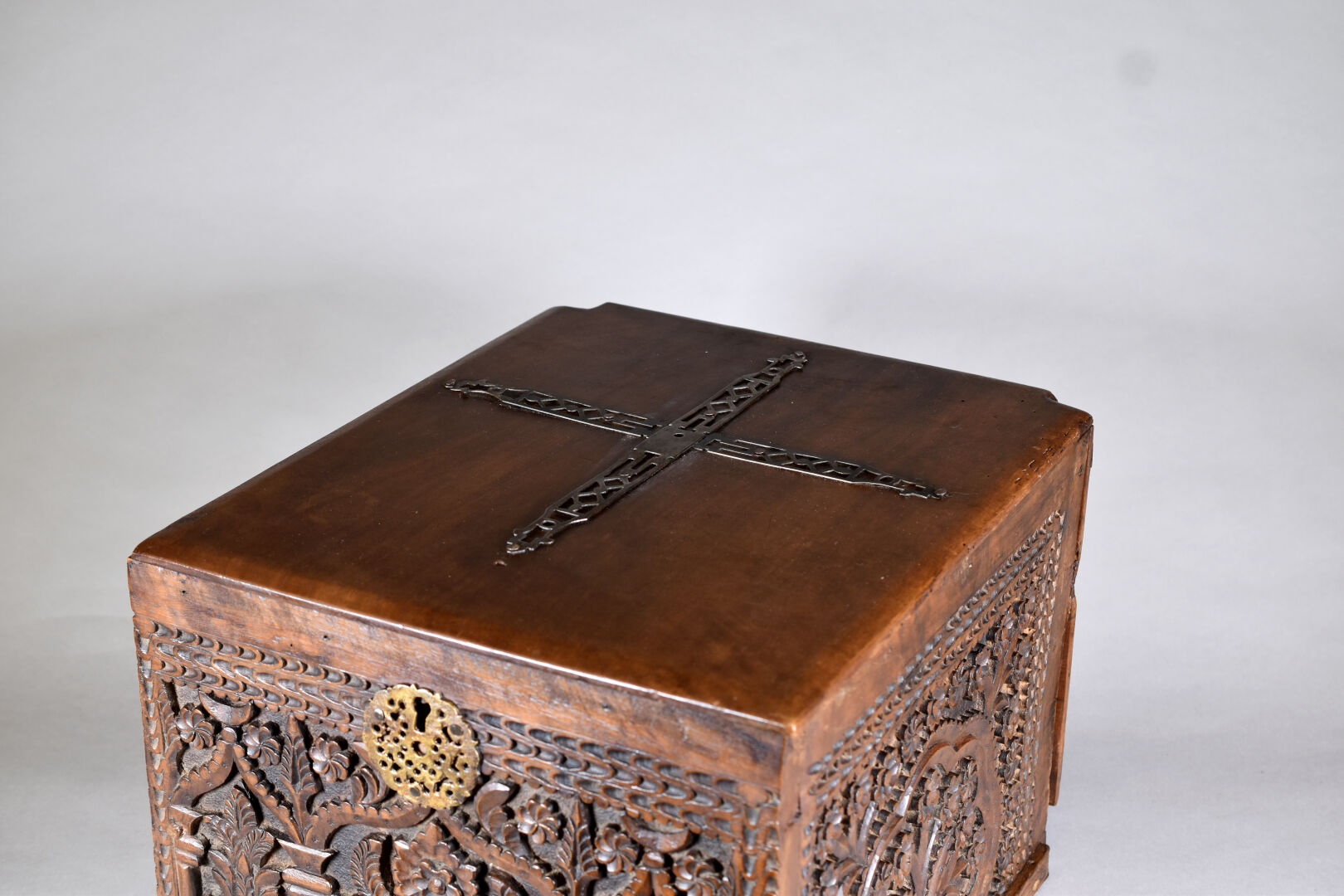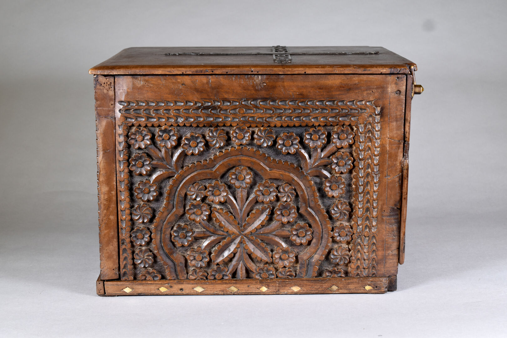 Coffre en bois sculpté à décor de fleurs, jardins et mirhab. Perse ou Afrique du Nord. Haut. : 32 cm – Larg. : 39 cm – Prof. : 45 cm.
