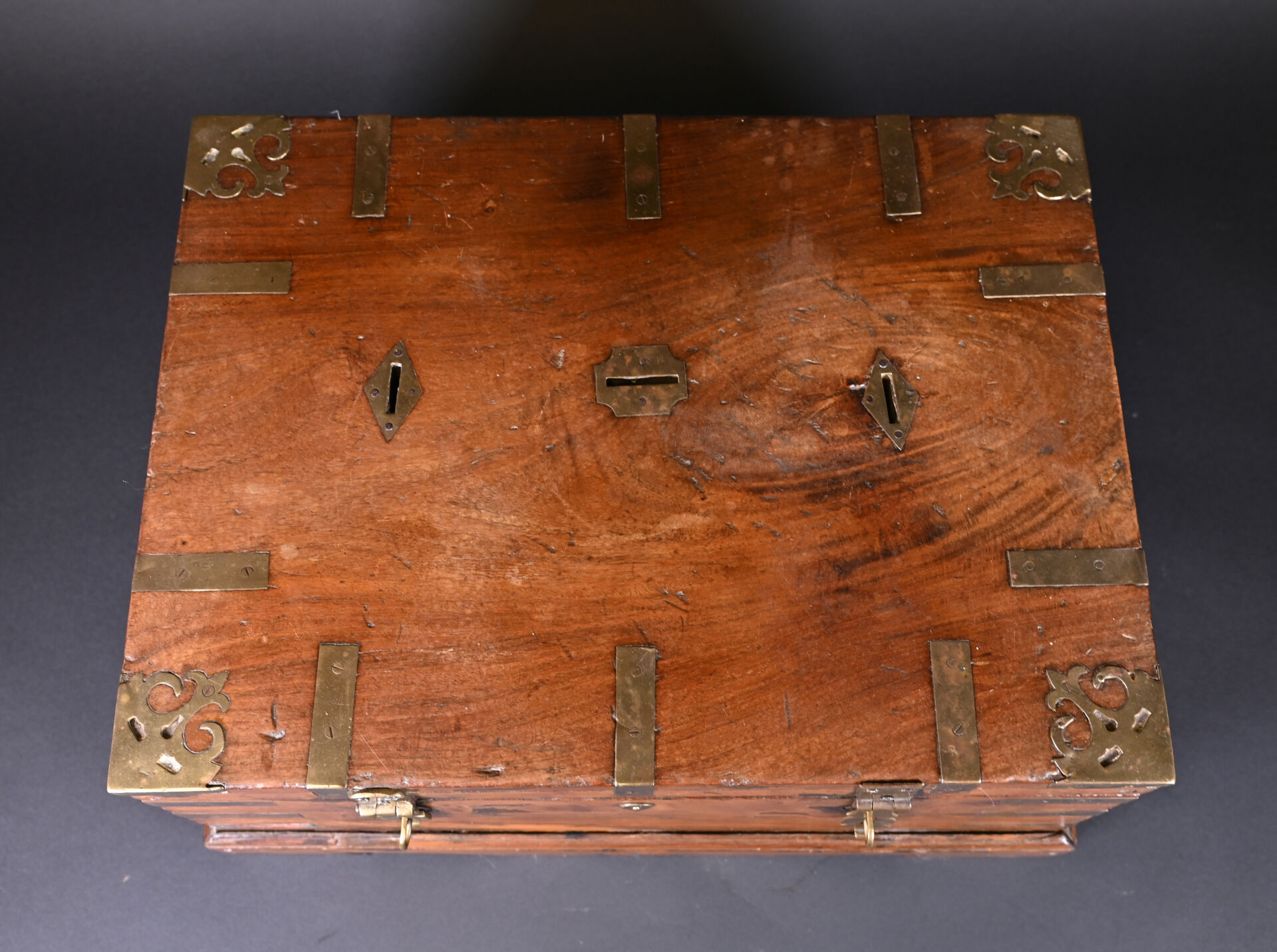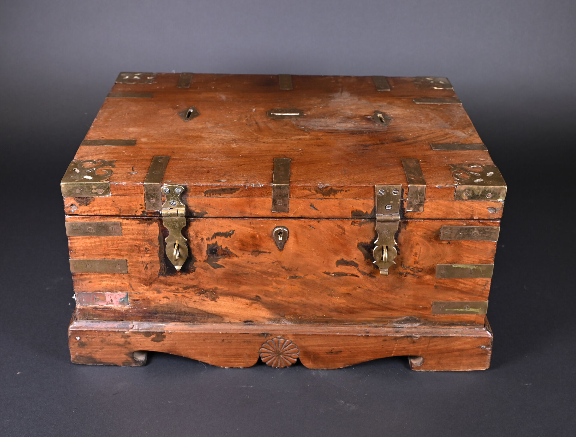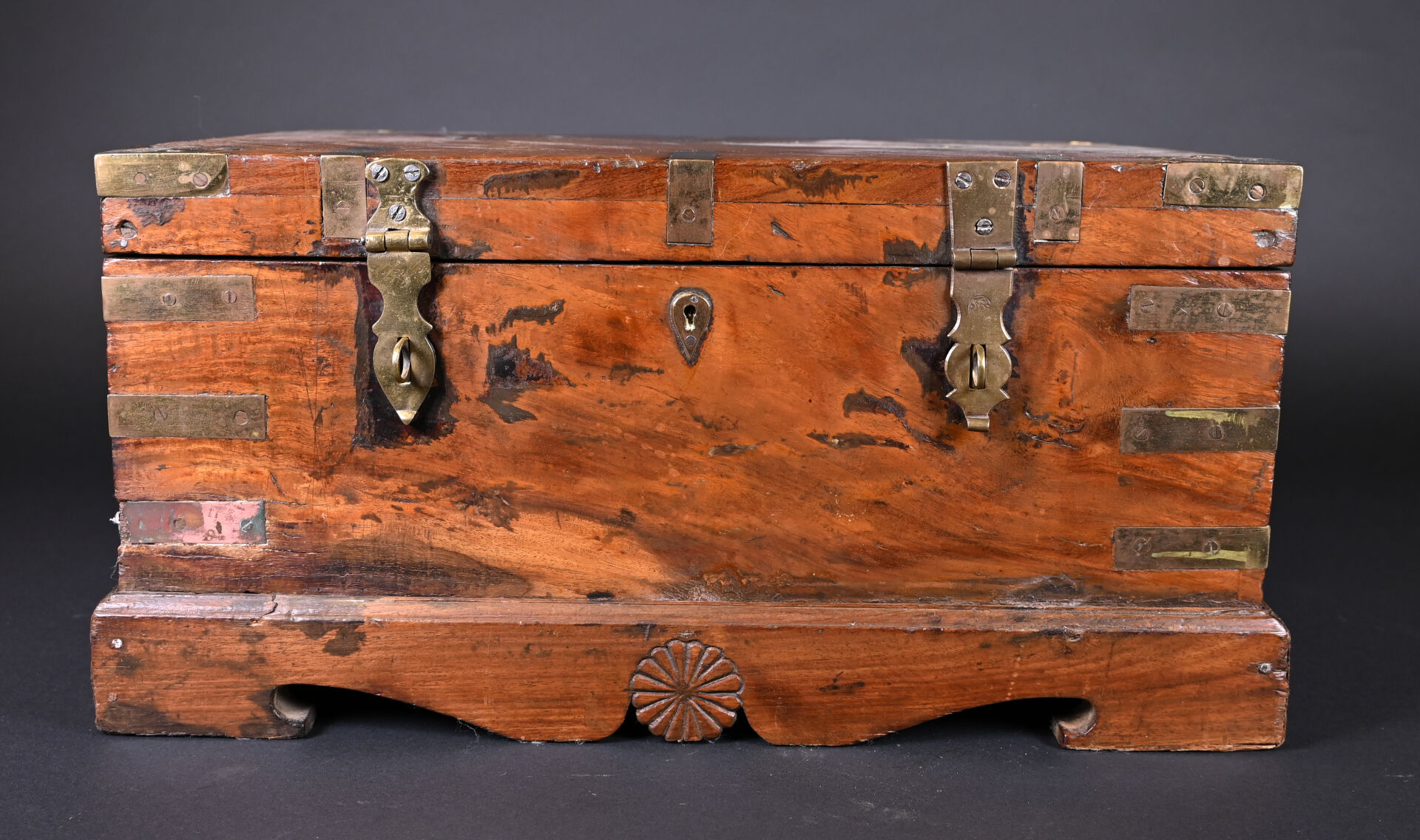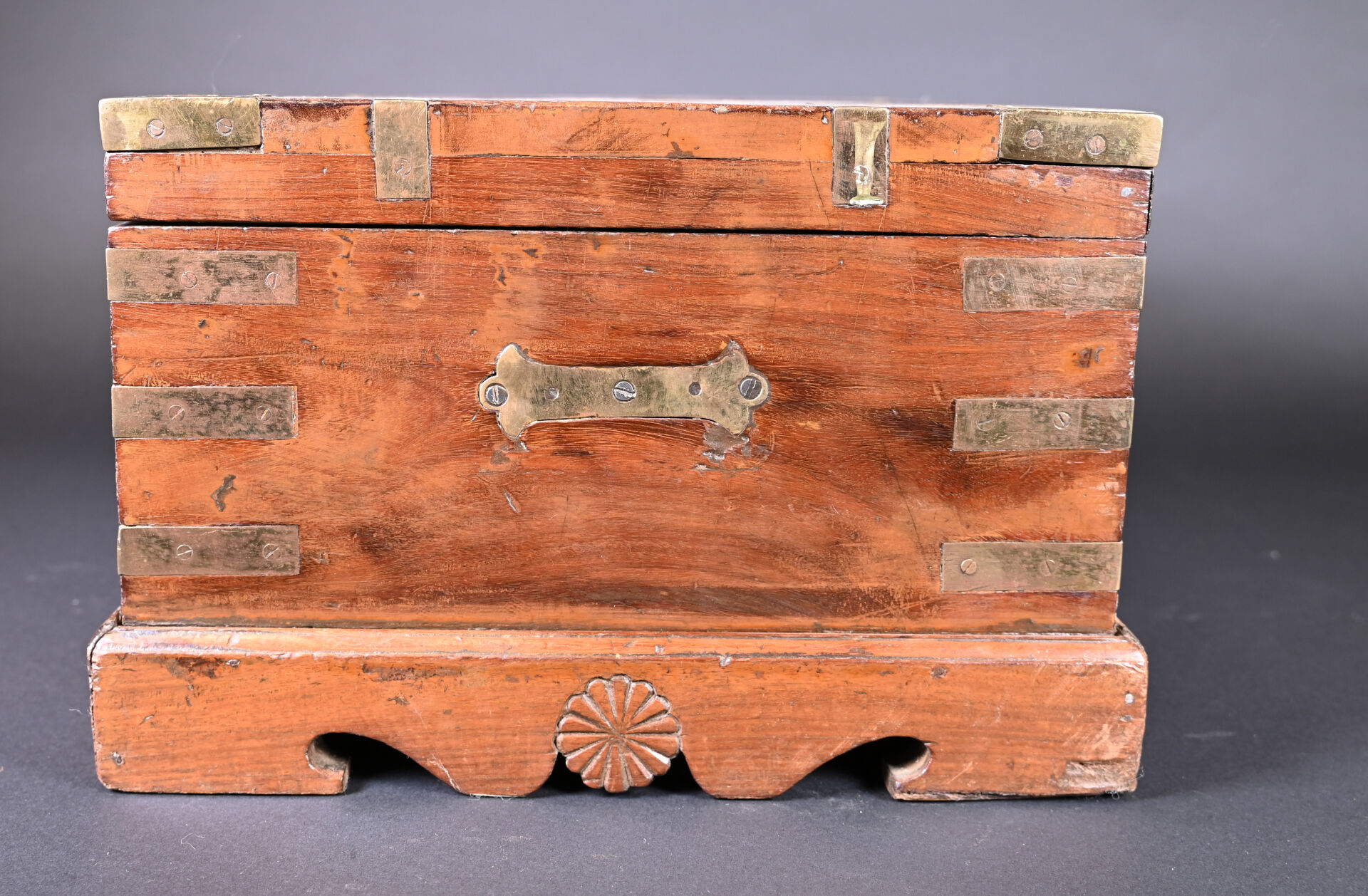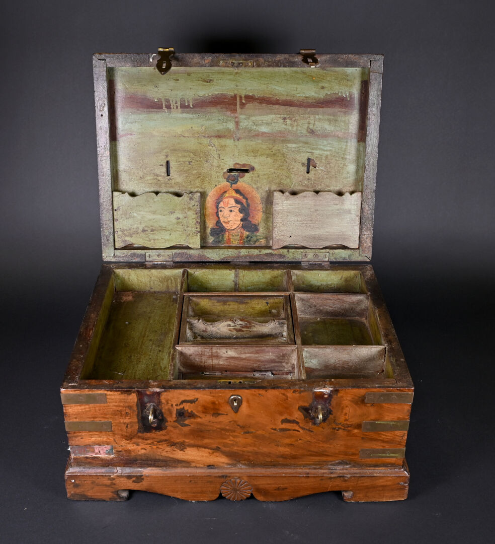 Coffre en bois teinté et acajou à décor de plaques de laiton (manques et usures). L’intérieur peint. Haut. : 25 cm – Larg. : 49 cm – Prof. : 40 cm.