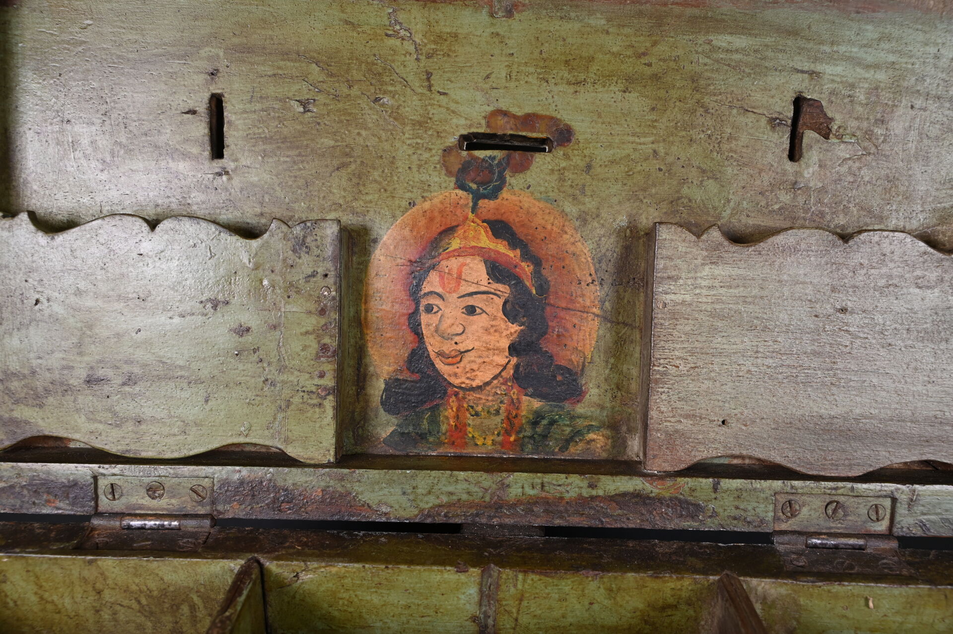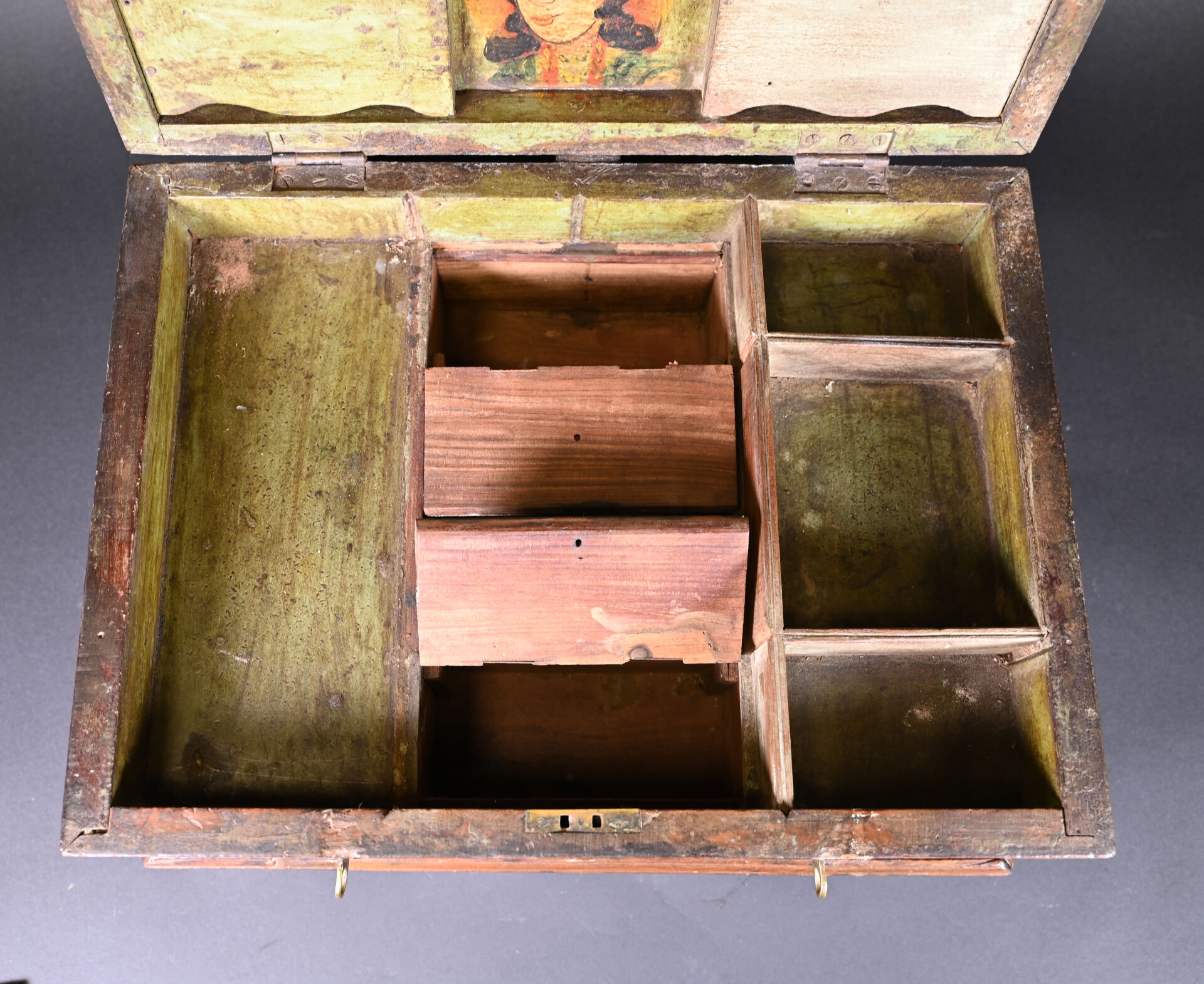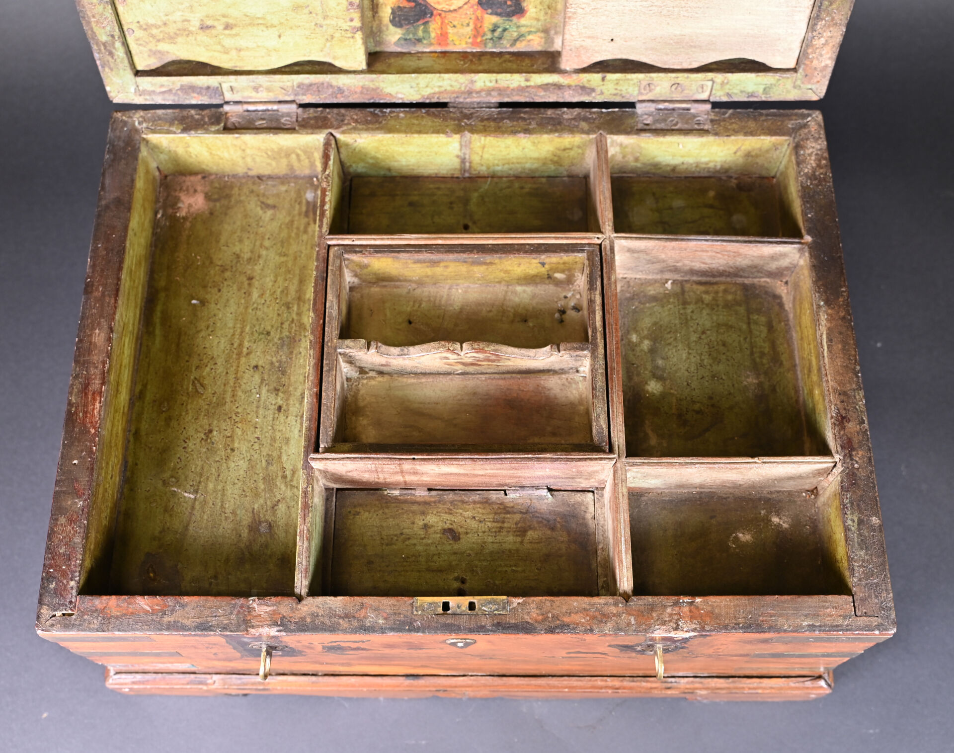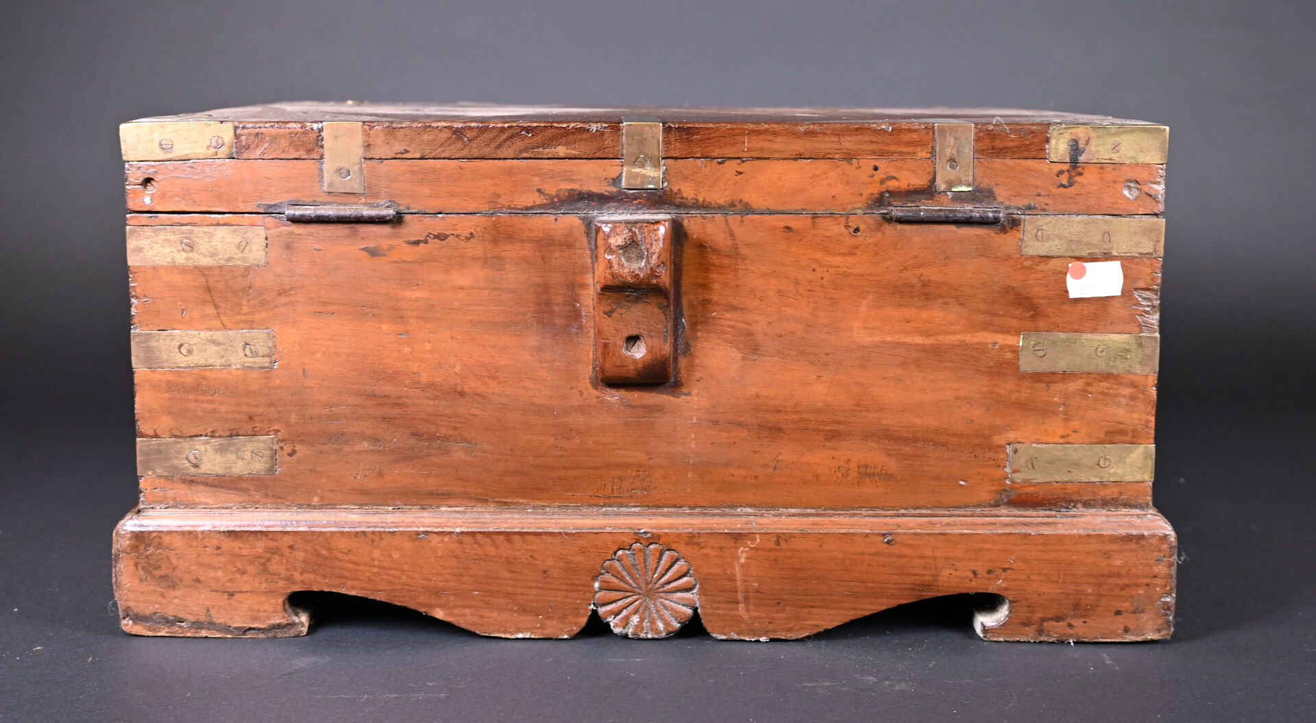 Coffre en bois teinté et acajou à décor de plaques de laiton (manques et usures). L’intérieur peint. Haut. : 25 cm – Larg. : 49 cm – Prof. : 40 cm.