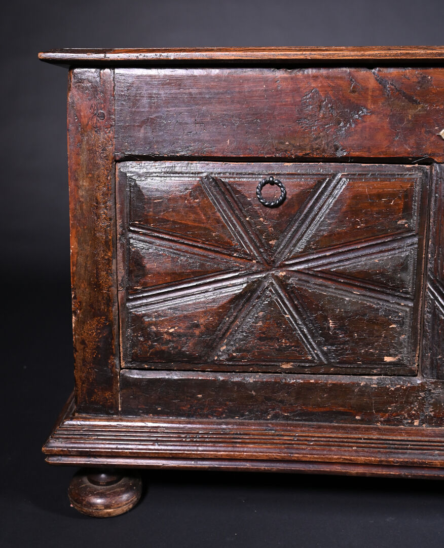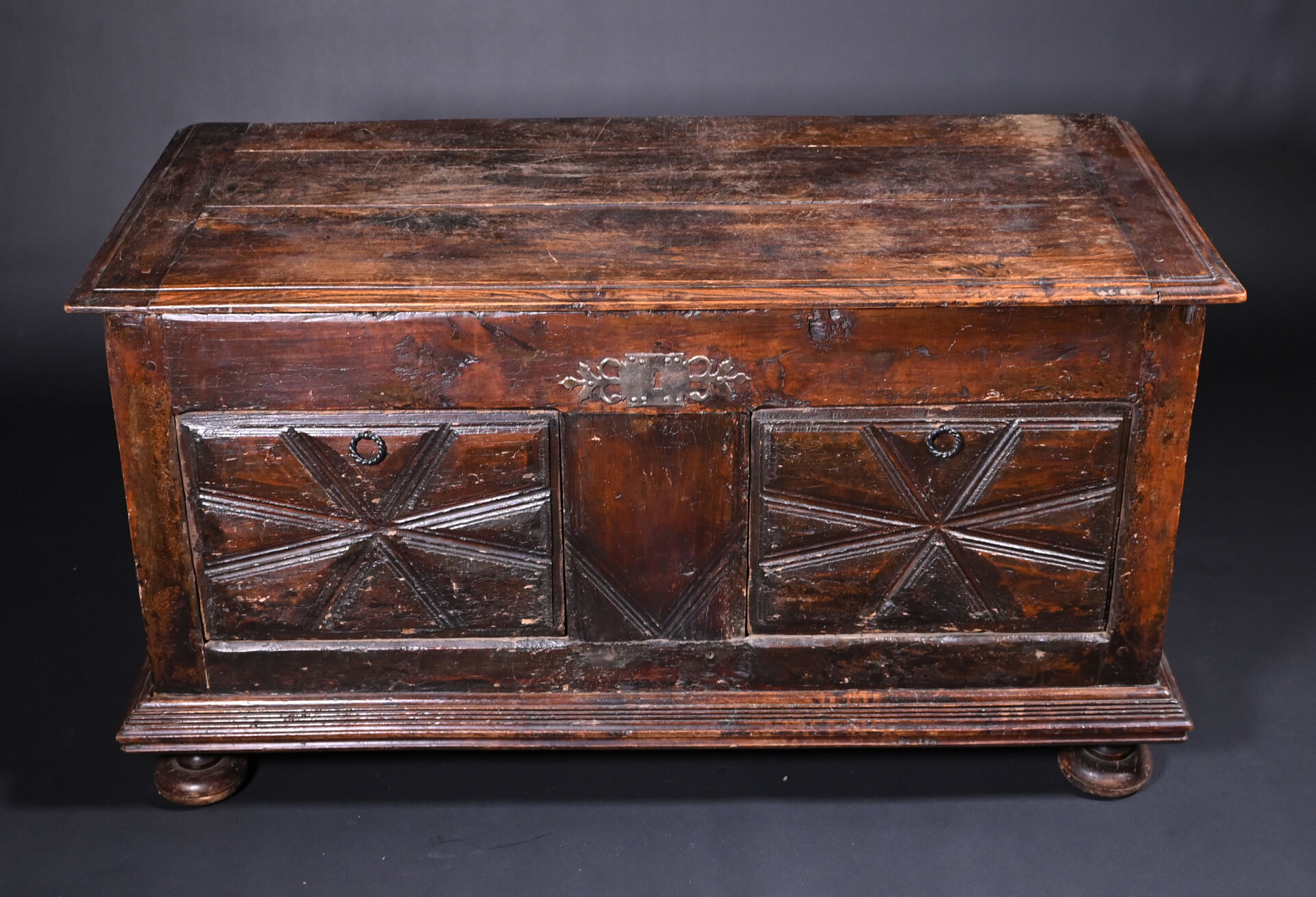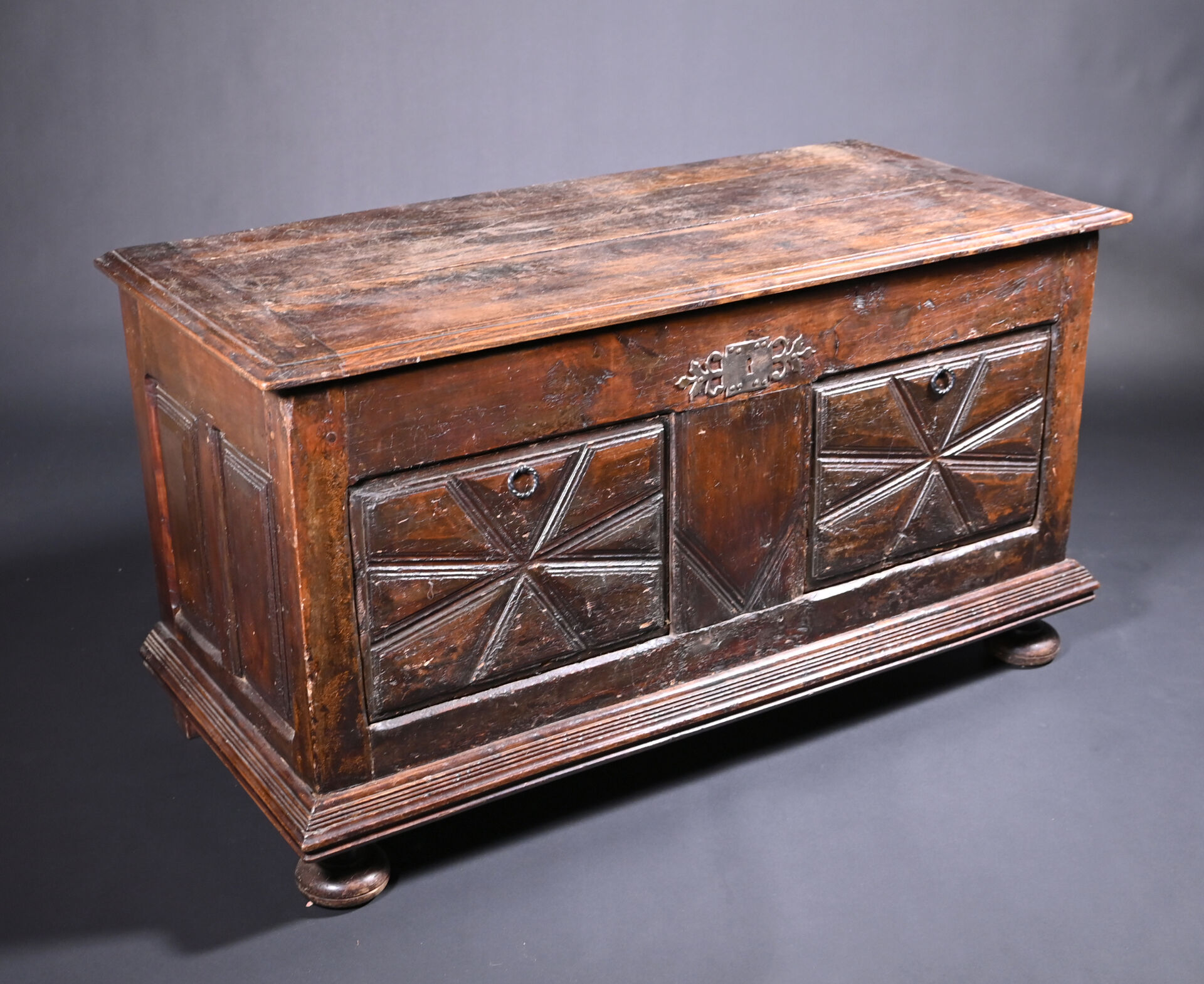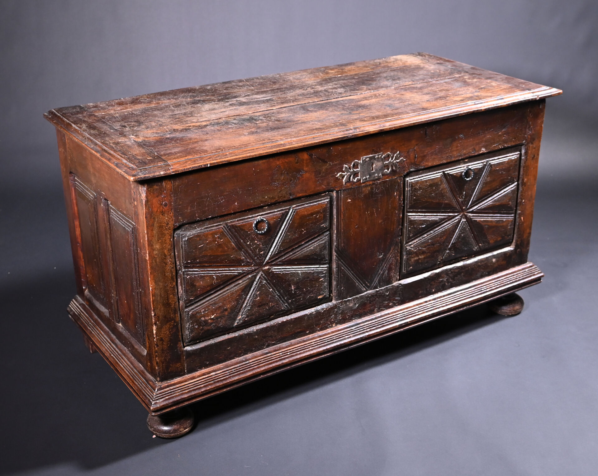 Coffre en chêne mouluré à décor de croix de Malte, l’abattant découvrant un intérieur aménagé, plinthe droite à pieds antérieurs en boule aplatie. Anneaux en fer forgé en façade. En partie du XVIIe siècle. 70 x 128 x 57 cm.