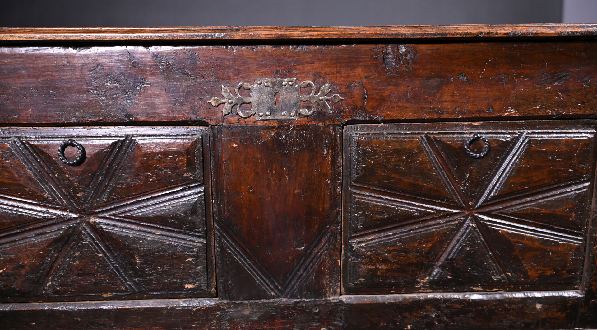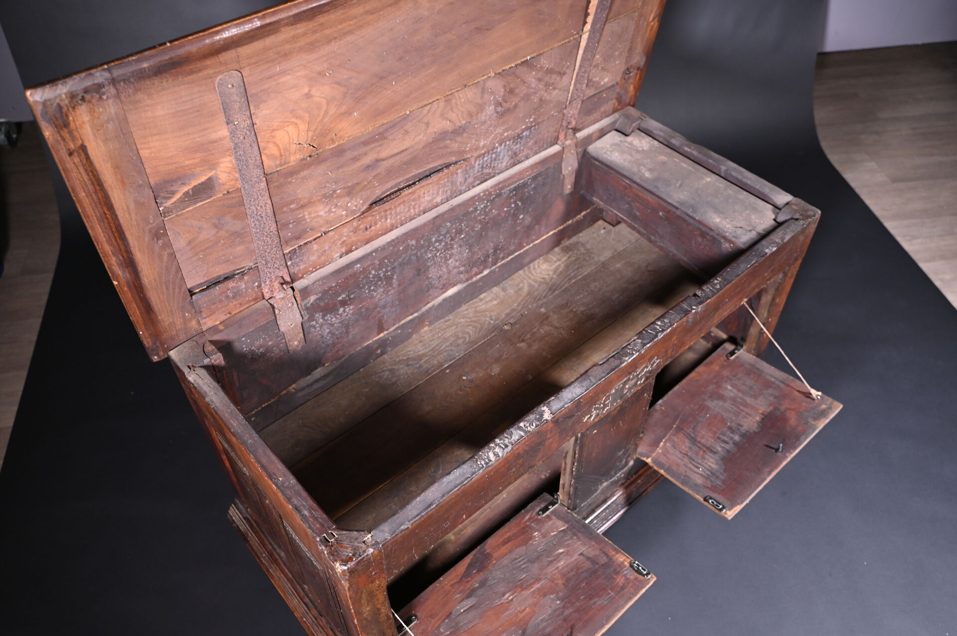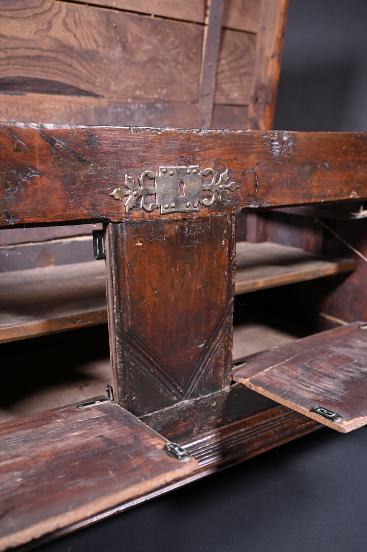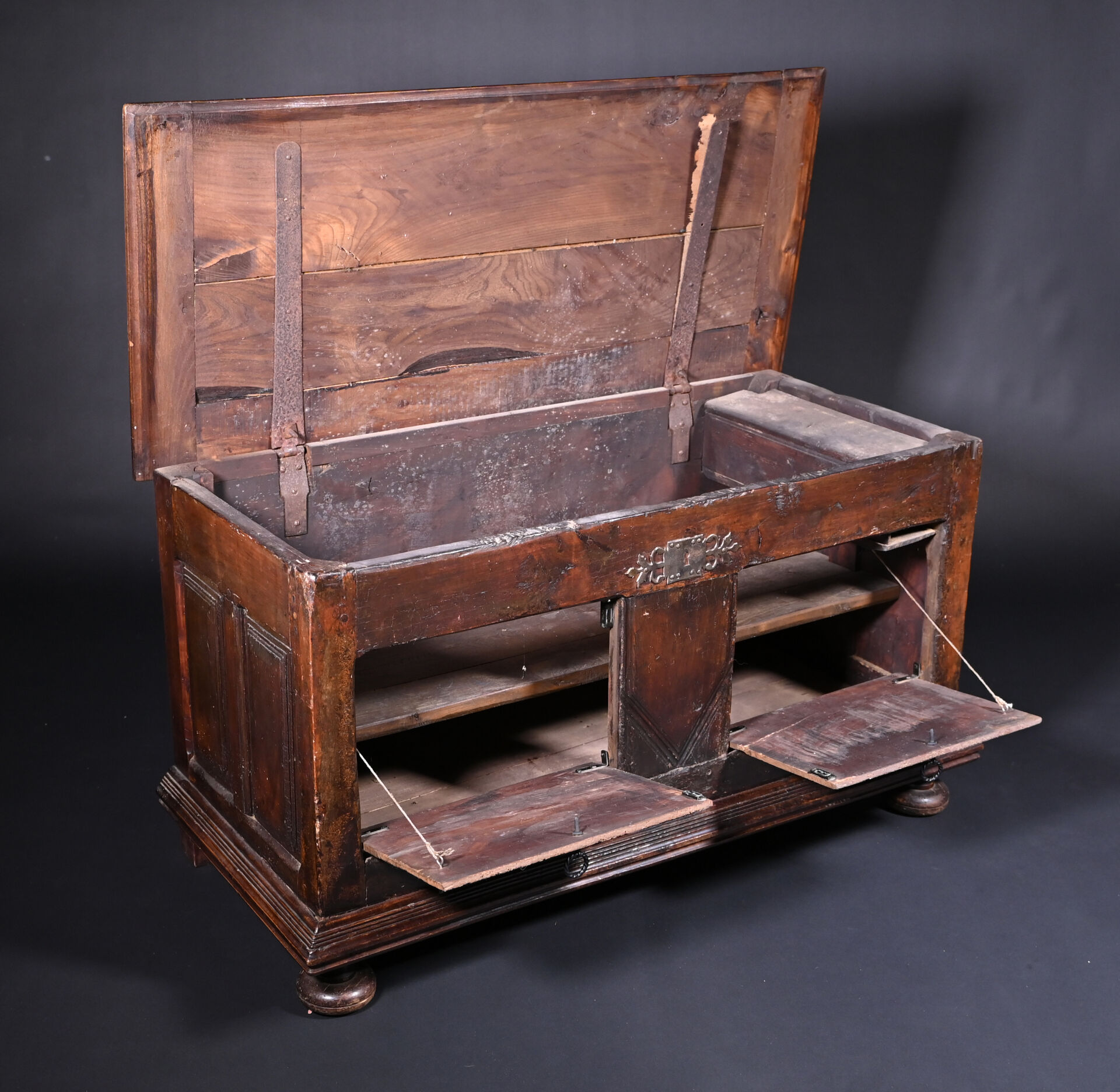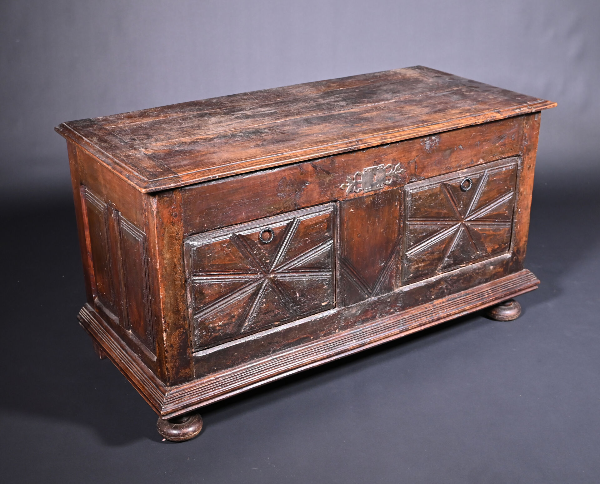 Coffre en chêne mouluré à décor de croix de Malte, l’abattant découvrant un intérieur aménagé, plinthe droite à pieds antérieurs en boule aplatie. Anneaux en fer forgé en façade. En partie du XVIIe siècle. 70 x 128 x 57 cm.