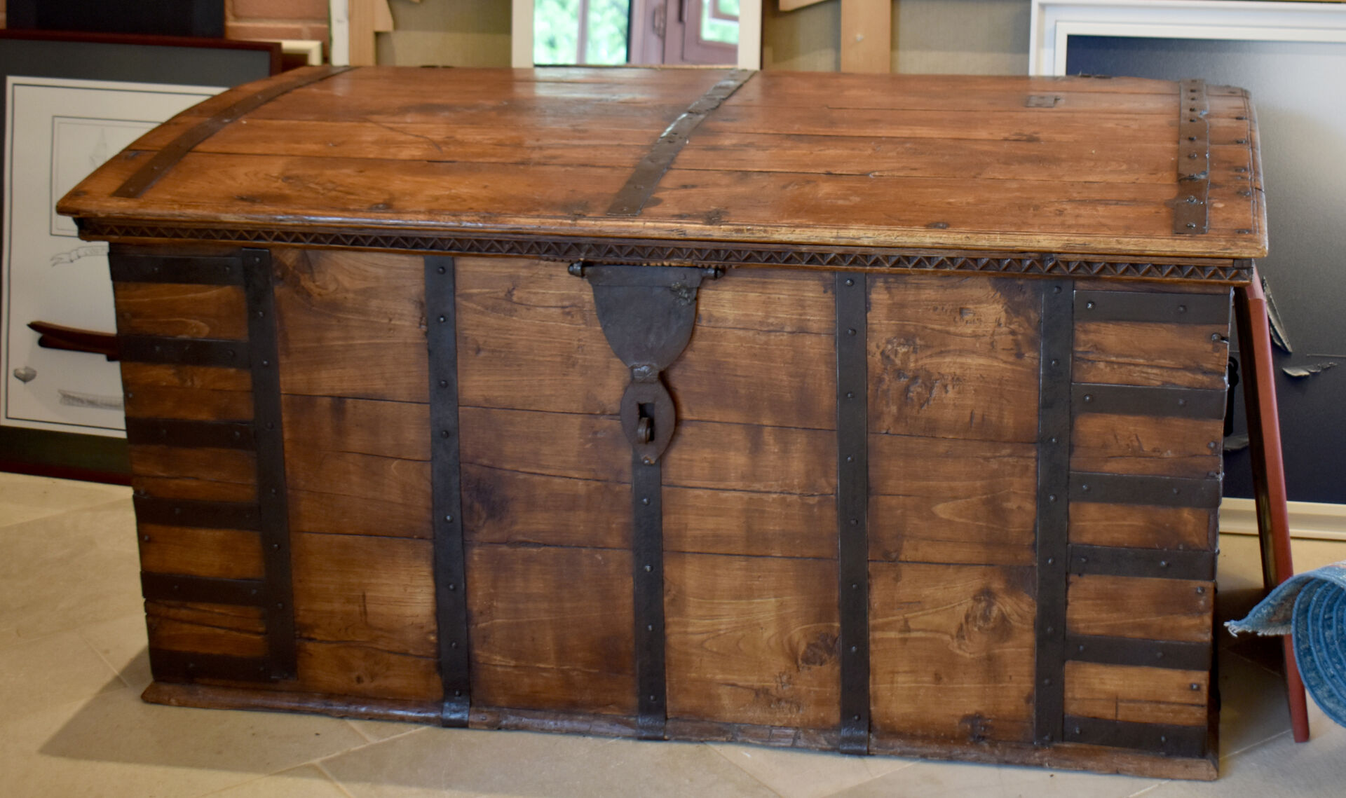 Coffre rustique en bois et métal. Haut. : 75 cm – Larg. : 142 cm – Prof. : 78 cm.