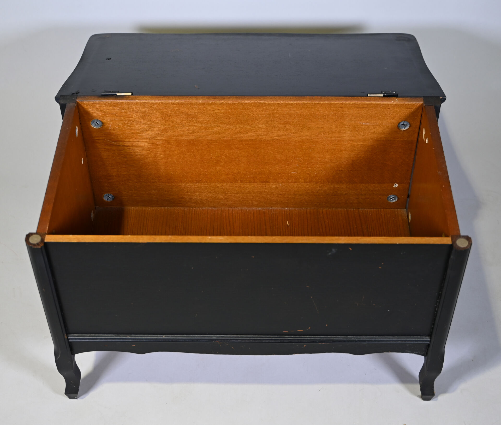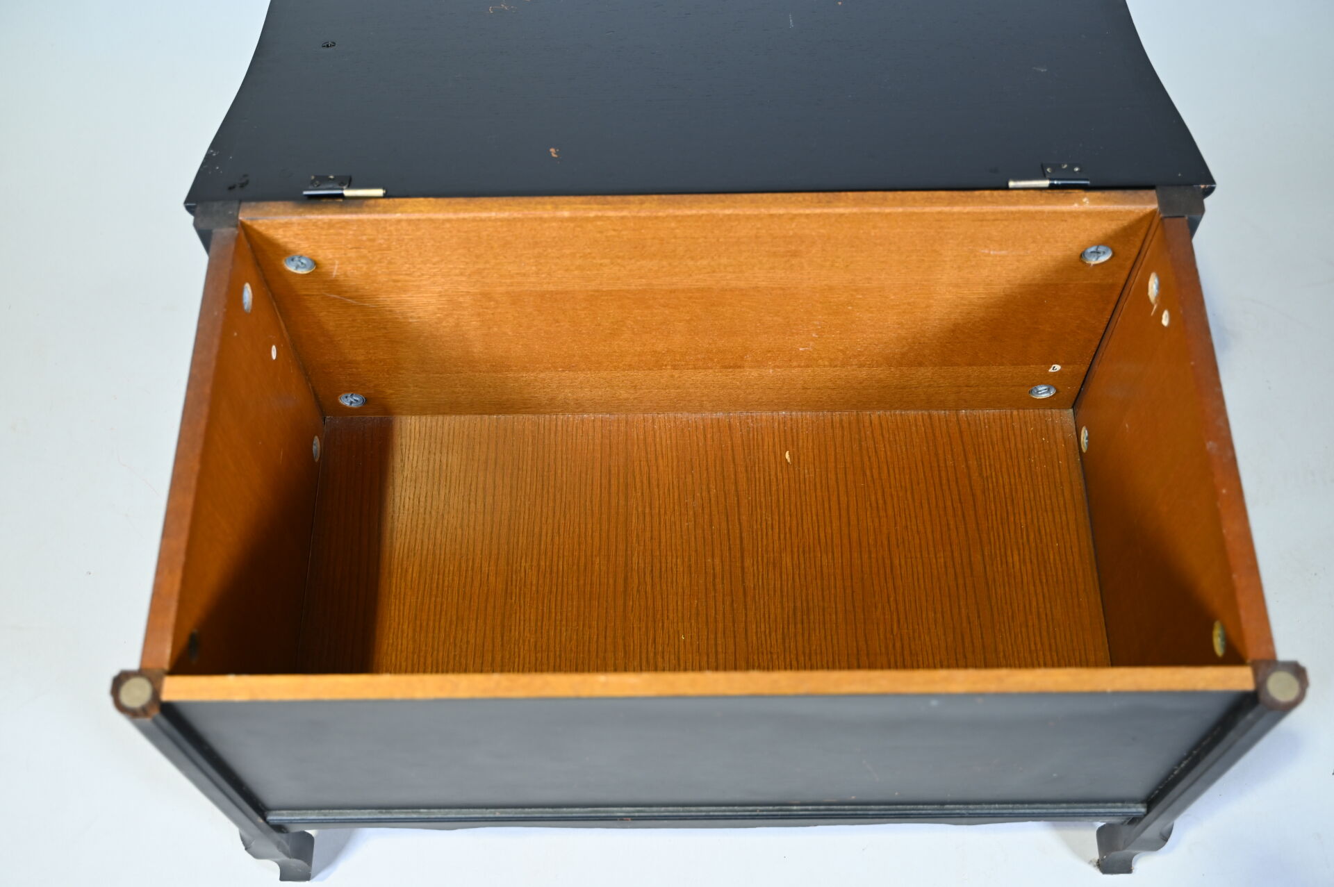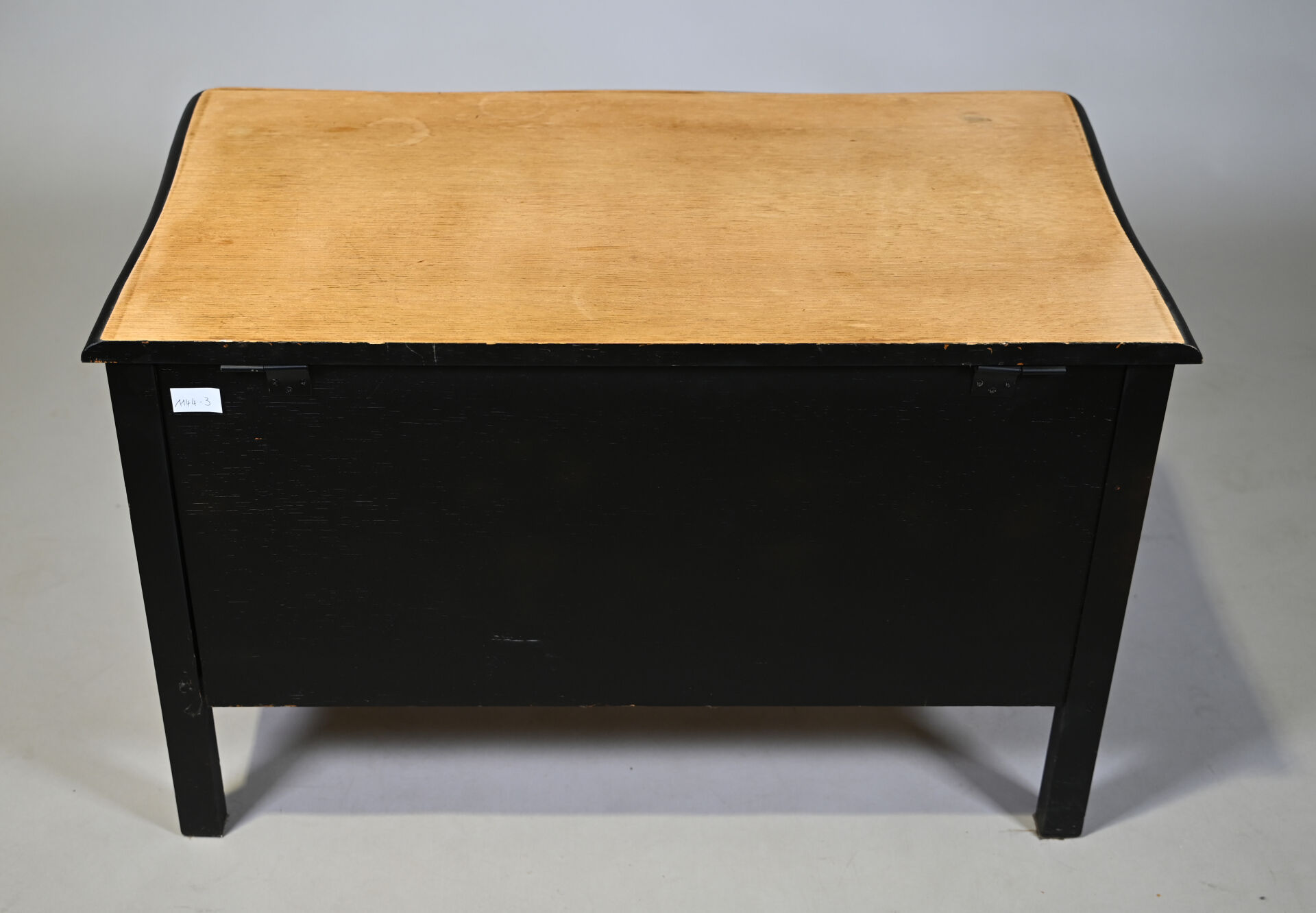 Coffre sur pied en contre plaqué et bois laqué noir. Style transition Louis XV-Louis XVI. Haut. : 53 cm. Larg. : 83,5 cm. Prof. : 47 cm. (