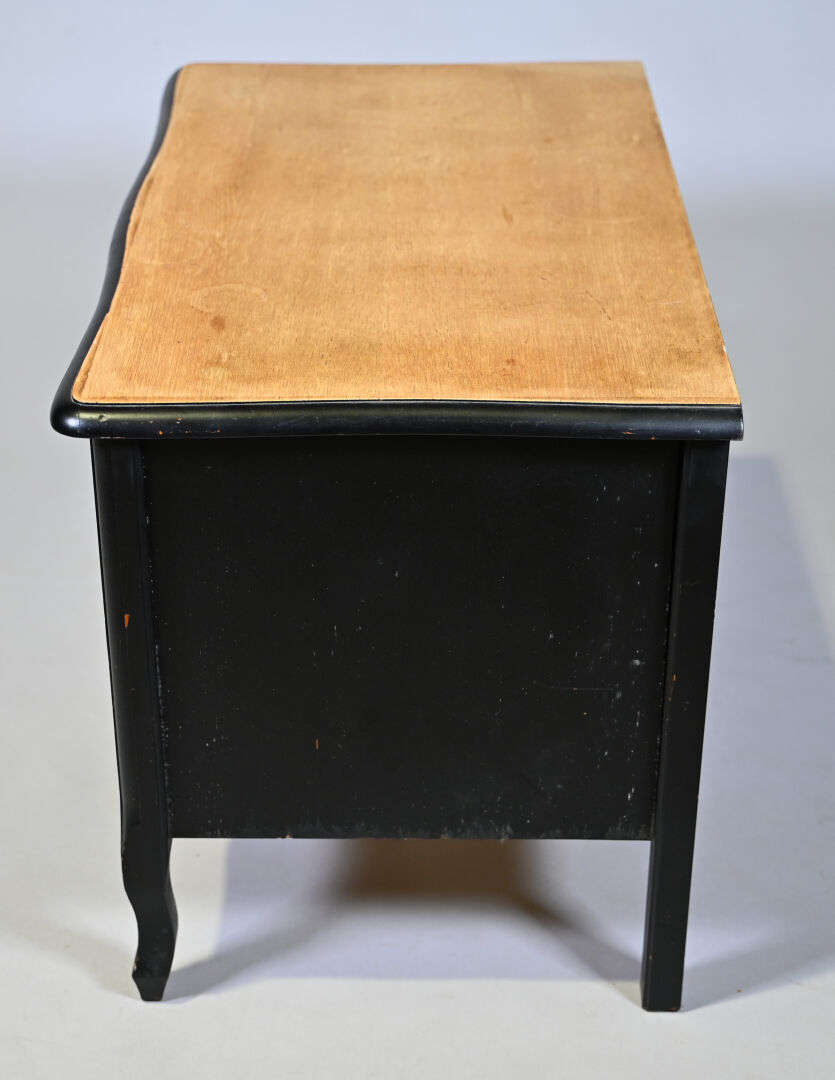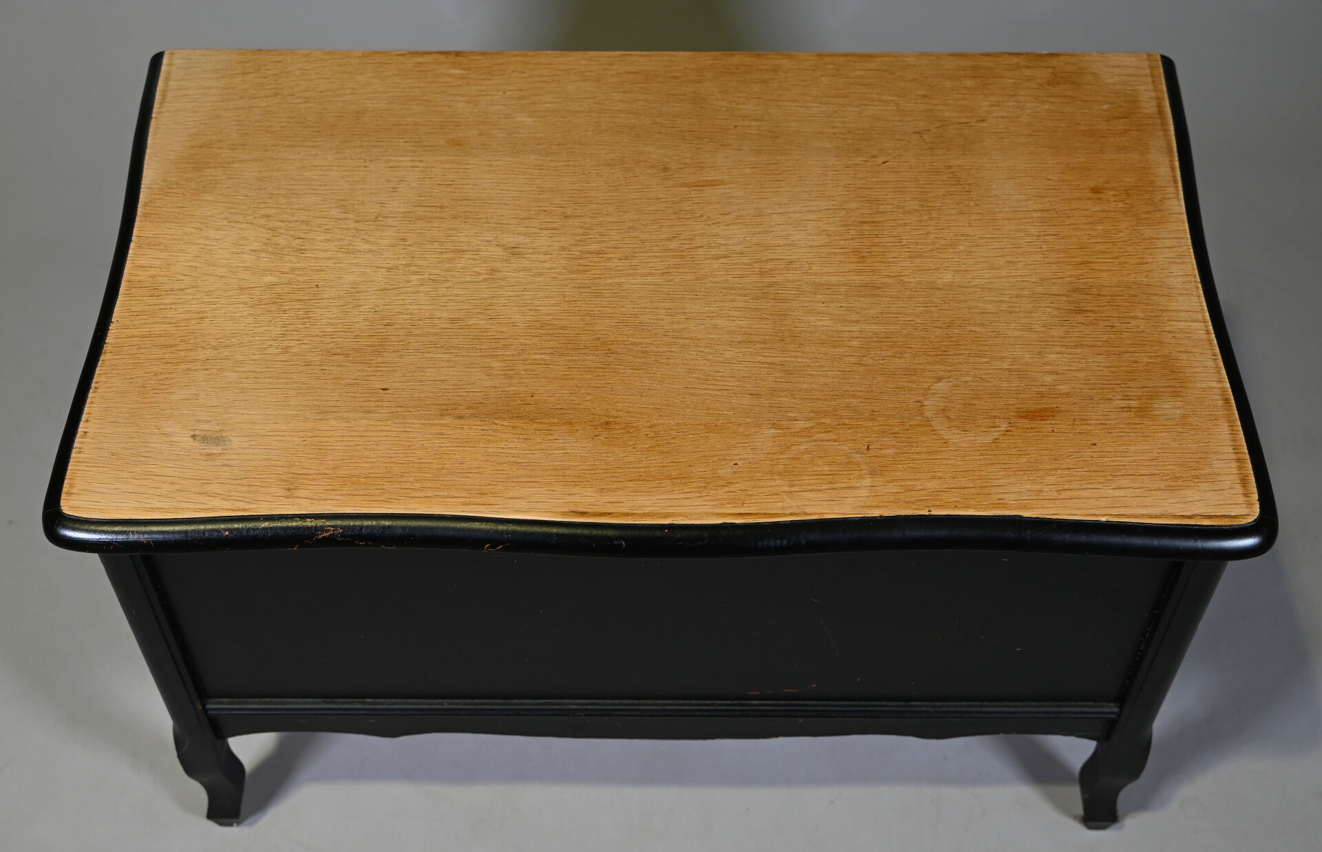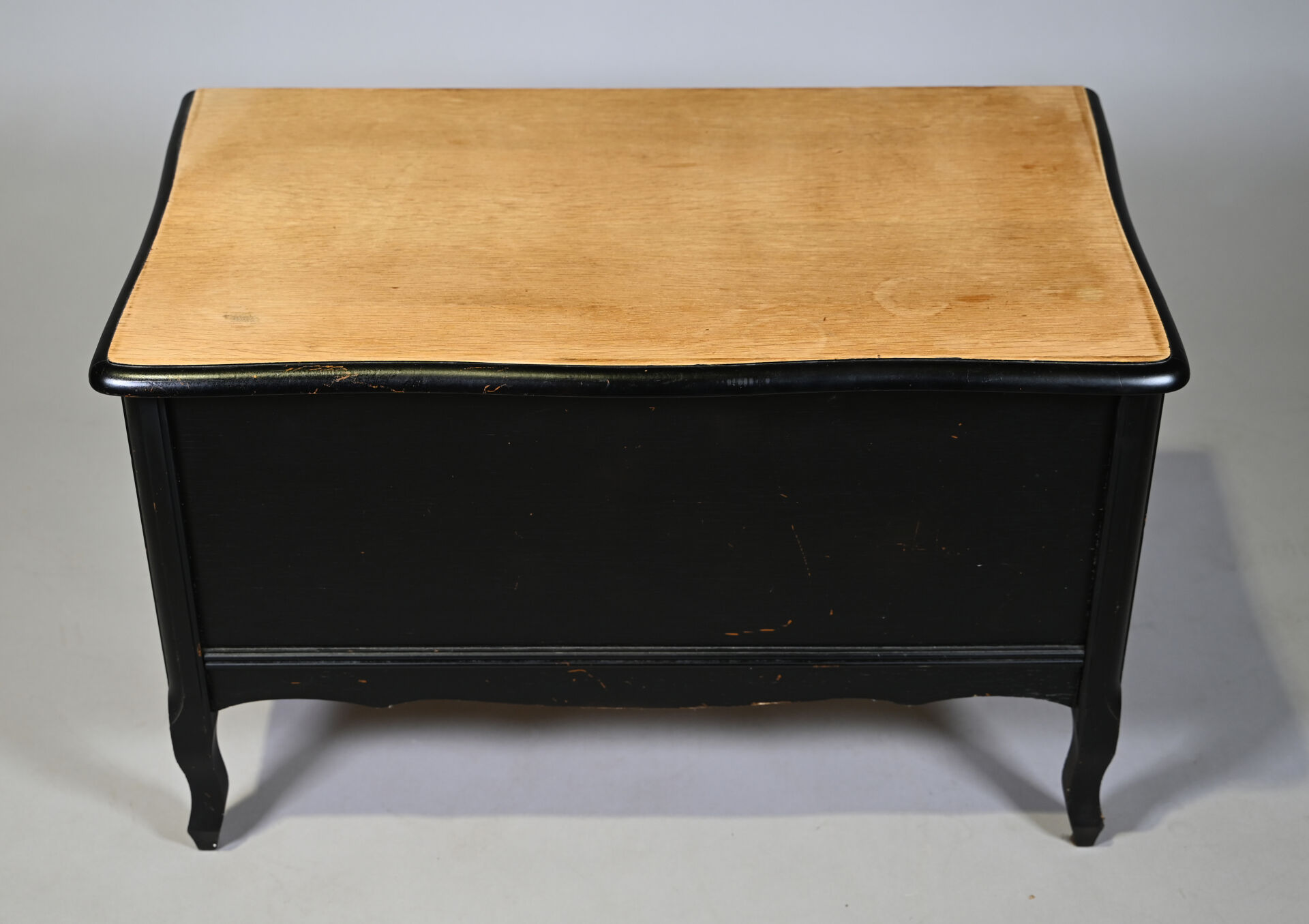 Coffre sur pied en contre plaqué et bois laqué noir. Style transition Louis XV-Louis XVI. Haut. : 53 cm. Larg. : 83,5 cm. Prof. : 47 cm. (