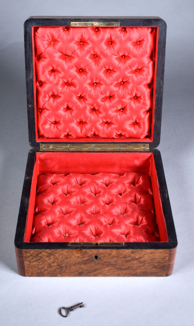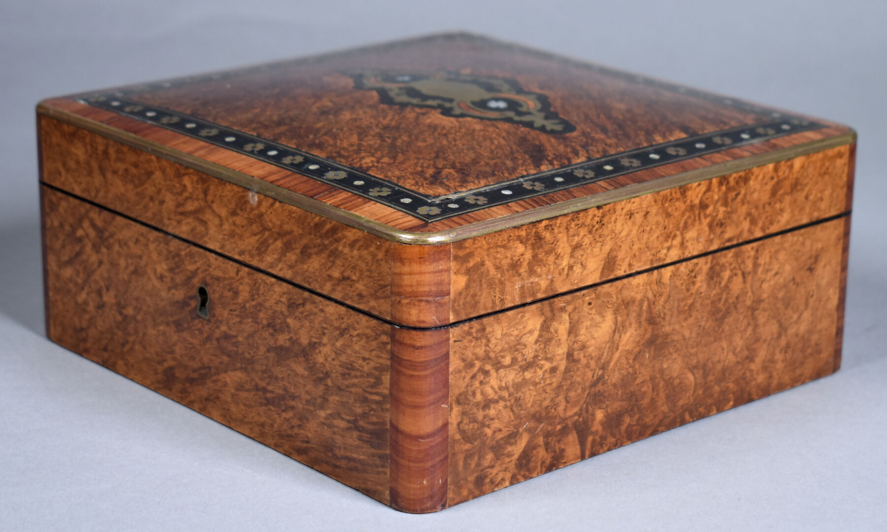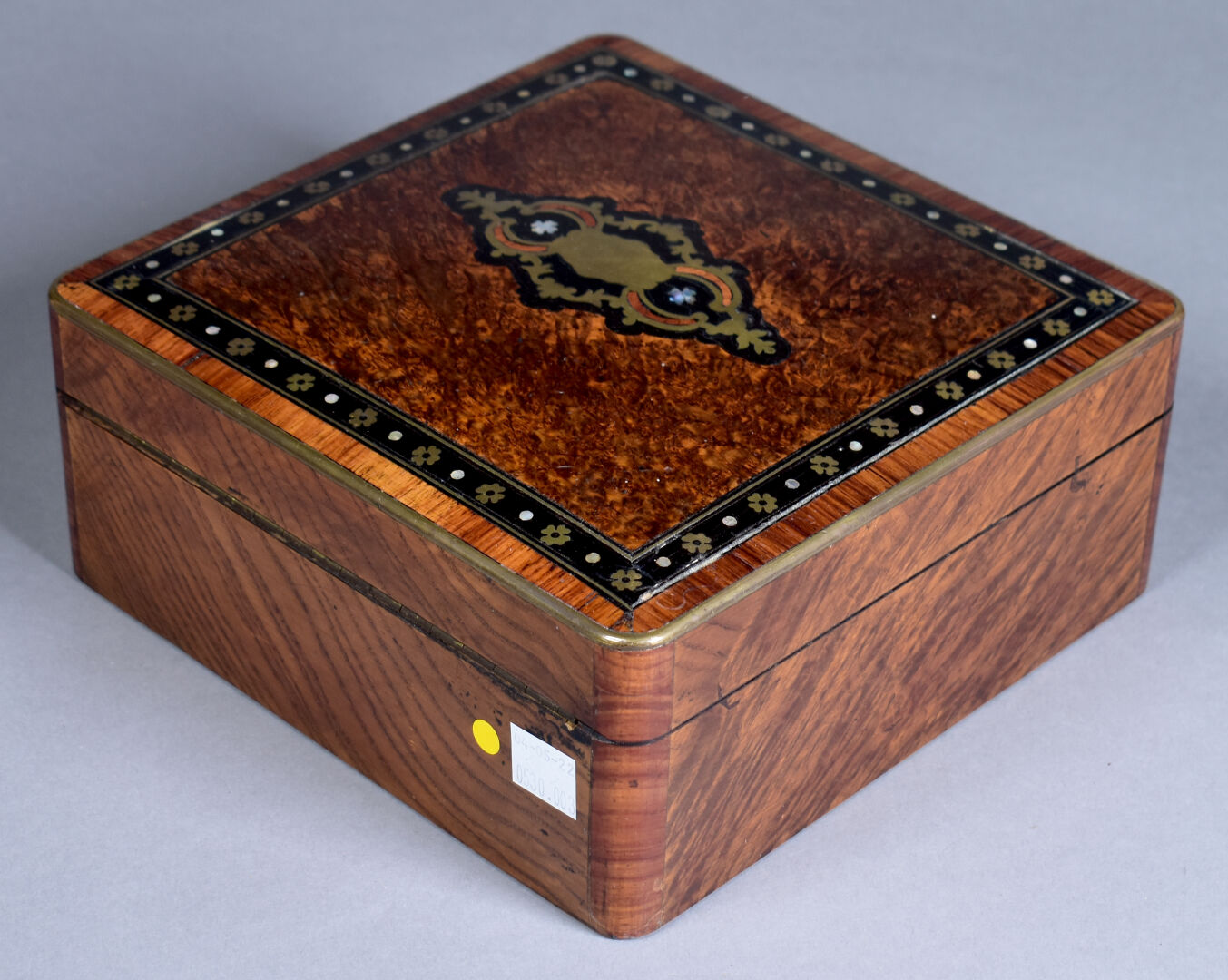 Coffret à bijoux en bois de placage à décor marqueté de laiton et nacre (une rayure, quelques usures). Intérieur capitonné rouge. Fin du XIXe siècle. Haut. : 8,5 cm – Larg. : 20 cm – Prof. : 20 cm.