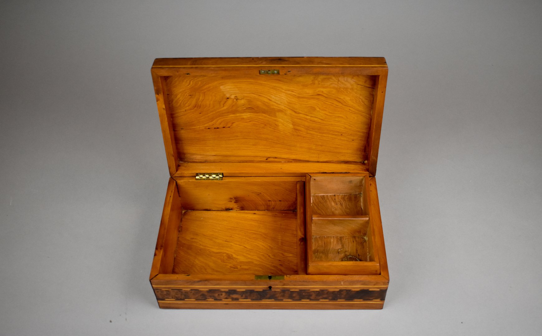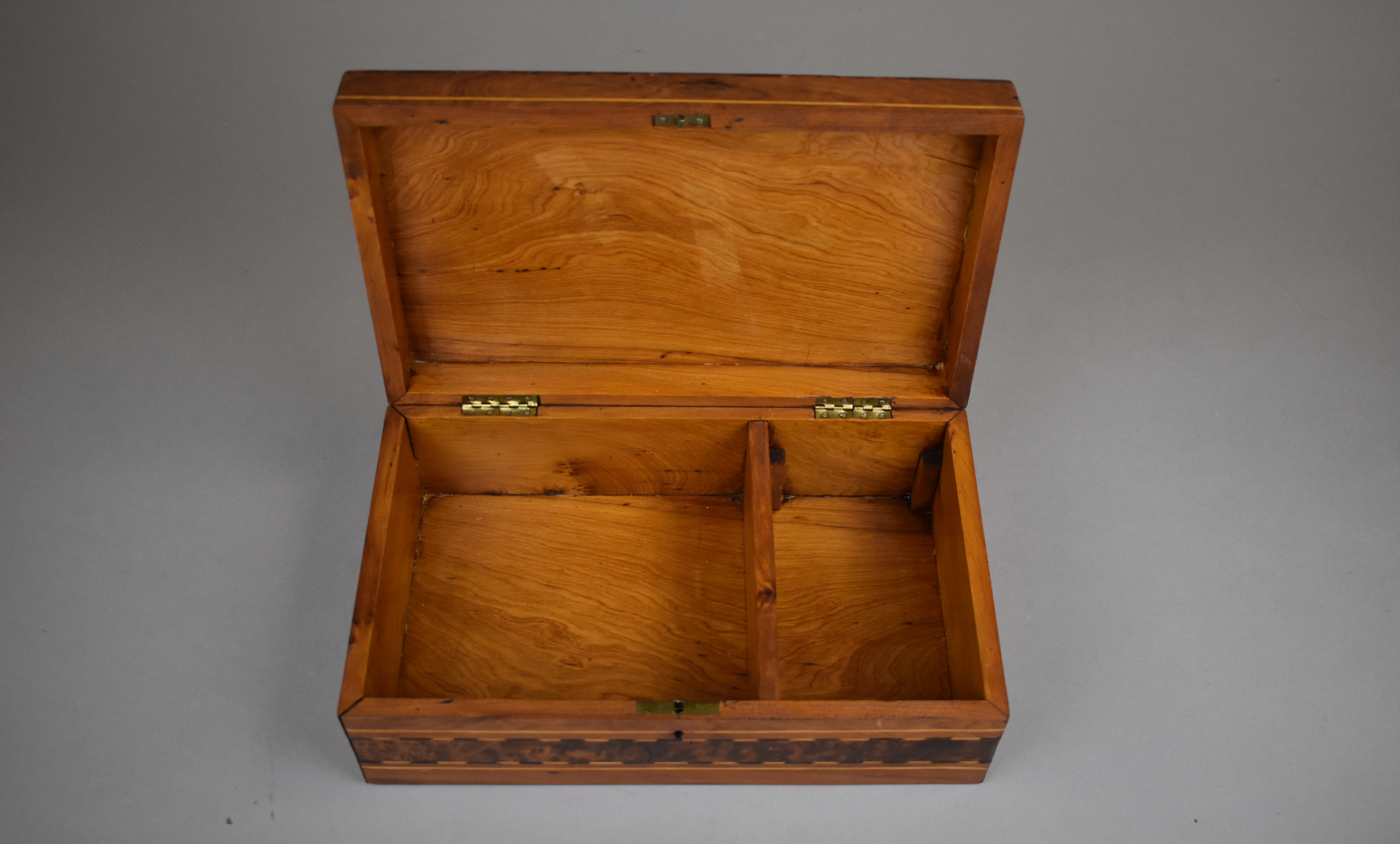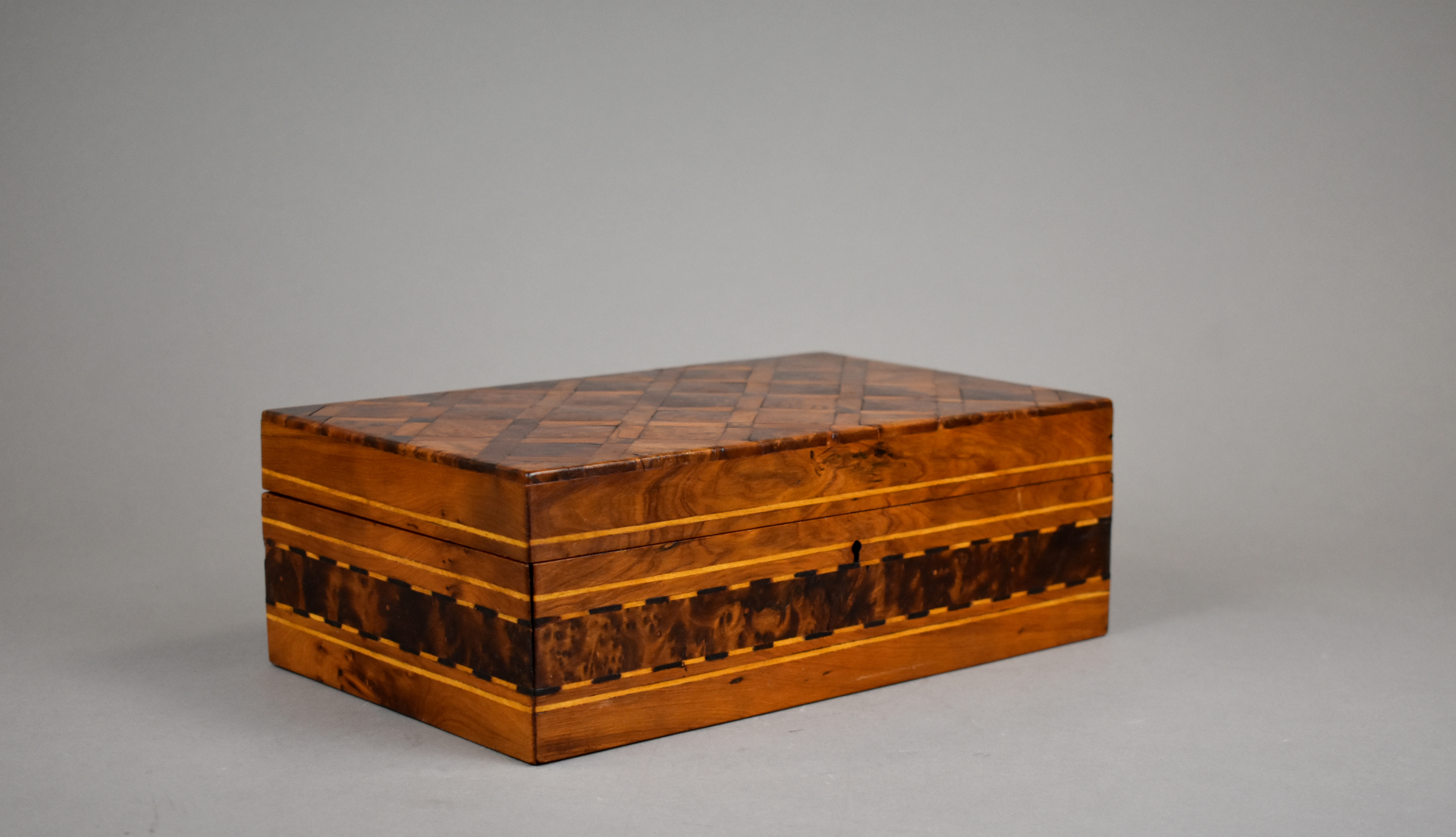 Coffret à décor marqueté de croissillons en placage de loupe d’orme, bois fruitier et bois blond (petit éclat). XXe siècle. Haut. : 10,5 cm – Larg. : 31 cm – Prof. : 18,5 cm.