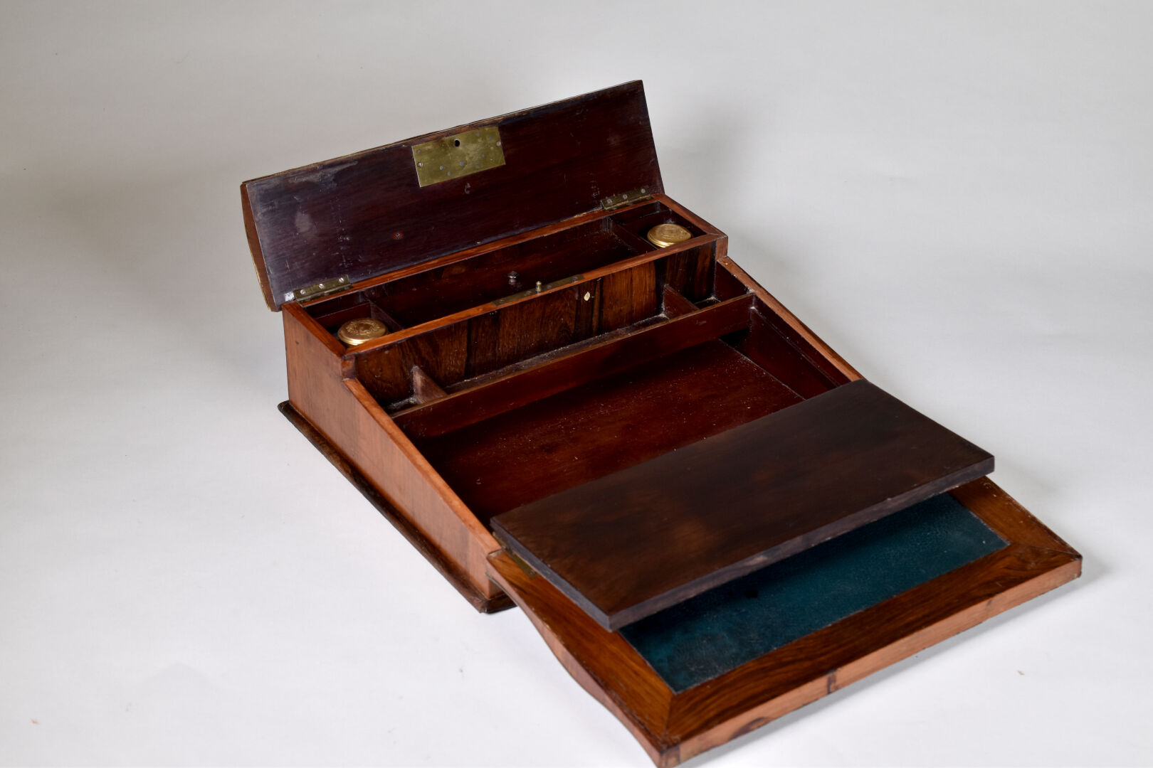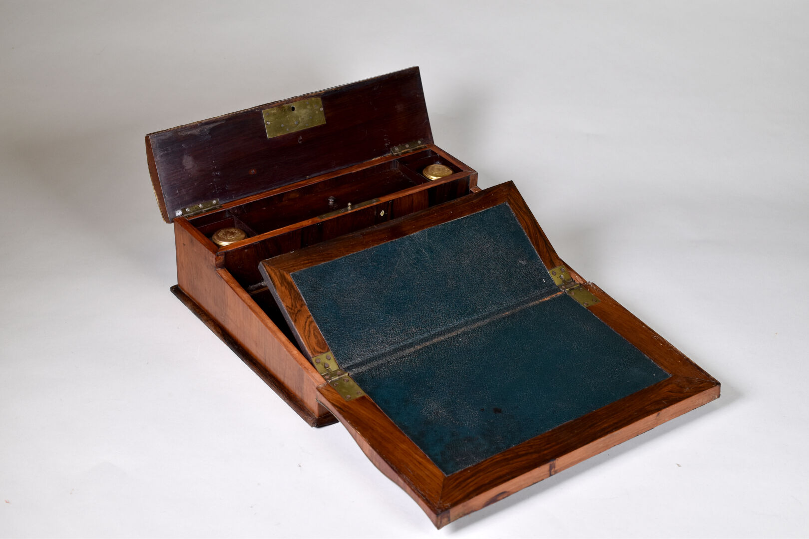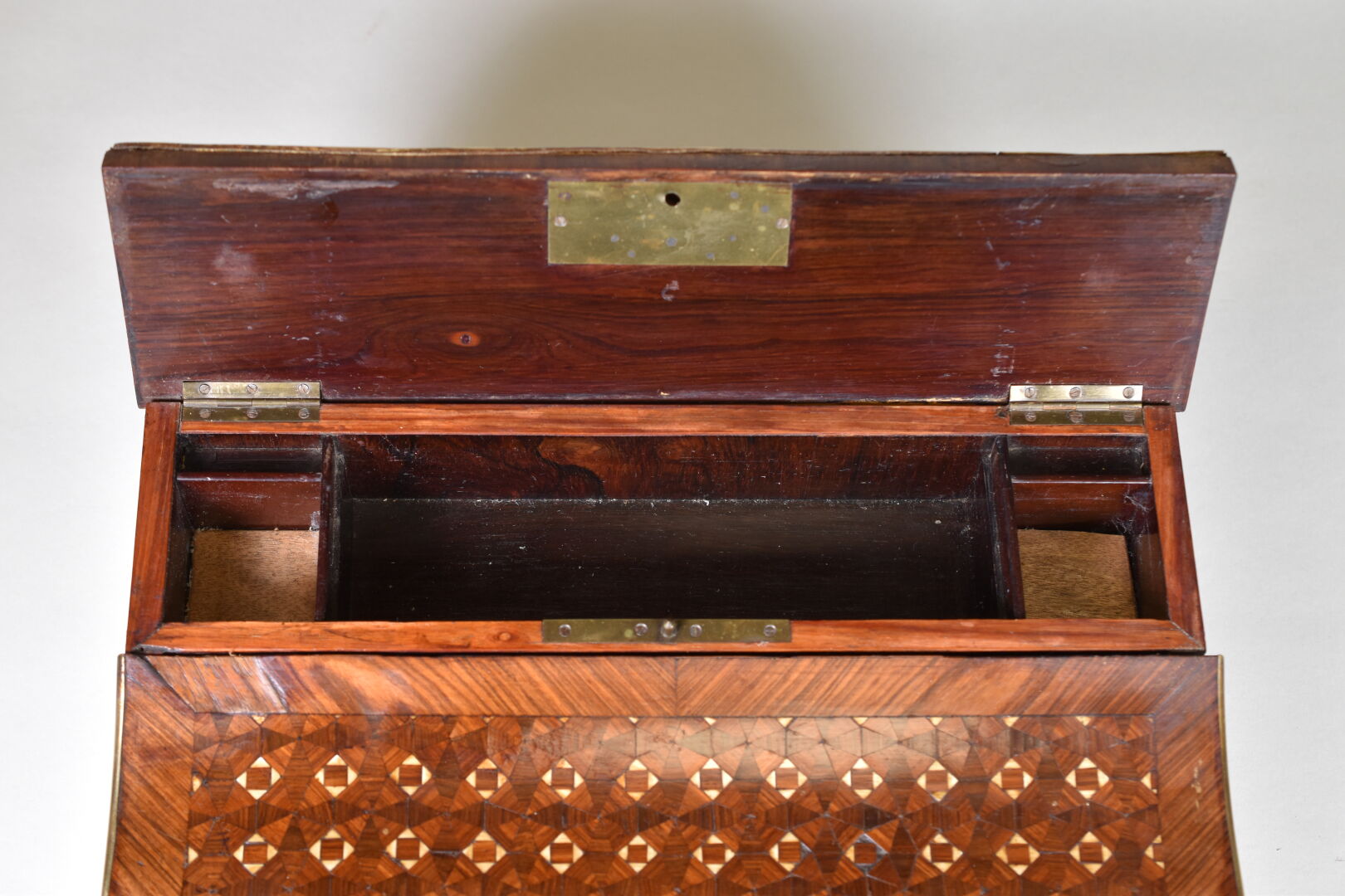 Coffret écritoire en placage de bois de rose et palissandre à décor marqueté de motifs géométriques incrustés d’os. L’intérieur re gainé de skaï vert. Fin du XIXe siècle. Haut. : 11 cm – Larg. : 32,5 cm – Prof. : 27 cm.