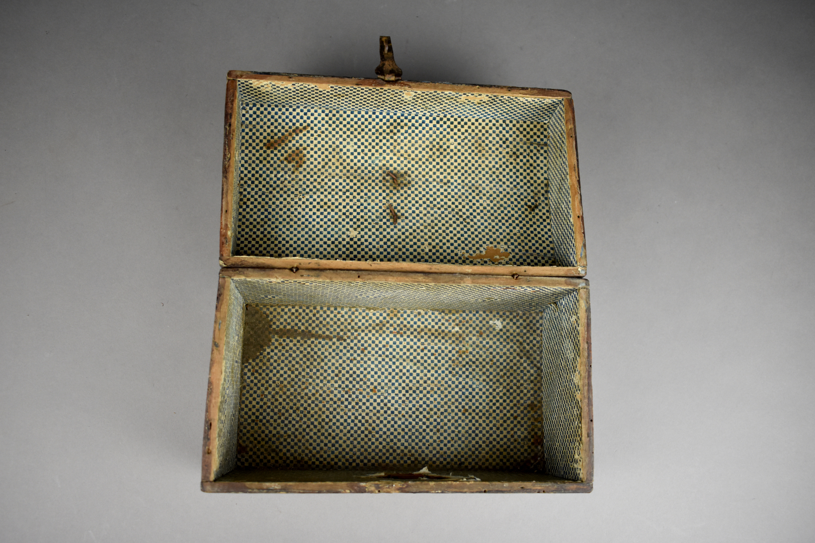 Coffret en hêtre, le couvercle ouvrant par des petits anneaux métalliques. Fermoir en métal forgé. Haut. : 14,5 cm – Larg. : 23,5 cm – 13,5 cm.