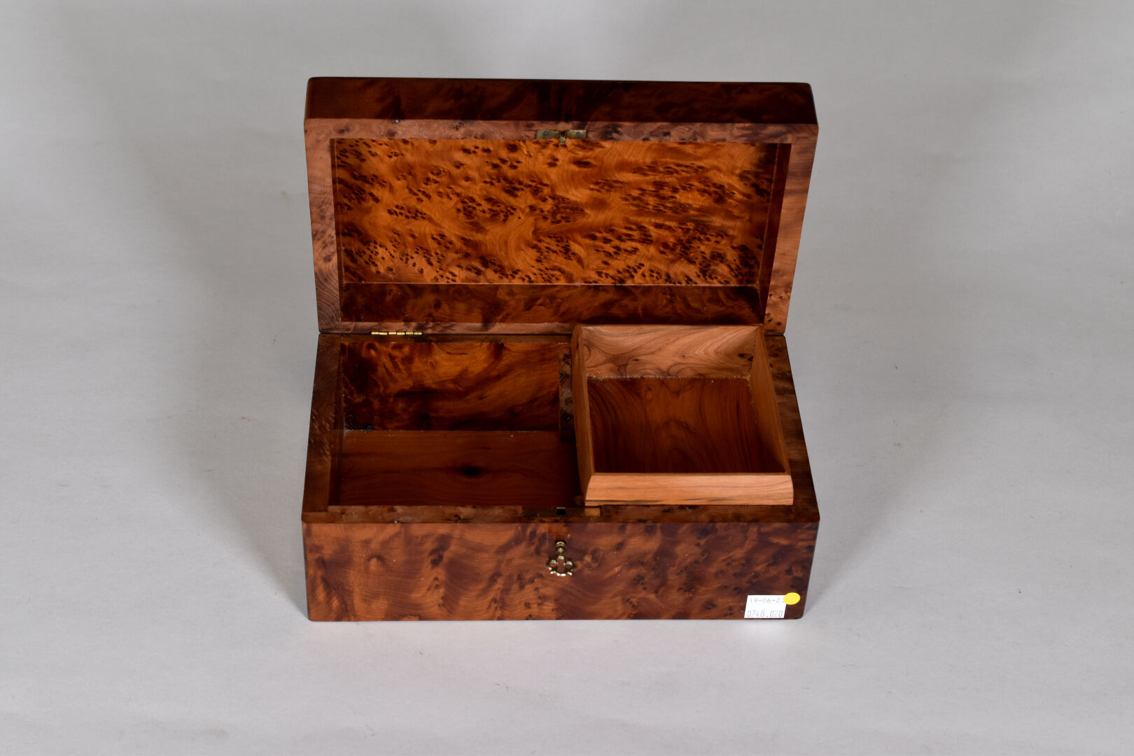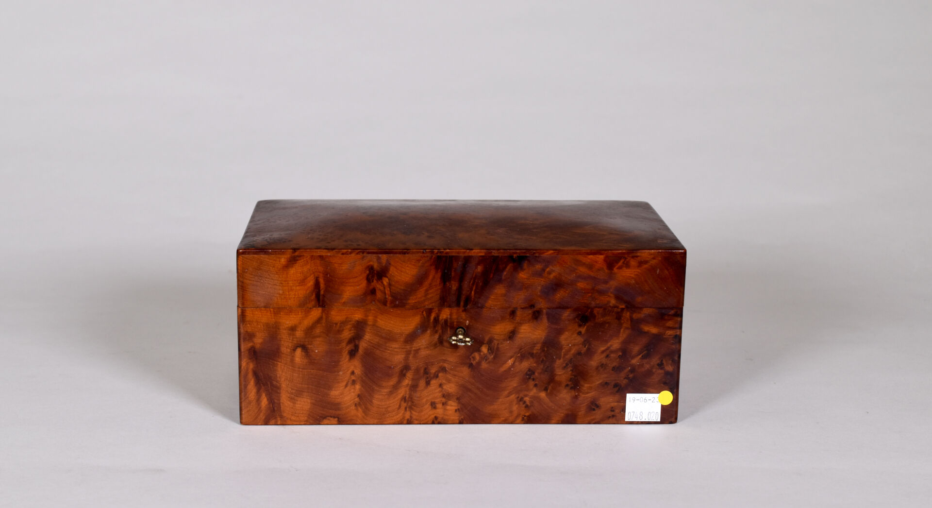 Coffret en loupe de noyer. Haut. : 10,5 cm – Larg. : 25 cm – Prof. : 15,5 cm.