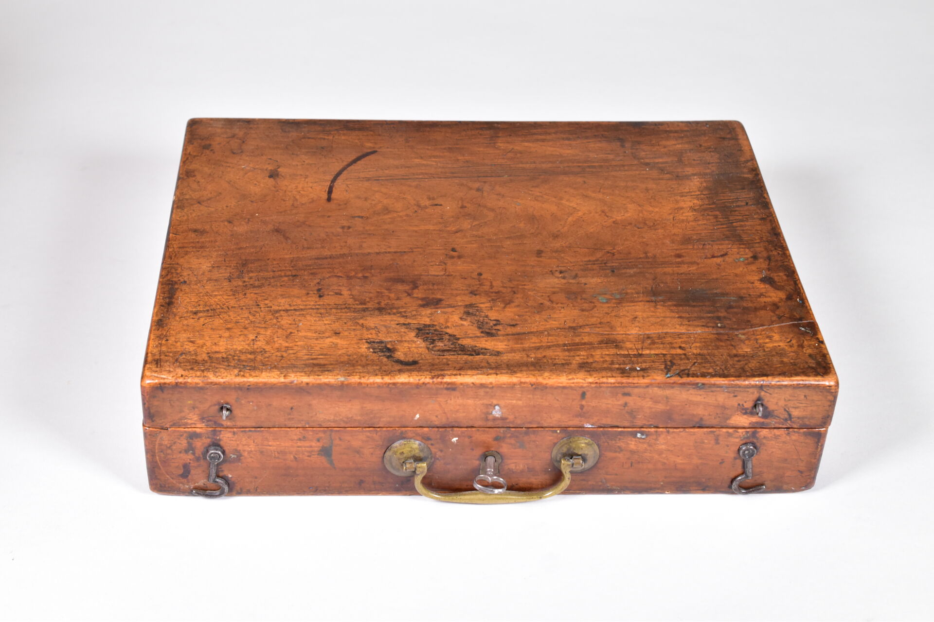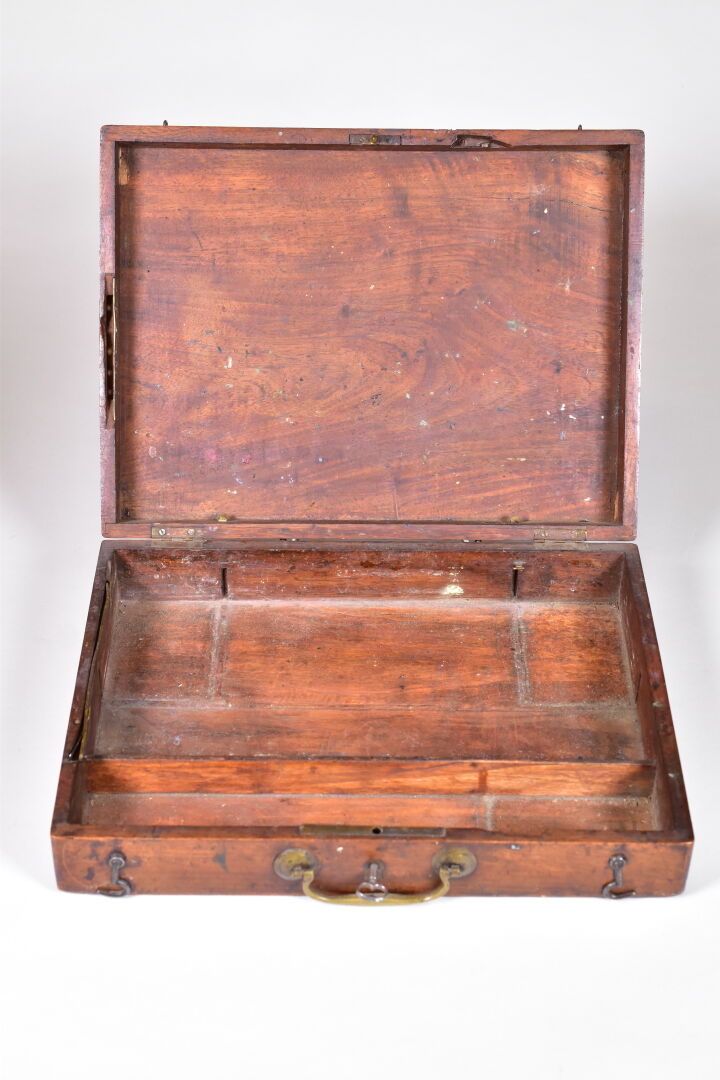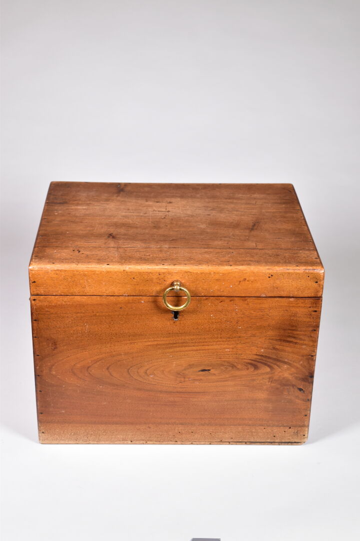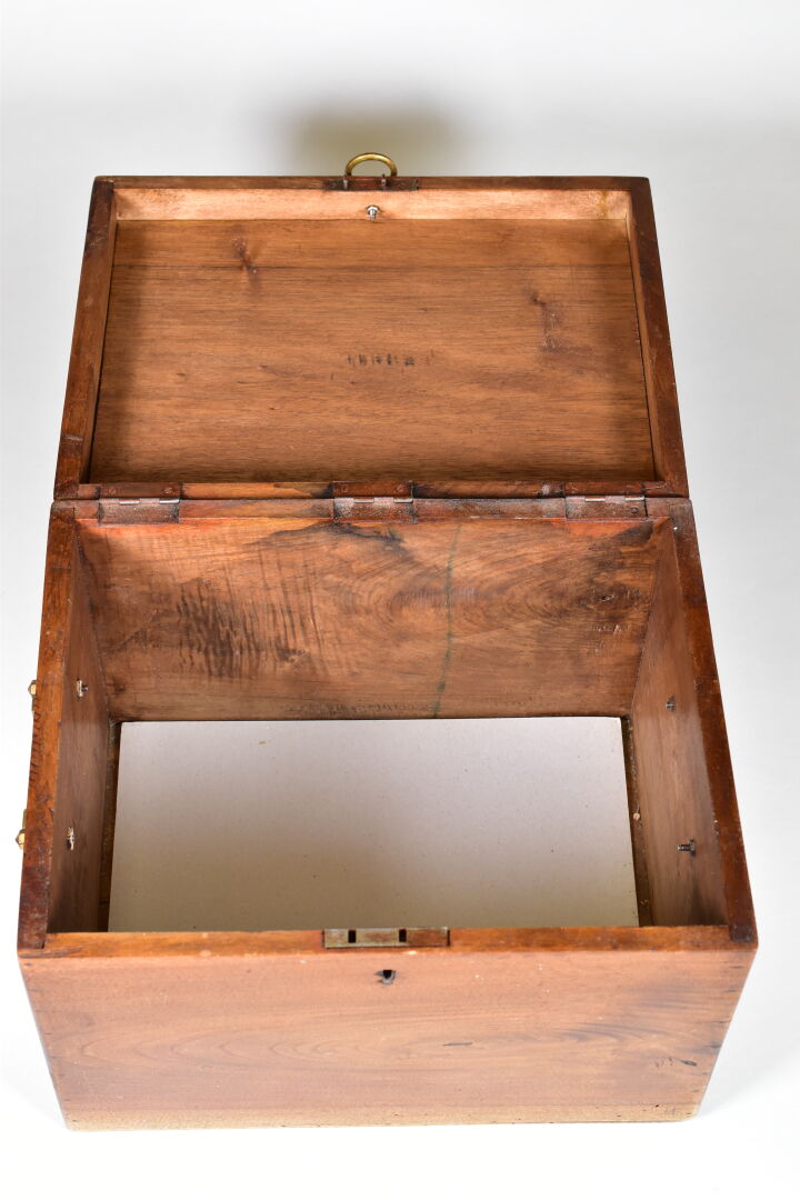 Coffret en noyer, les anses et la prise du couvercle (à charnières) en laiton. XXe siècle. Haut. : 27 cm – Larg. : 38 cm – Prof. : 29 cm. On joint un second, plus petit.