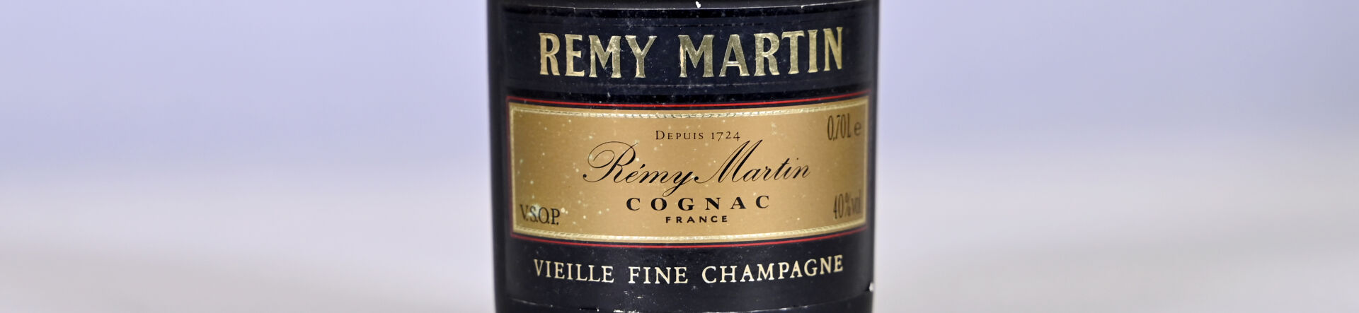 COGNAC – 1 bouteille, Cognac Vieille Fine Champagne, Rémy Martin, VSOP. Niveau très légèrement bas. Capsule sale. Pastille partiellement décollée. Etiquette et contre-étiquette légèrement sales. La contre-étiquette est également très légèrement abimée.