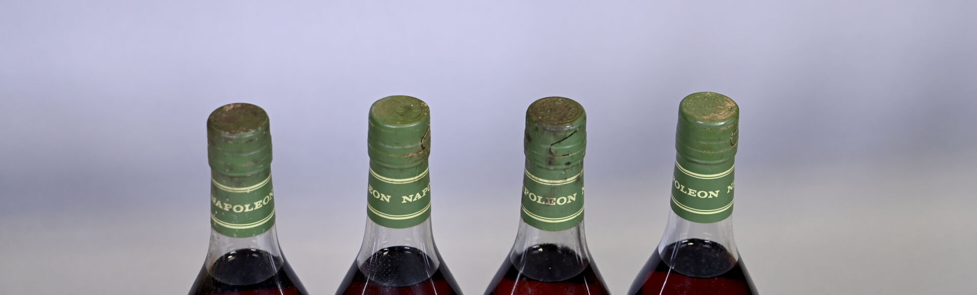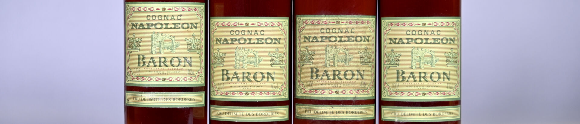 COGNAC – 4 bouteilles, Cognac Borderies, Baron, Napoléon. Deux niveaux légèrement bas. Capsules légèrement sales. Etiquettes avec des traces dont une est légèrement sale.