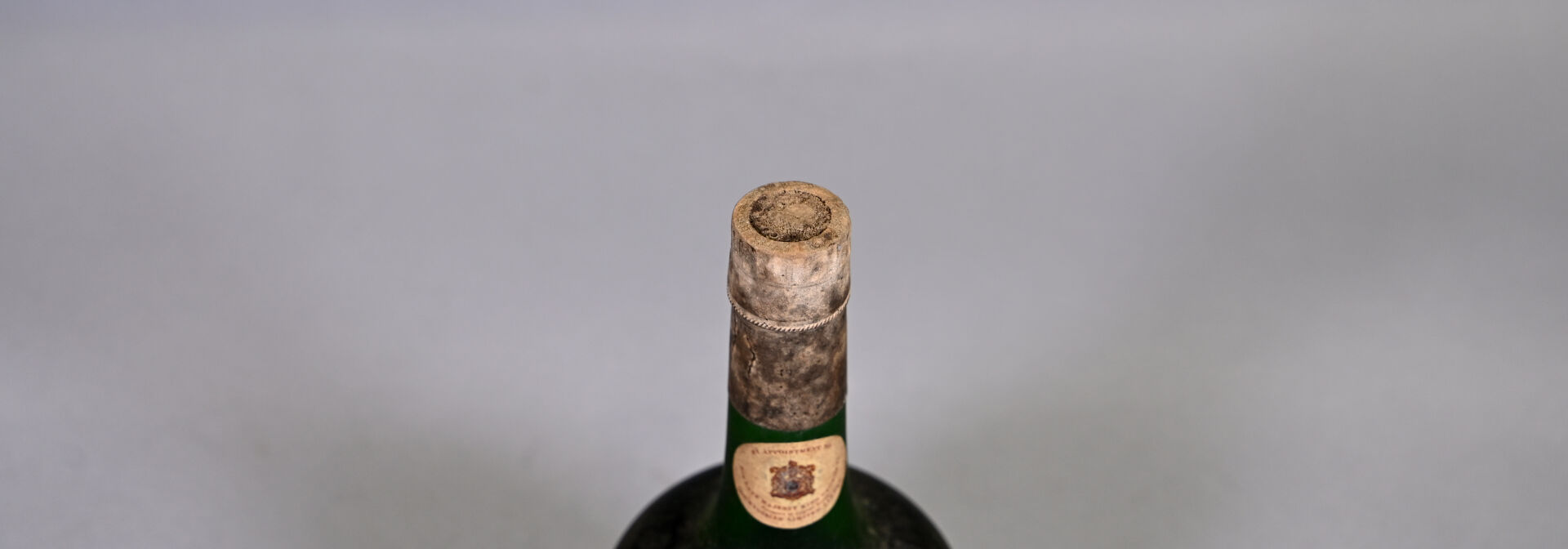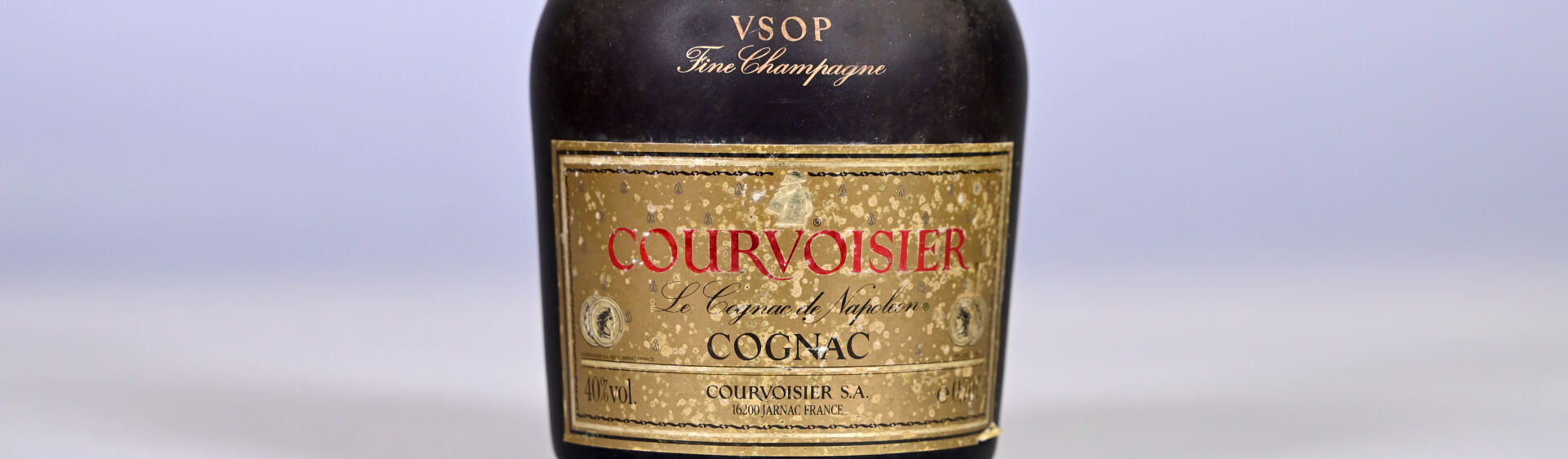 1 bouteille, Cognac Fine Champagne, Courvoisier, VSOP. Niveau légèrement bas. Capsule très sale. Etiquette et contre-étiquette légèrement sales avec quelques petits points de décollement.