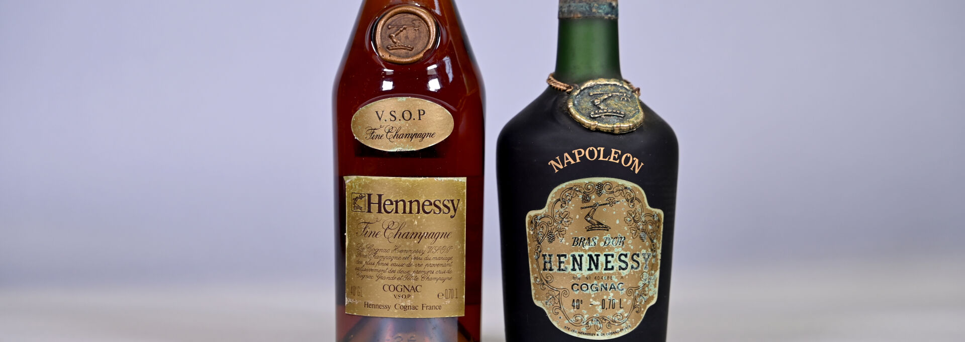 1 bouteille, Cognac Fine Champagne, Hennessy, VSOP. Niveau légèrement bas. Capsule sale. Pastille légèrement sale et abimée. Etiquette légèrement sale à sale avec des petits points de décollement. Contre-étiquette légèrement sale et abimée.