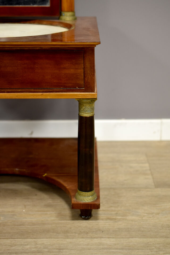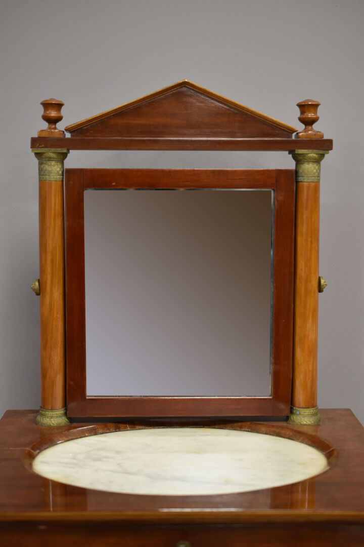 Coiffeuse à poser en placage d’acajou, acajou blond et bois teinté. Elle ouvre à un tiroir et repose sur des pieds tournés, les montants à colonnes réunis par une entretoise concave (petites fentes, restauration, placage insolé par endroits). Fronton triangulaire. Plateau de marbre blanc inclus. Époque Empire. Haut. : 76 cm – Larg. : 44 cm – Prof. : 37 cm.