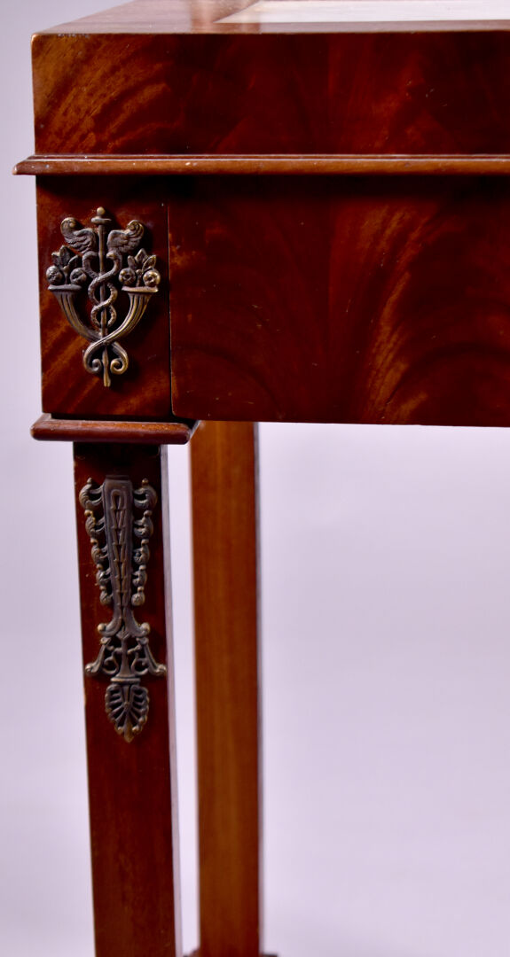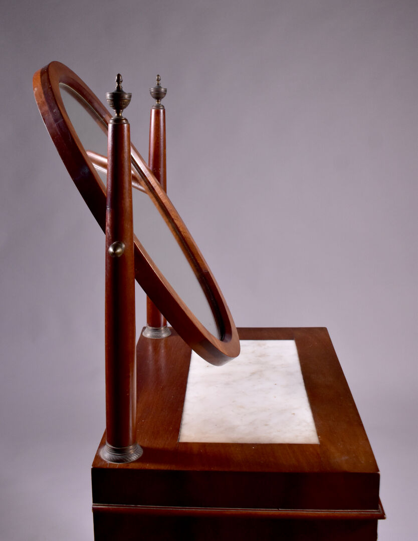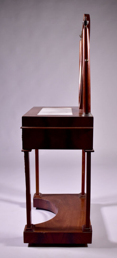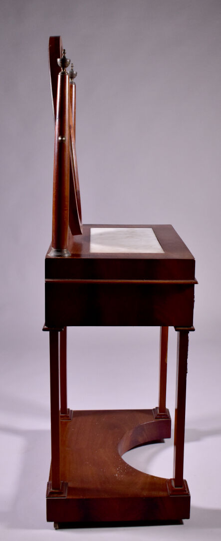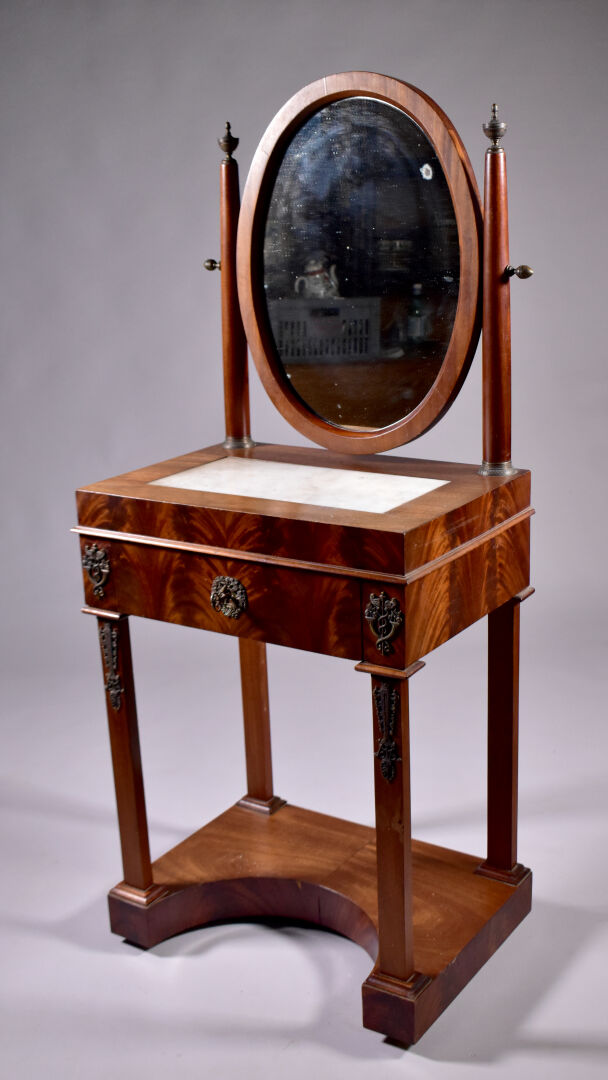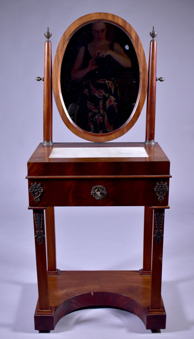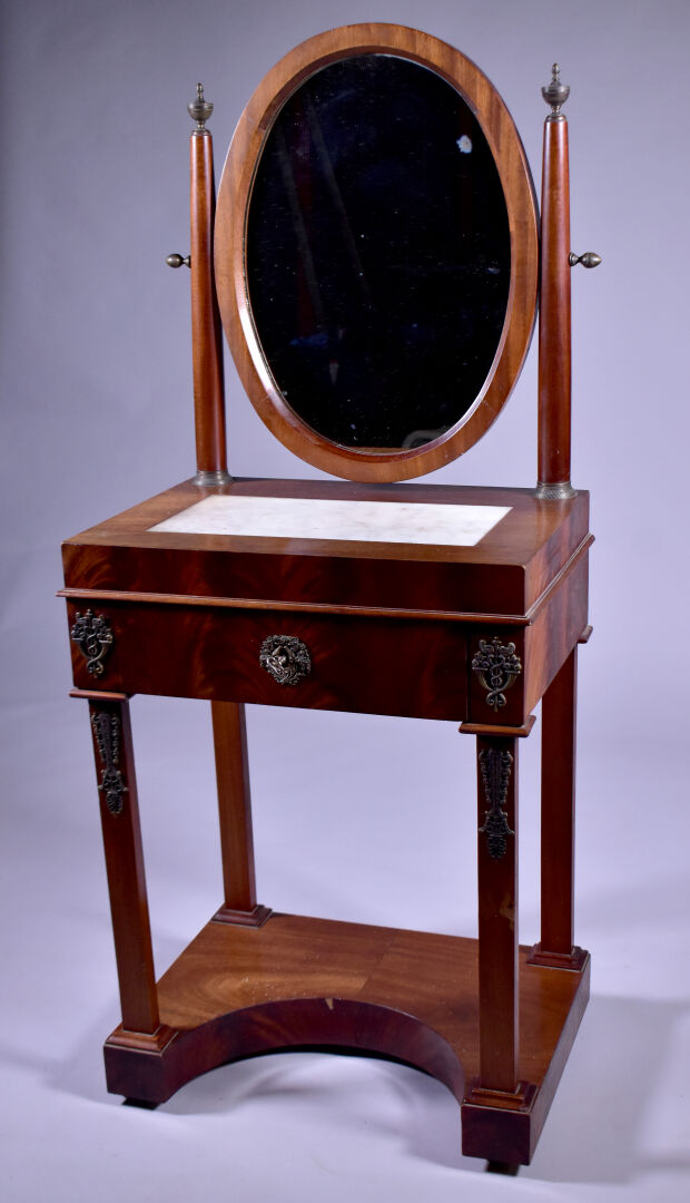 Coiffeuse en placage d’acajou à décor appliqué de laiton de caducées, palmettes et fleurs. Elle ouvre à un tiroir en ceinture et repose sur quatre pieds gaine à tablette d’entretoise. Plateau en partie garni de marbre blanc (usures d’usage, piqure à la glace). Epoque Empire. Haut. : 138 cm. Larg. : 59 cm. Prof. : 41 cm.