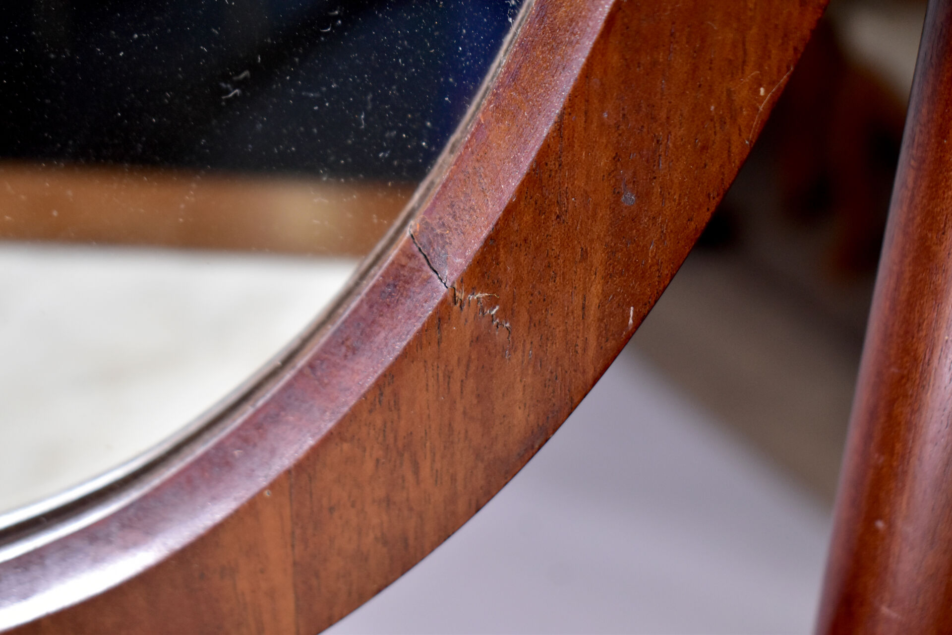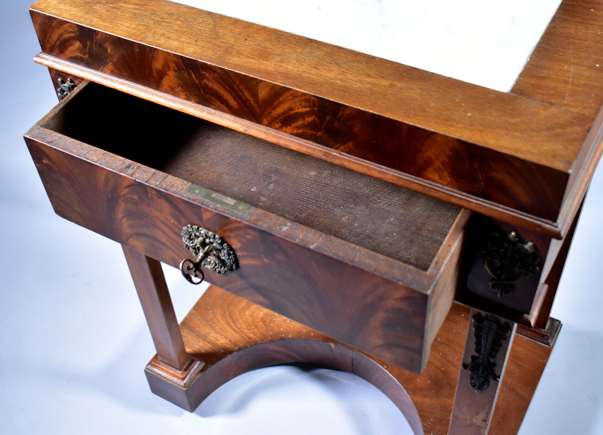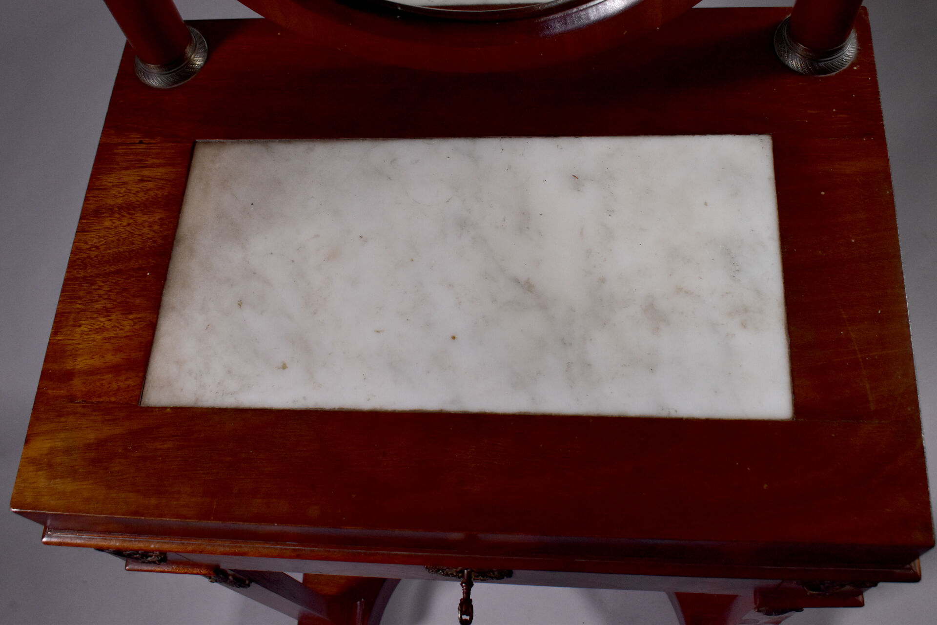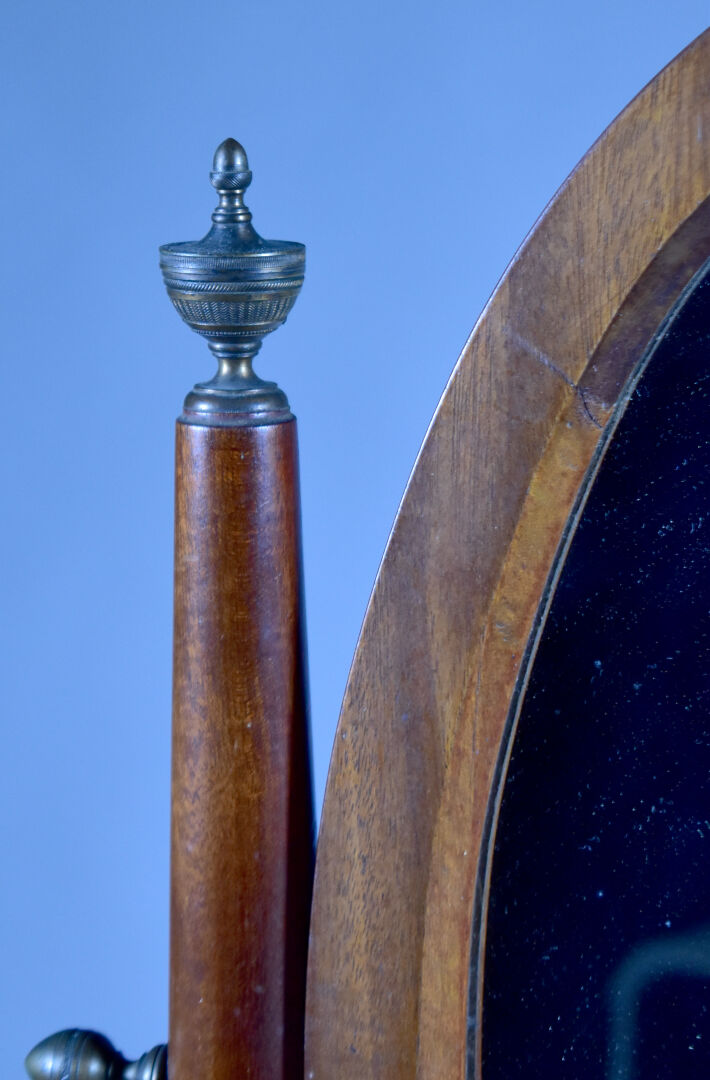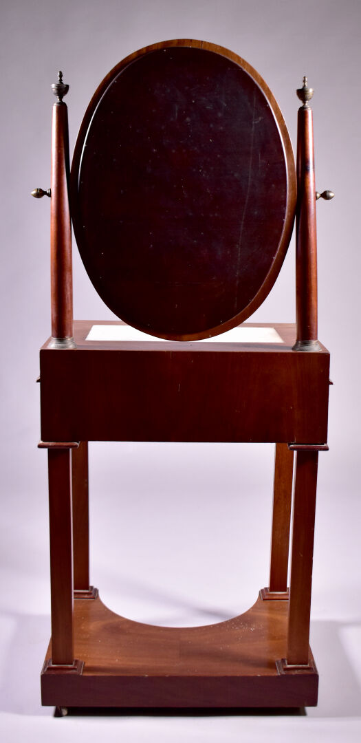 Coiffeuse en placage d’acajou à décor appliqué de laiton de caducées, palmettes et fleurs. Elle ouvre à un tiroir en ceinture et repose sur quatre pieds gaine à tablette d’entretoise. Plateau en partie garni de marbre blanc (usures d’usage, piqure à la glace). Epoque Empire. Haut. : 138 cm. Larg. : 59 cm. Prof. : 41 cm.