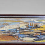 Colette MASGRAU (XXe siècle). Les bateaux et Le travail des champs. Deux gouaches et acrylique (?) sur carton, signées en bas à droite. 21 x 58 cm.
