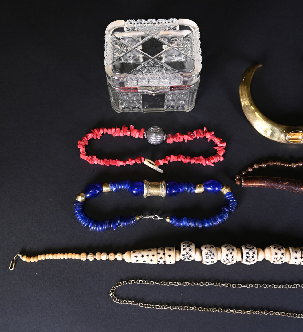 Collection de bijoux fantaisies comprenant : huit colliers divers dont un de style torque avec un cabochon d’œil de tigre, imitation de corail et os étoilé. Avec un coffret à bijou en verre moulé.