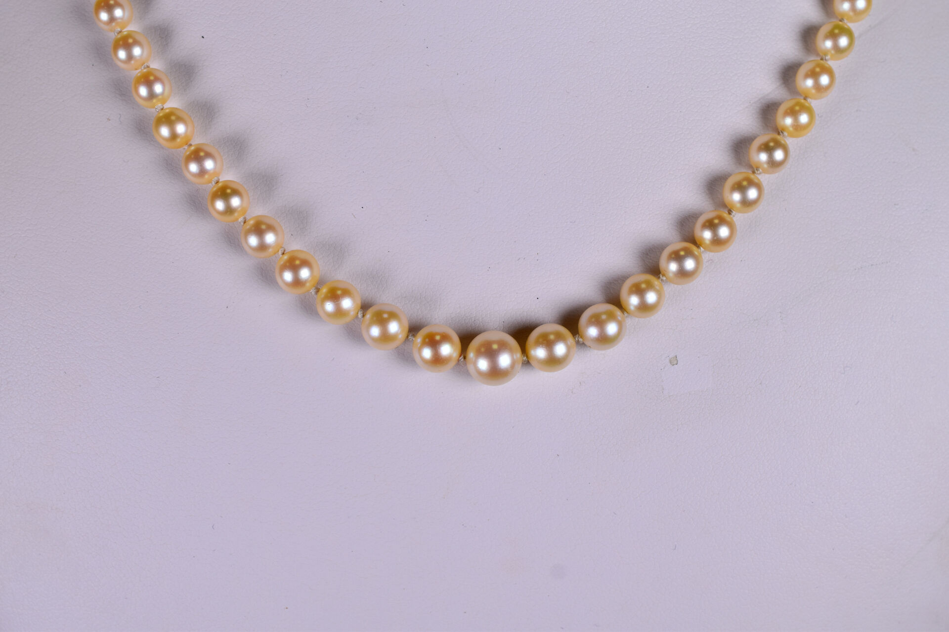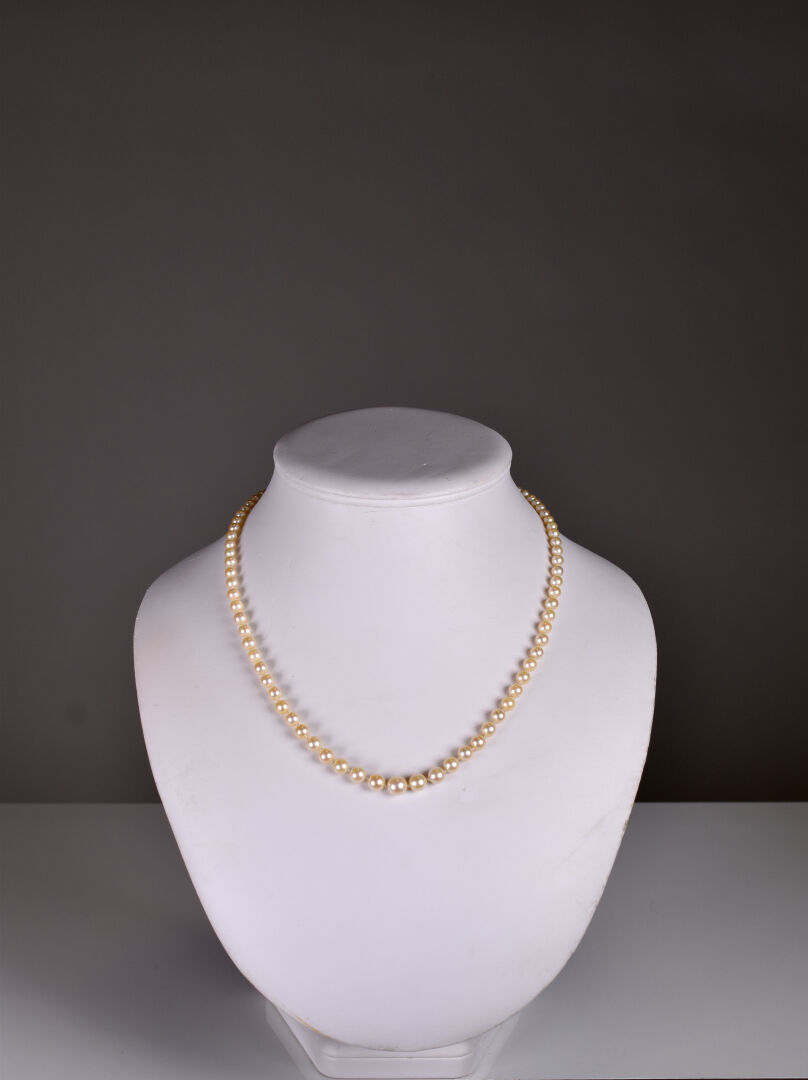 Collier de perles de culture et chute, fermoir en or 18K 750/1000e avec chaîne de sécurité. Long. : 50 cm. Poids brut. : 18,5 g.