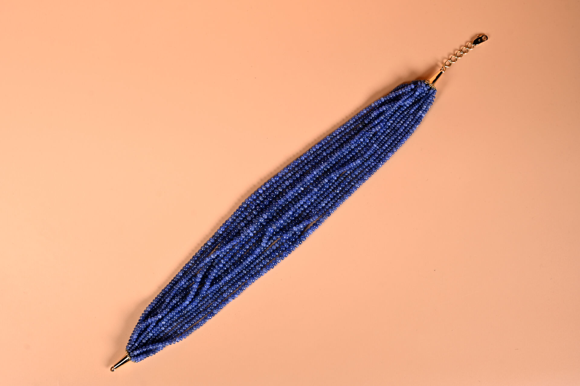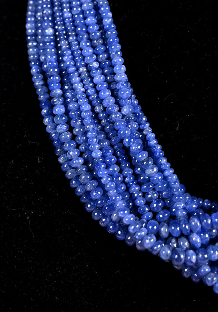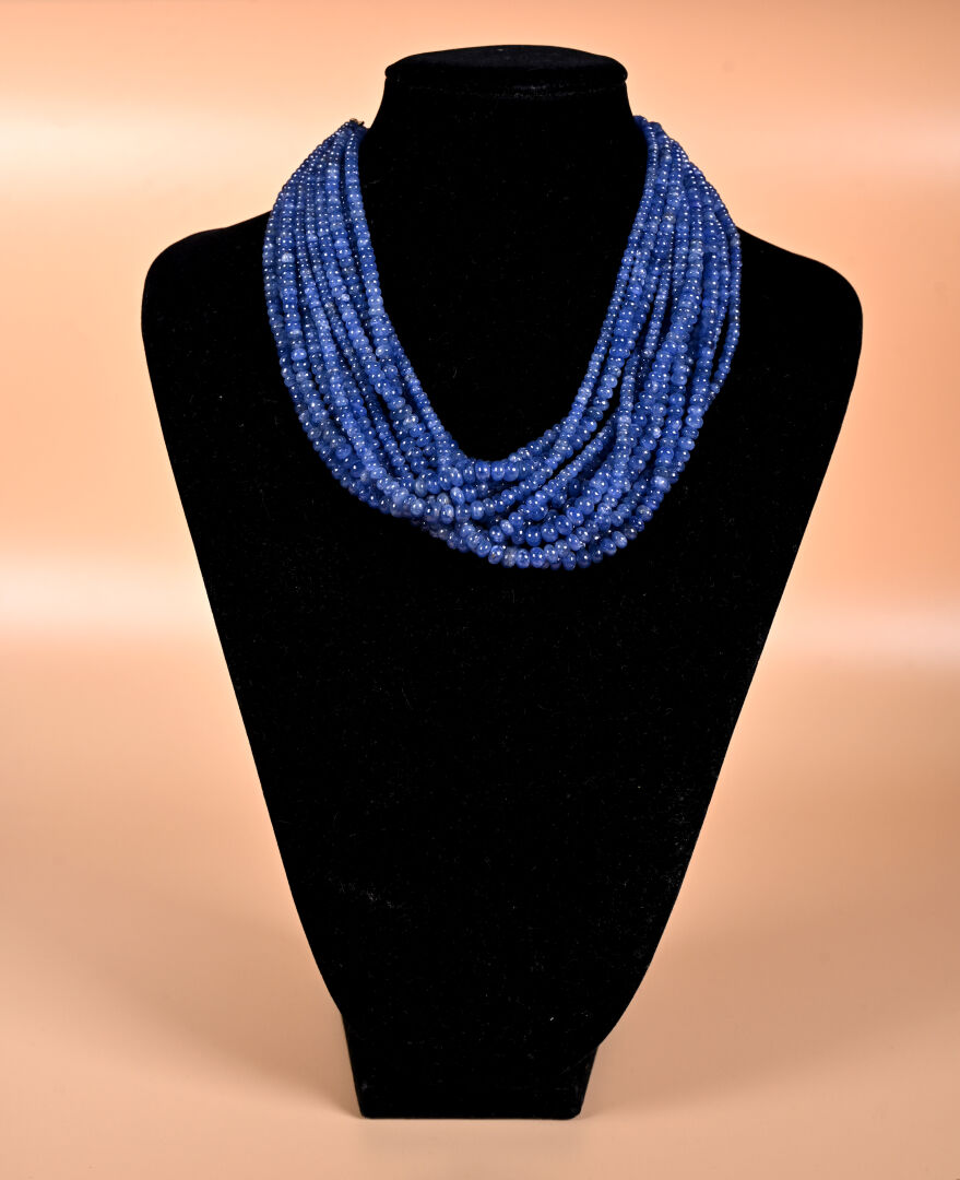 Collier de treize rangs de billes de saphirs en chute. Fermoir tubes en or jaune 750 millièmes (18k). Longueur : 42 cm (réglable). Poids env. du fermoir : 7 g. hibou