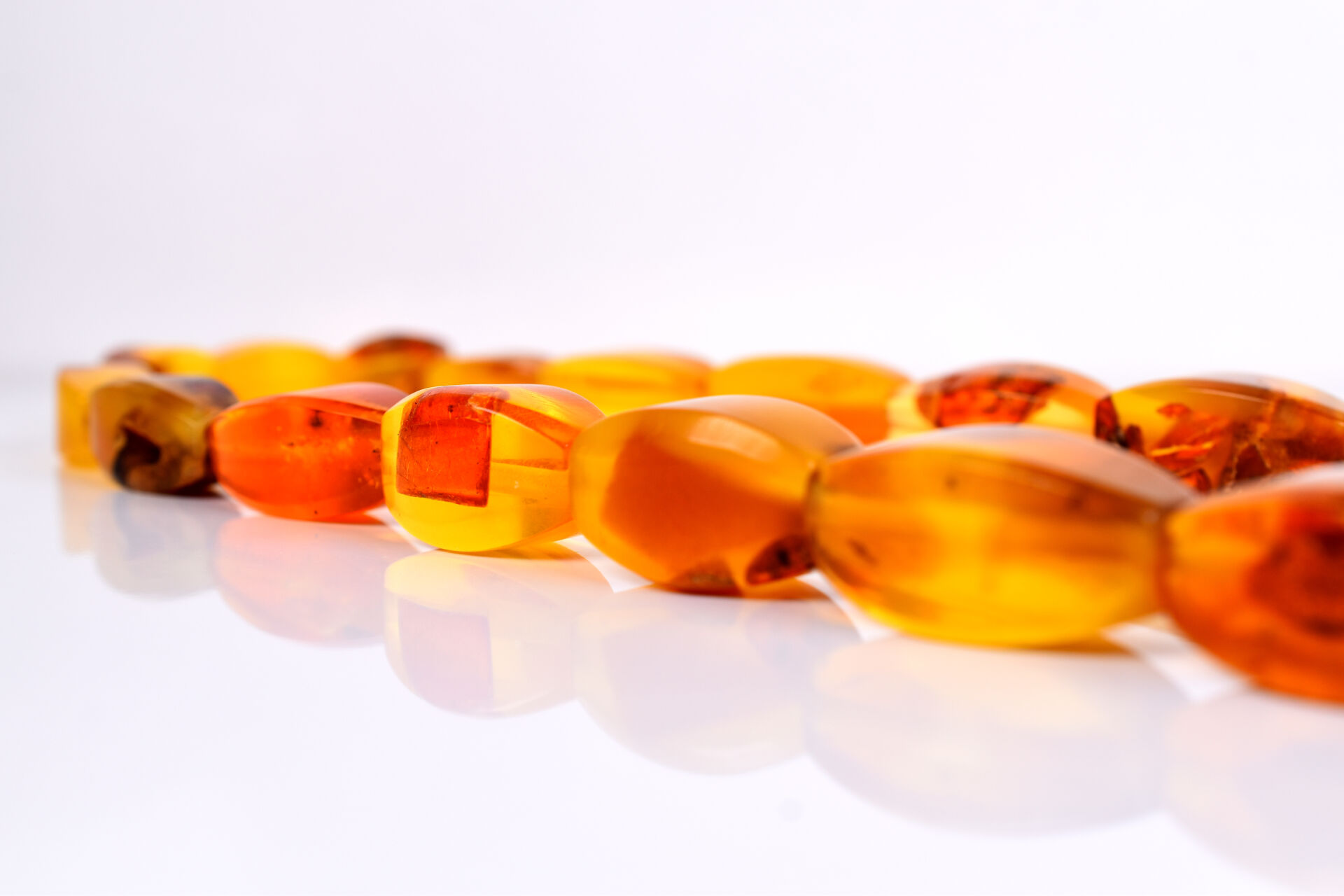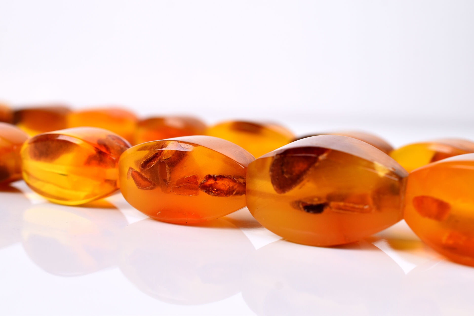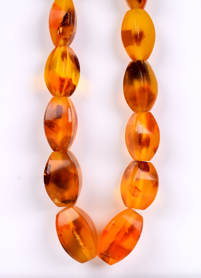 Collier en billes d’ambre en chute (fil en partie distendu). Long. fermé : 36 cm.