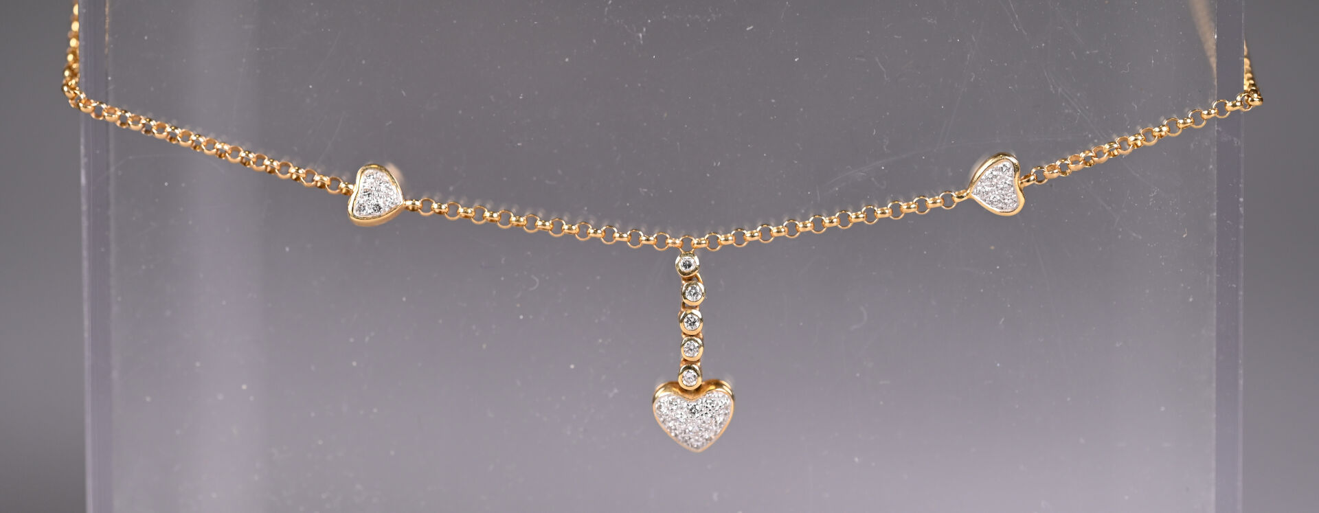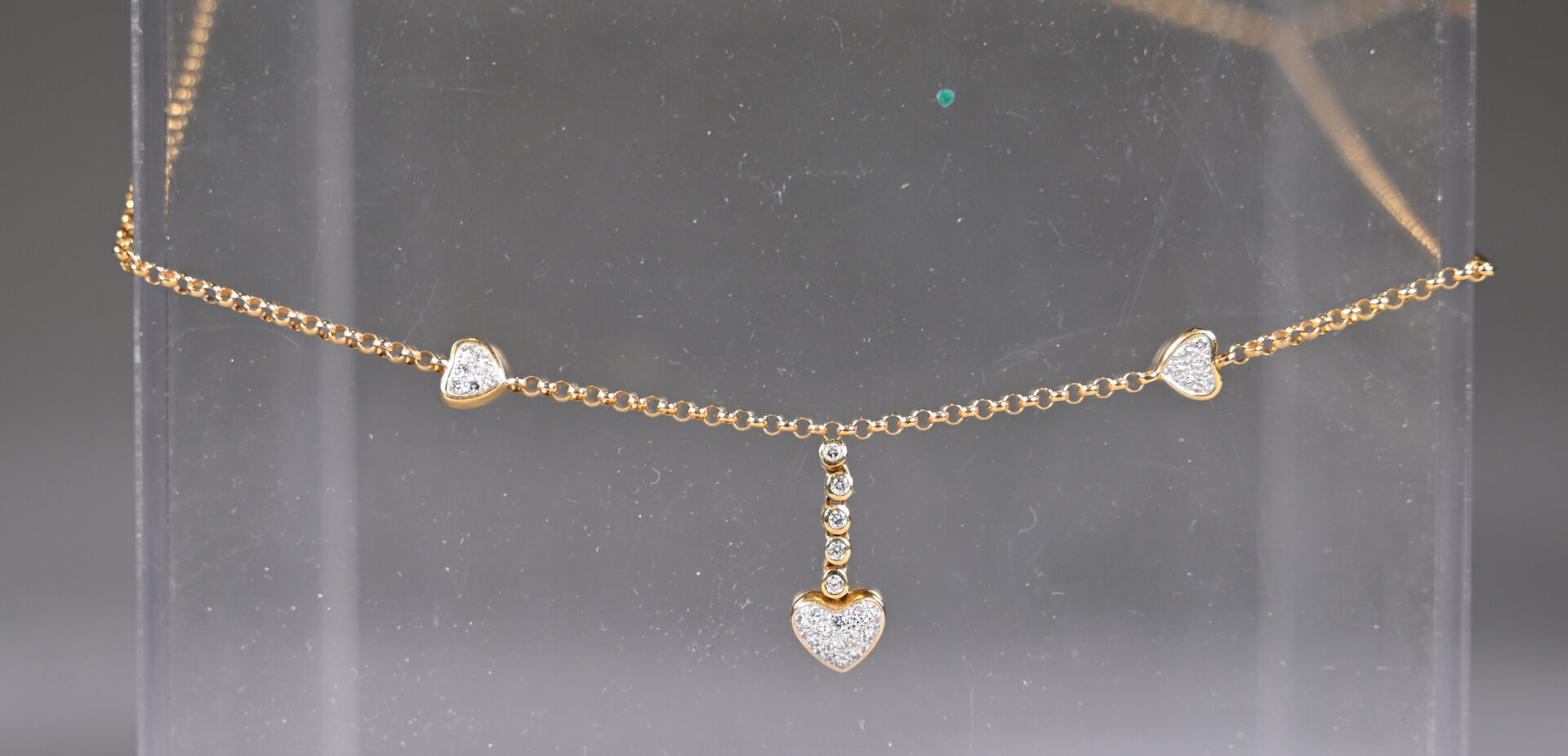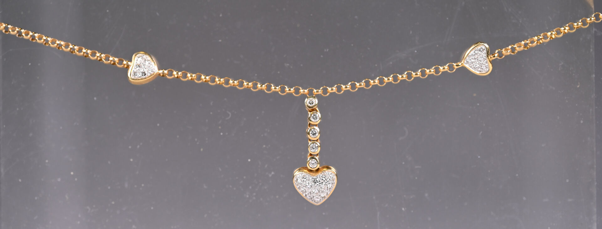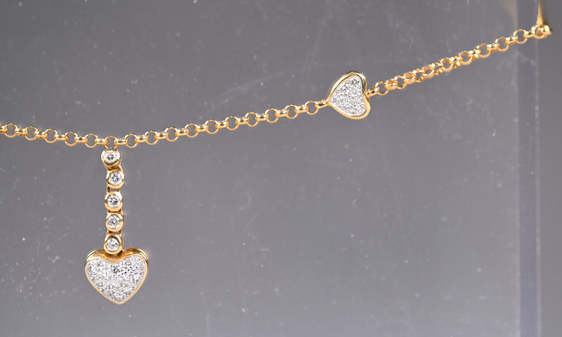 Collier en or 750 /1000 à motifs de petits cœurs pavés de diamants. Longueur : 40 cm. Poids brut : 5 g.