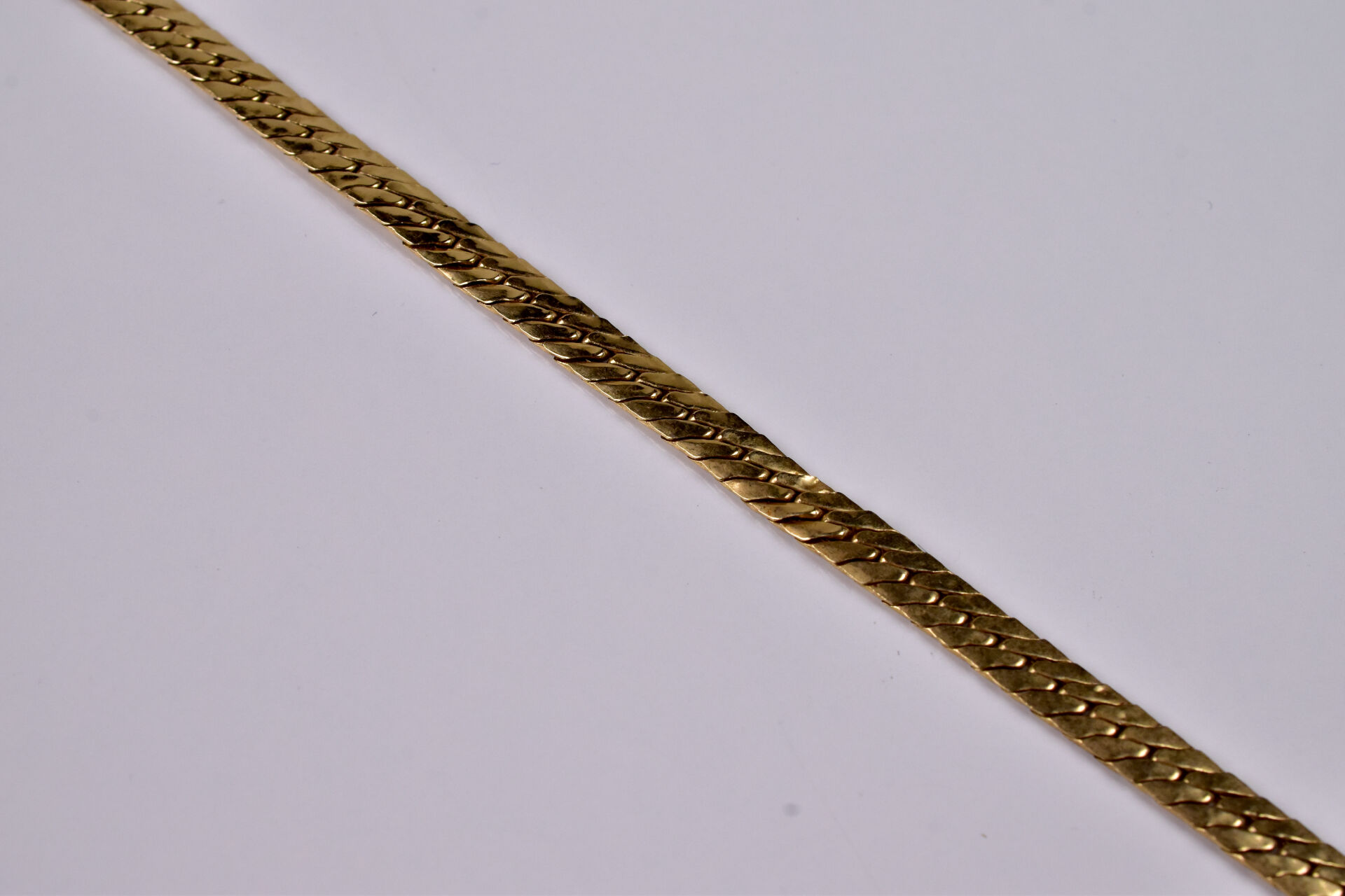 Collier en or jaune 18K 750/1000e à maille anglaise (petits chocs). Long. : 40 cm. Poids. : 12,3 g.