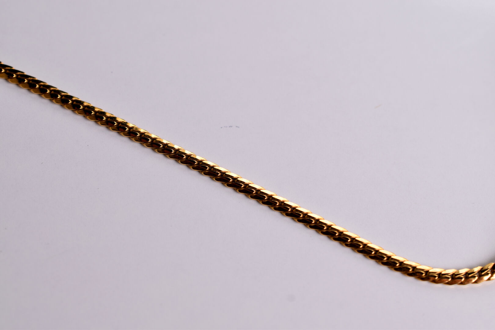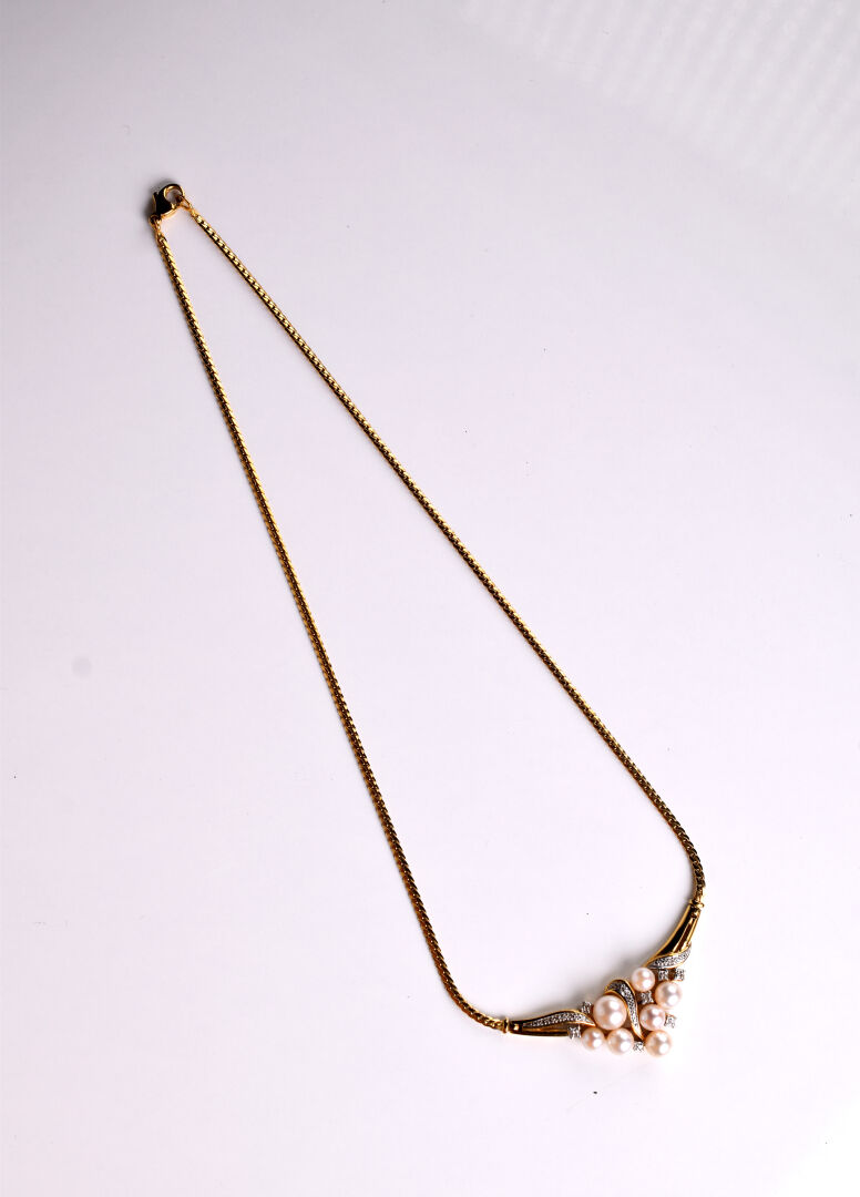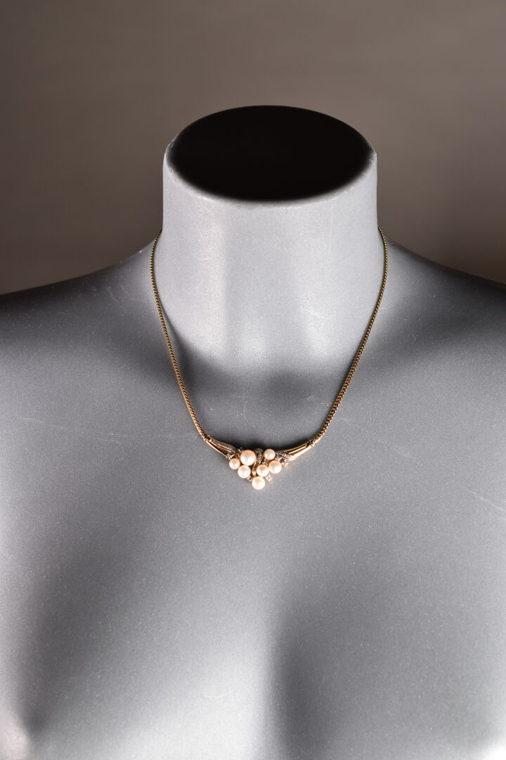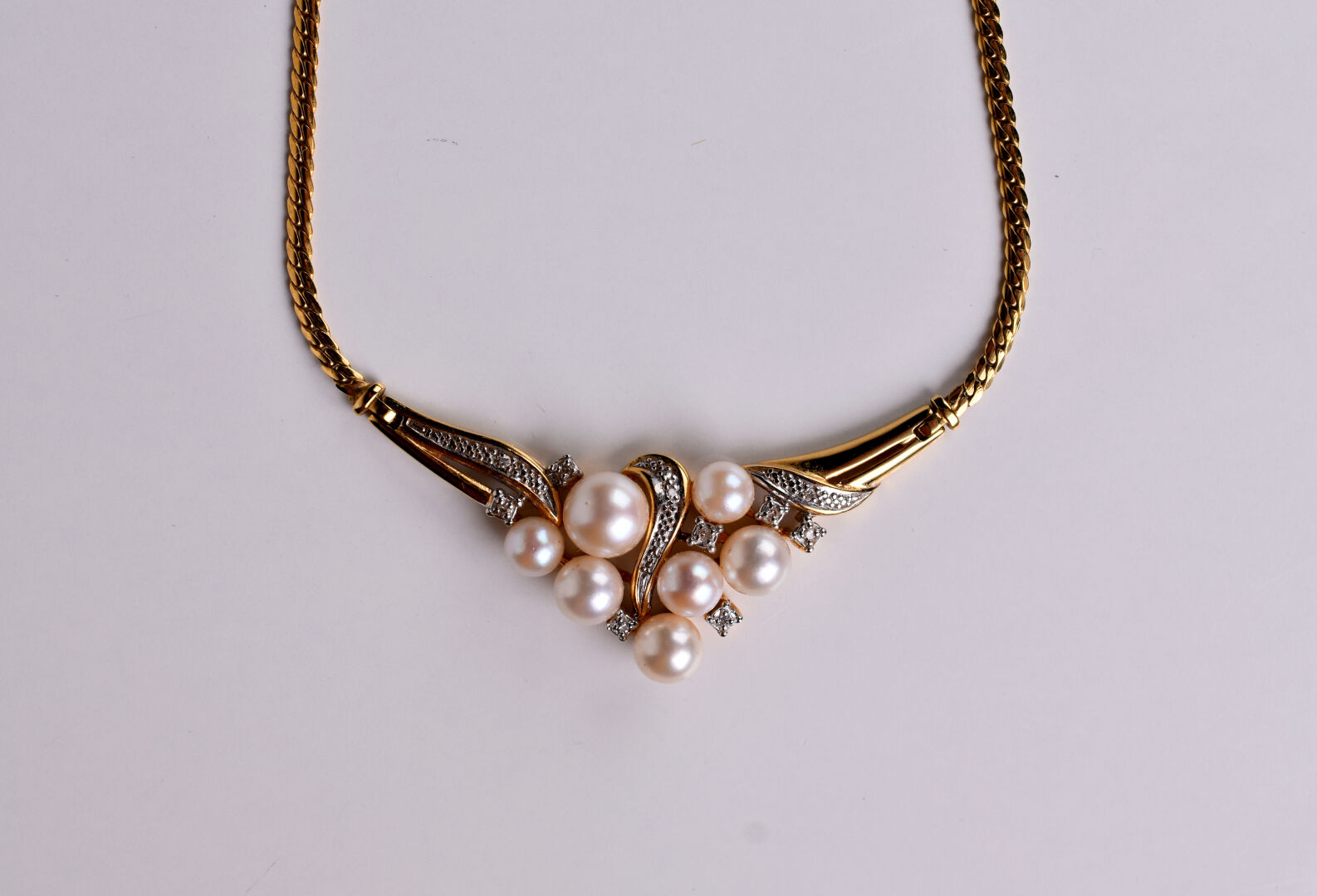 Collier en or jaune 18K 750/1000e à motif orné de 7 perles de cultures et de petits diamants. Long. : 42 cm. Poids brut. : 14 g.