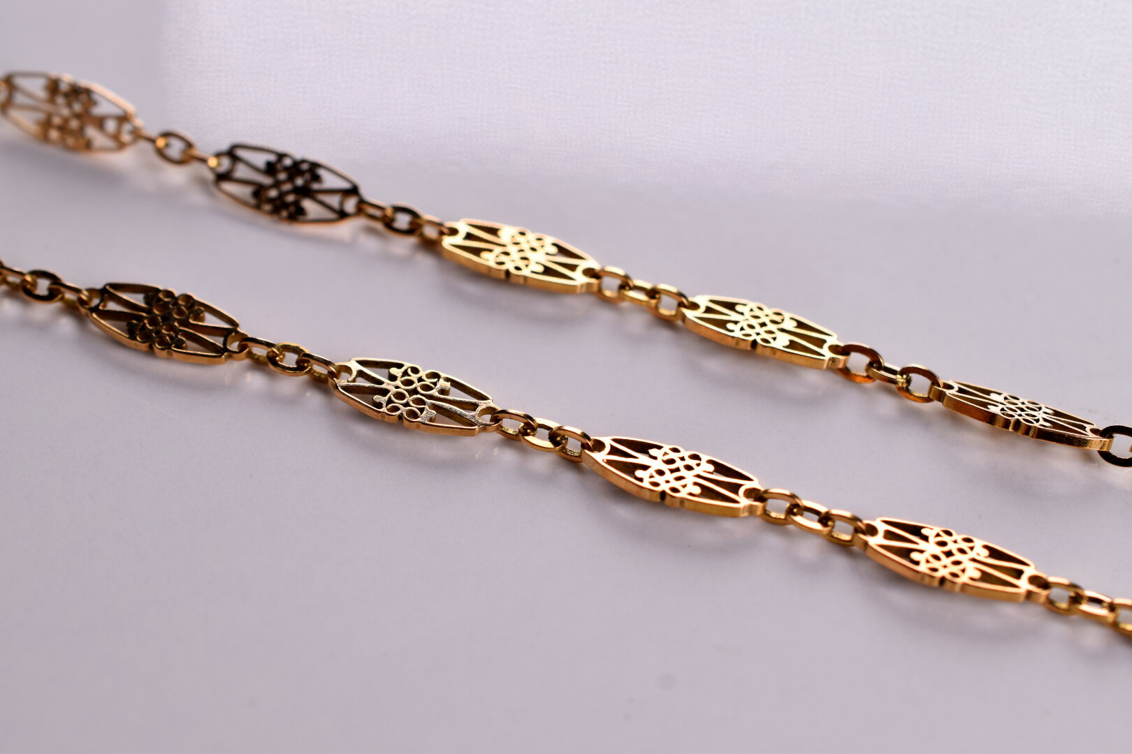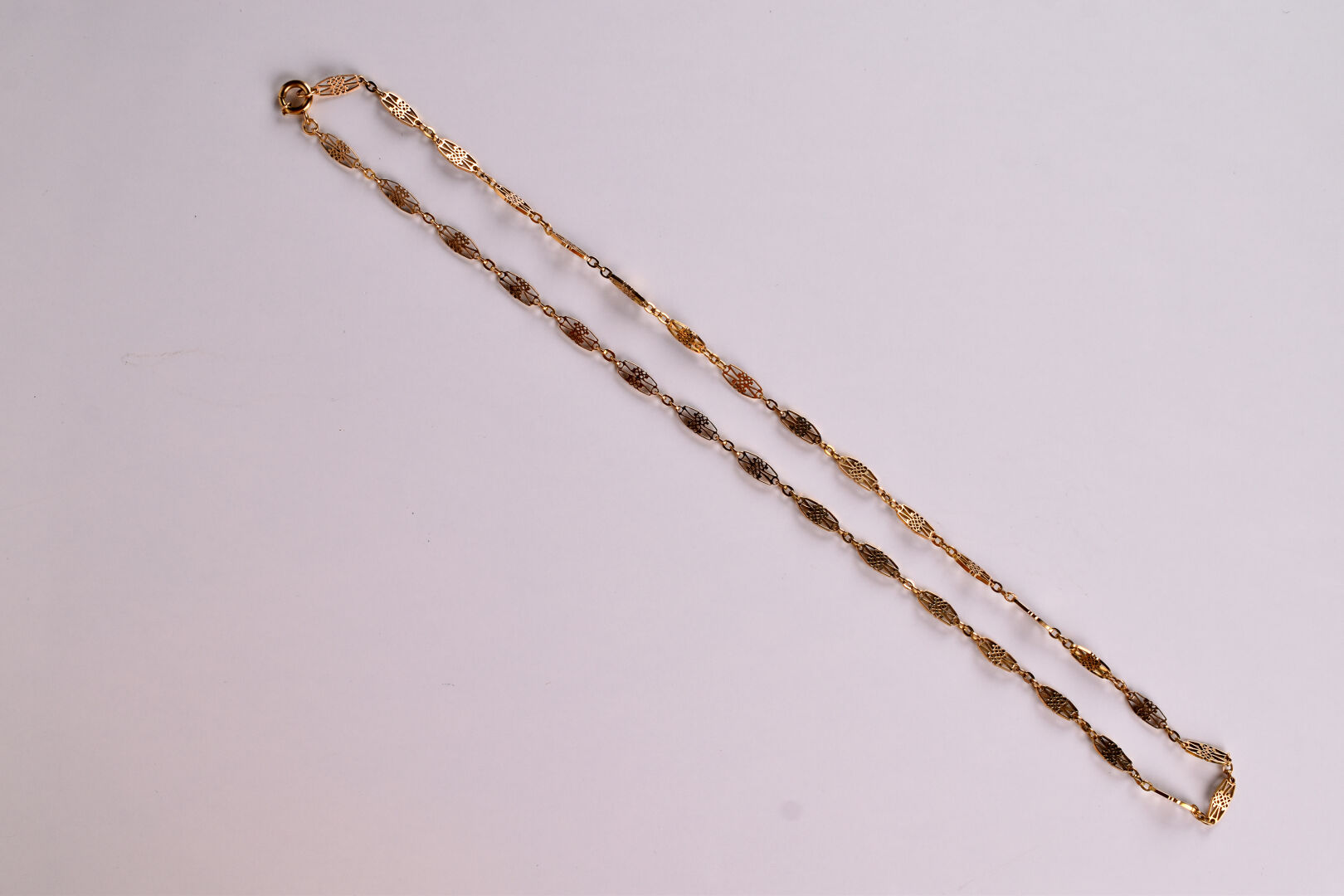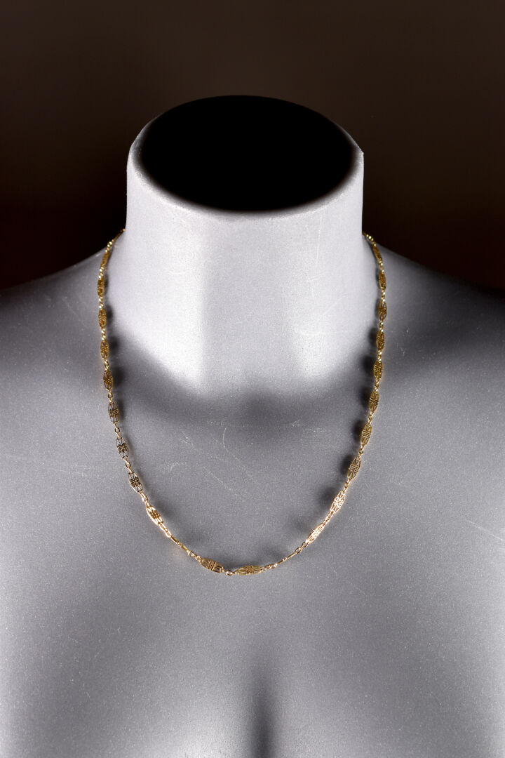 Collier en or jaune 18K 750/1000e à petite maille d’ovales filigrannés. Long. : 50 cm. Poids. : 8,4 g.