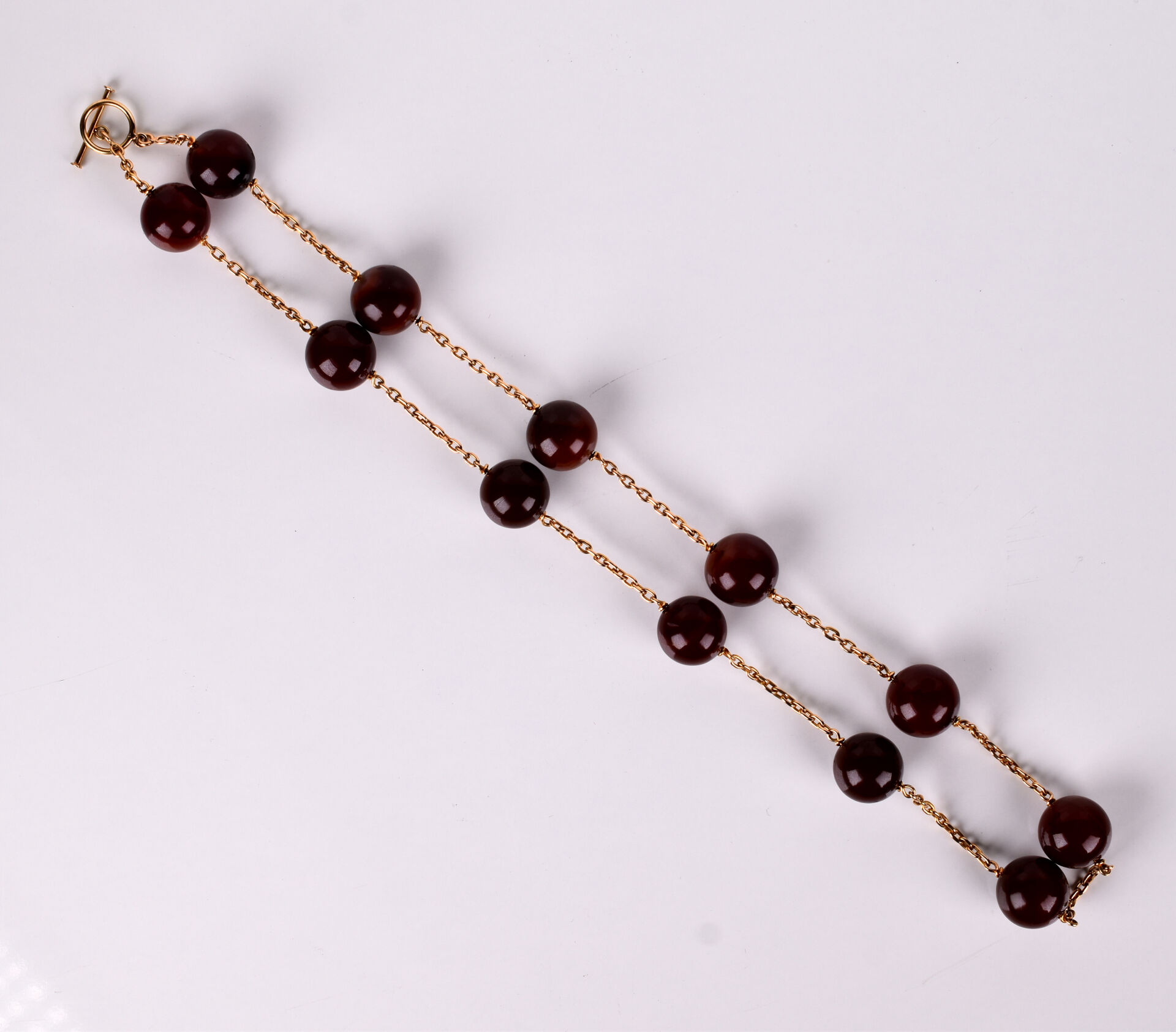 Collier en or jaune 18K 750/1000e et 12 perles d’agate (15,7 mm environ). Long. : 62 cm. Poids brut. : 83,66 g.