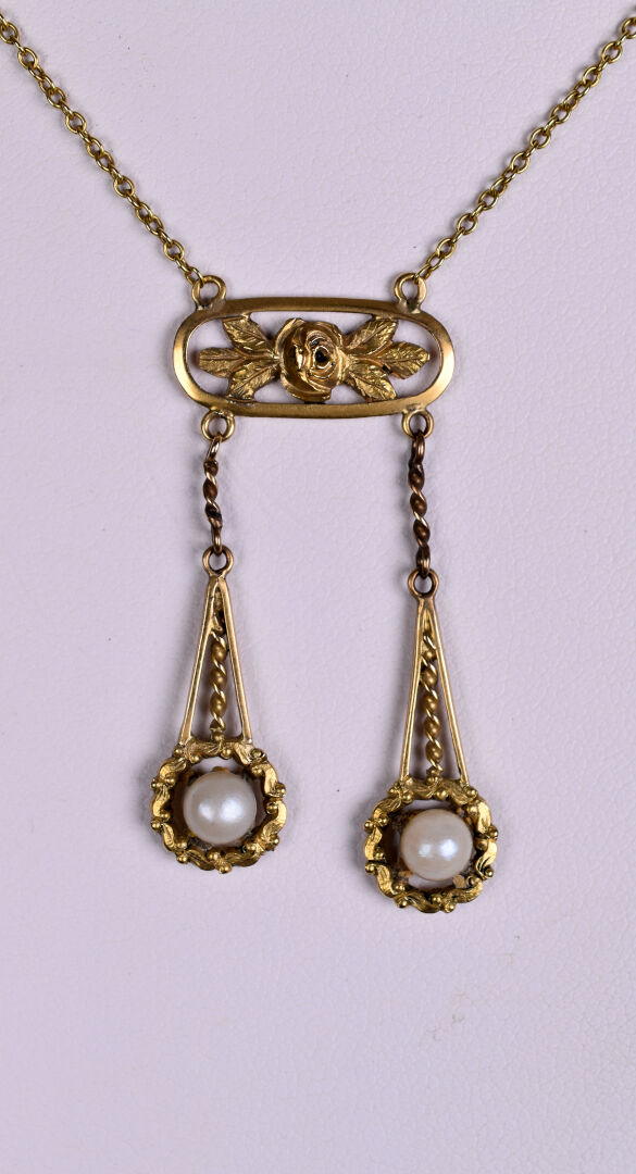 Collier négligé Art nouveau en or jaune 18K 750/1000e à motif d’un ovale à la rose retenant deux pampilles ornées de deux perles de cultures. Long. : 41 cm. Poids brut. : 4,6 g.