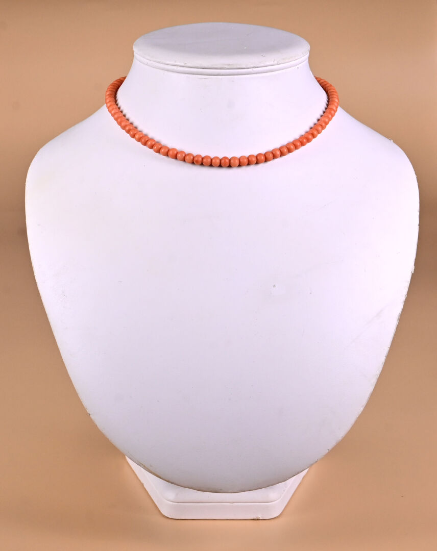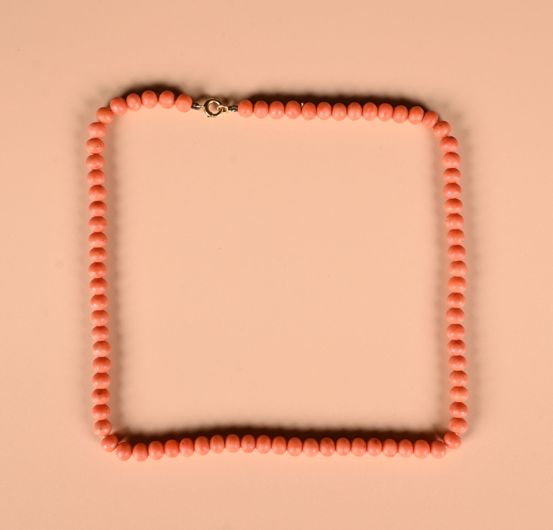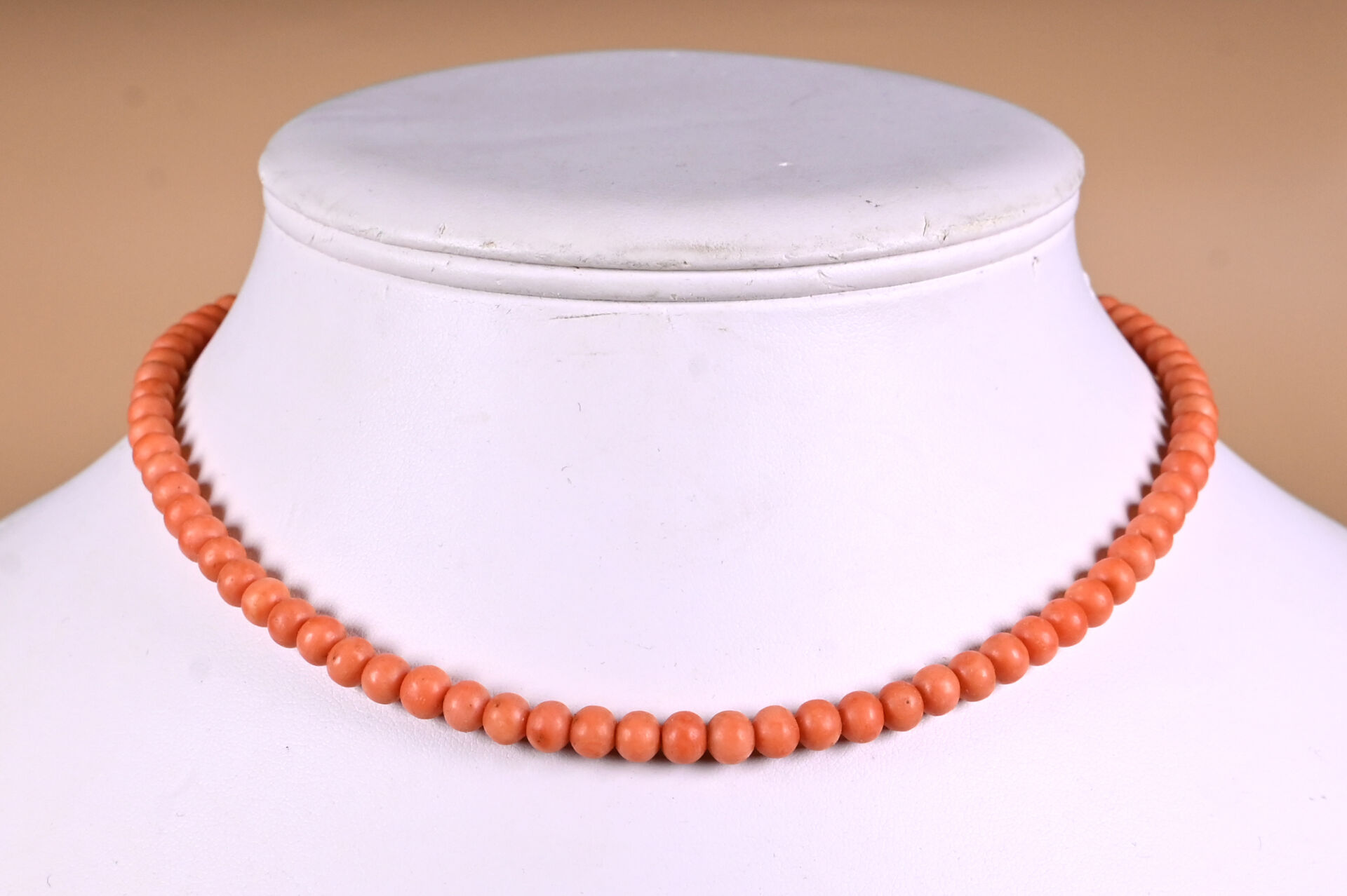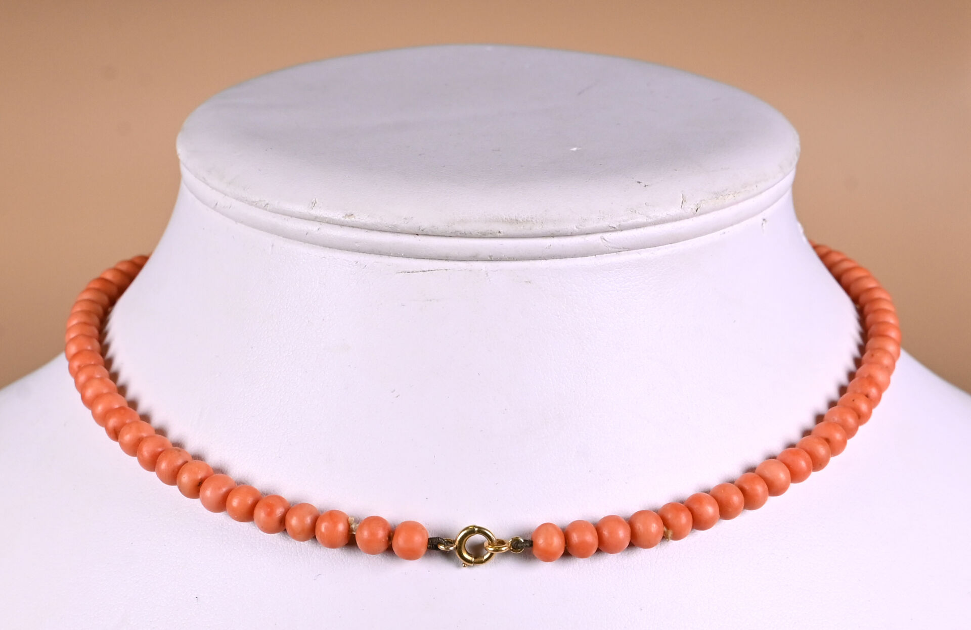 Collier ras de cou à perles de corail rouge et fermoir en or jaune 18K 750/1000e (fil détendu ou manque une perle). Poids brut. : 18,04 g. Long. : 40,5 cm.
