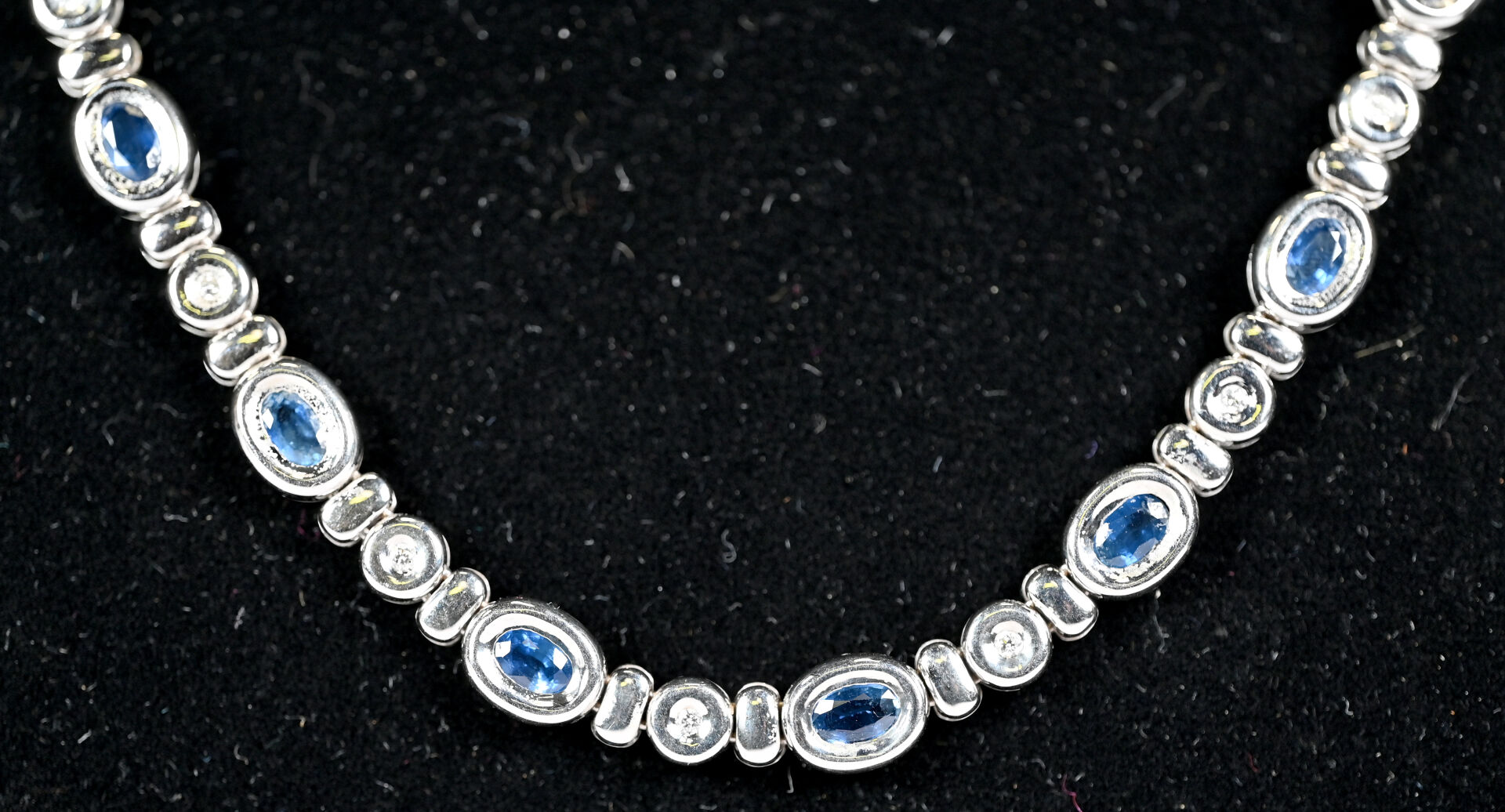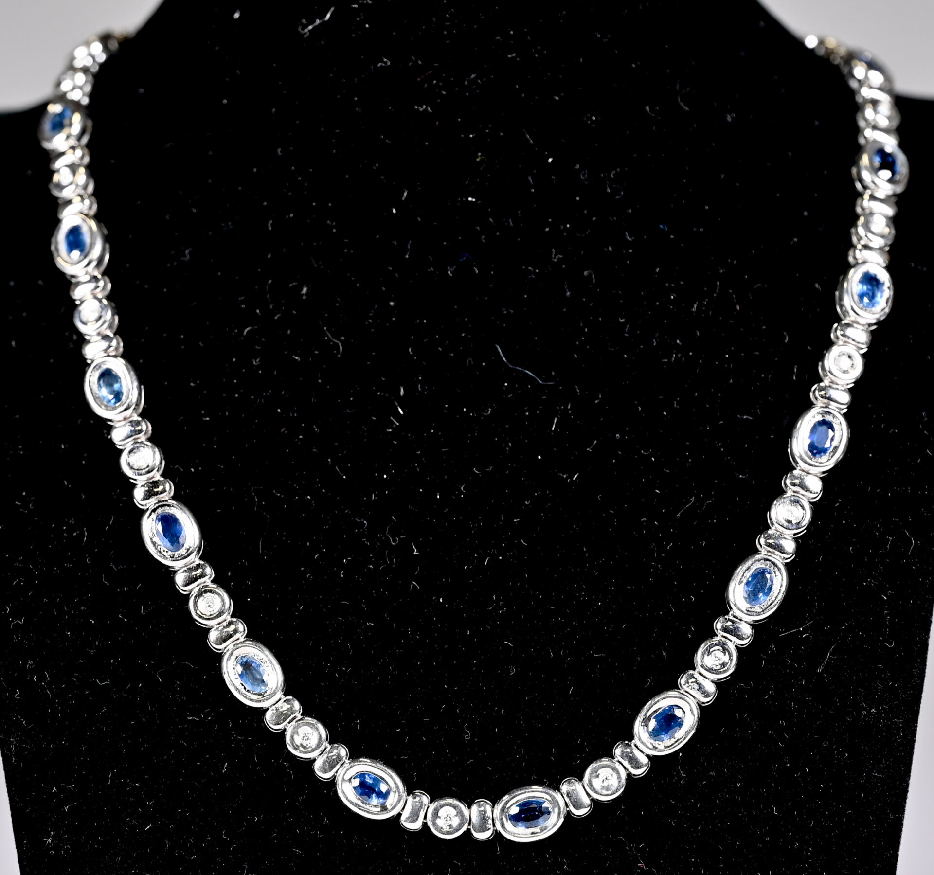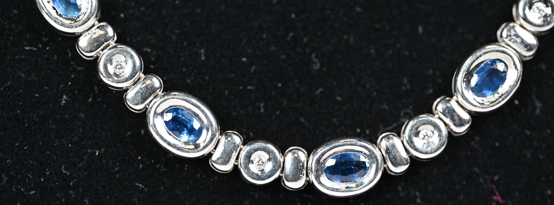 Collier souple en or gris 18k 750/1000e orné de 19 saphirs ovales d’env. 0,40 ct chacun (serti ovale clos) alternés de 19 petits diamants. Longueur : 42 cm. Dans un écrin. Poids brut : 41,8 g.
