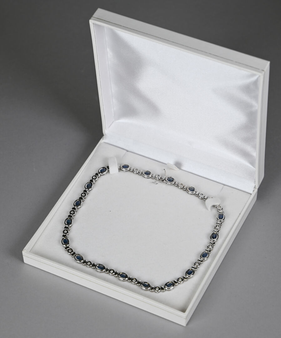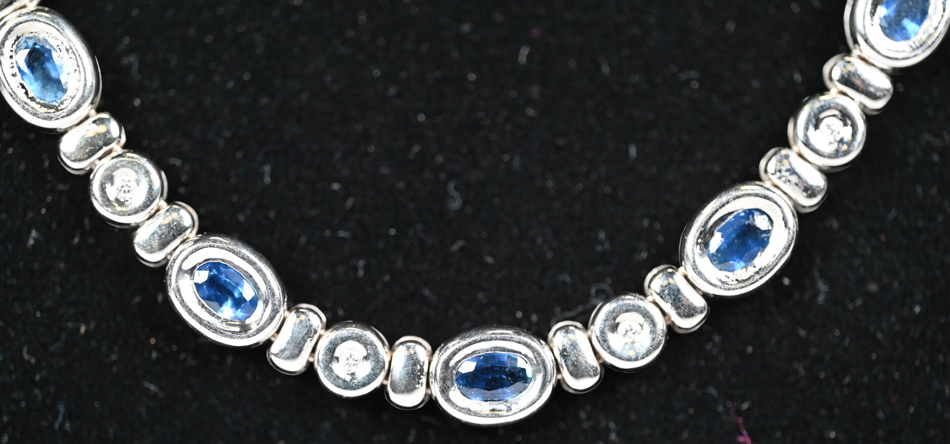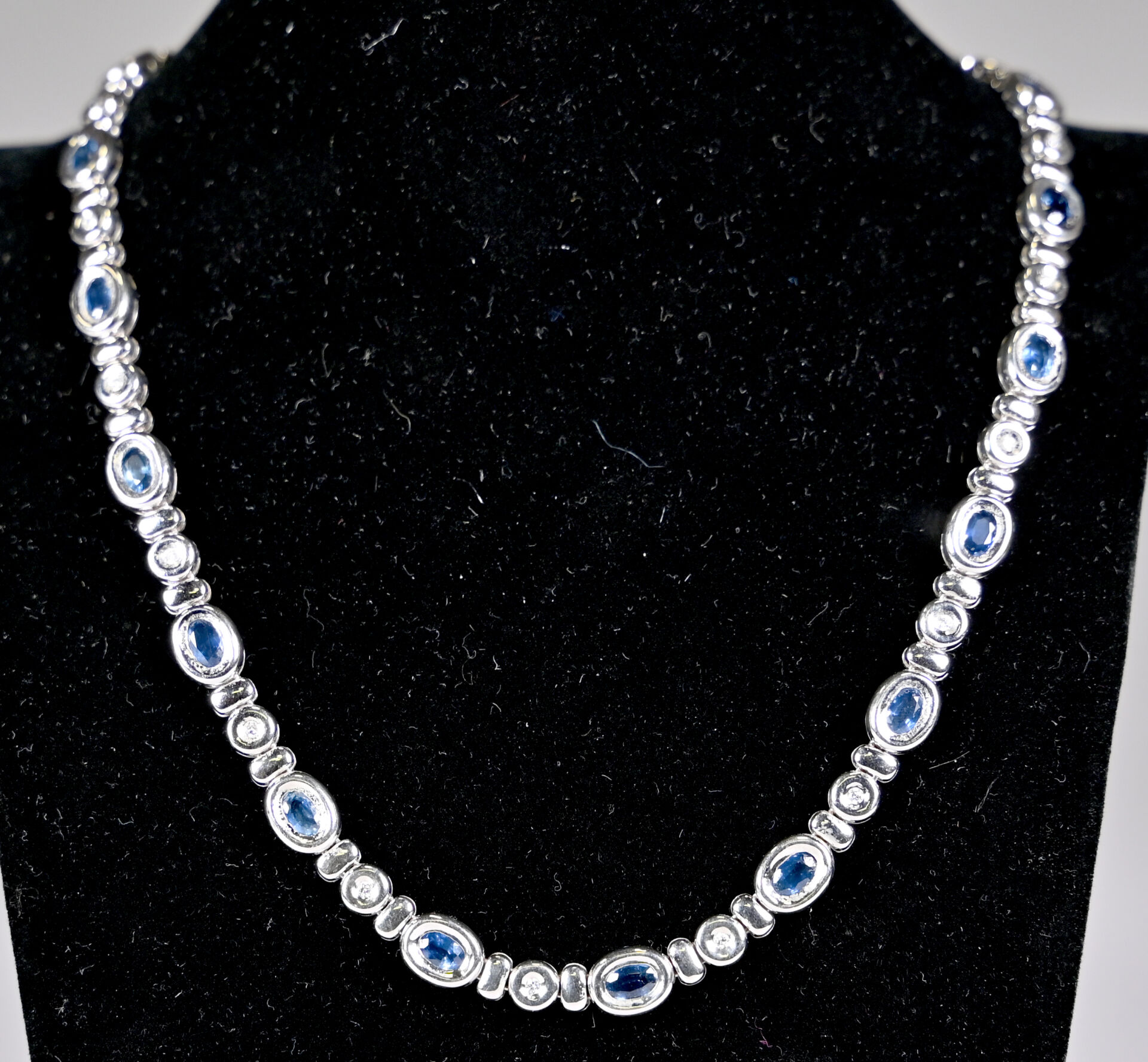Collier souple en or gris 18k 750/1000e orné de 19 saphirs ovales d’env. 0,40 ct chacun (serti ovale clos) alternés de 19 petits diamants. Longueur : 42 cm. Dans un écrin. Poids brut : 41,8 g.