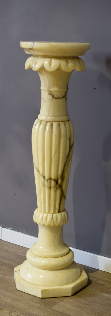 Colonne en marbre crème veiné noir, le fût balustre à godrons, la base octogonale. XXe siècle. Haut. : 92,5 cm.