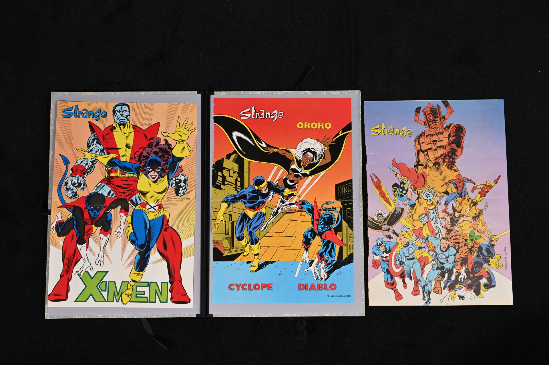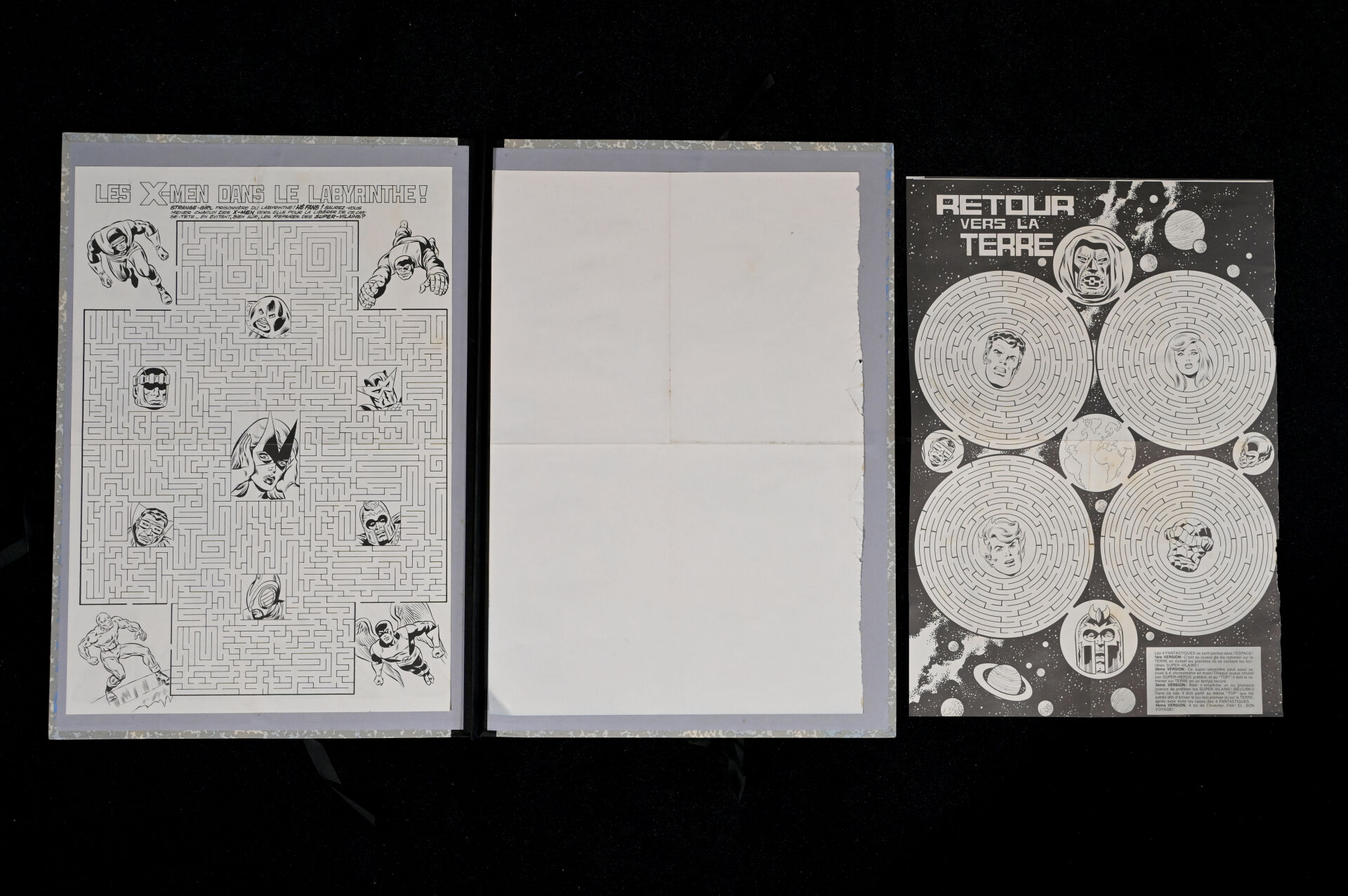 COMICS MARVEL. 3 affiches dont 2 pages découpées X-MEN avec labyrinthe à jouer.