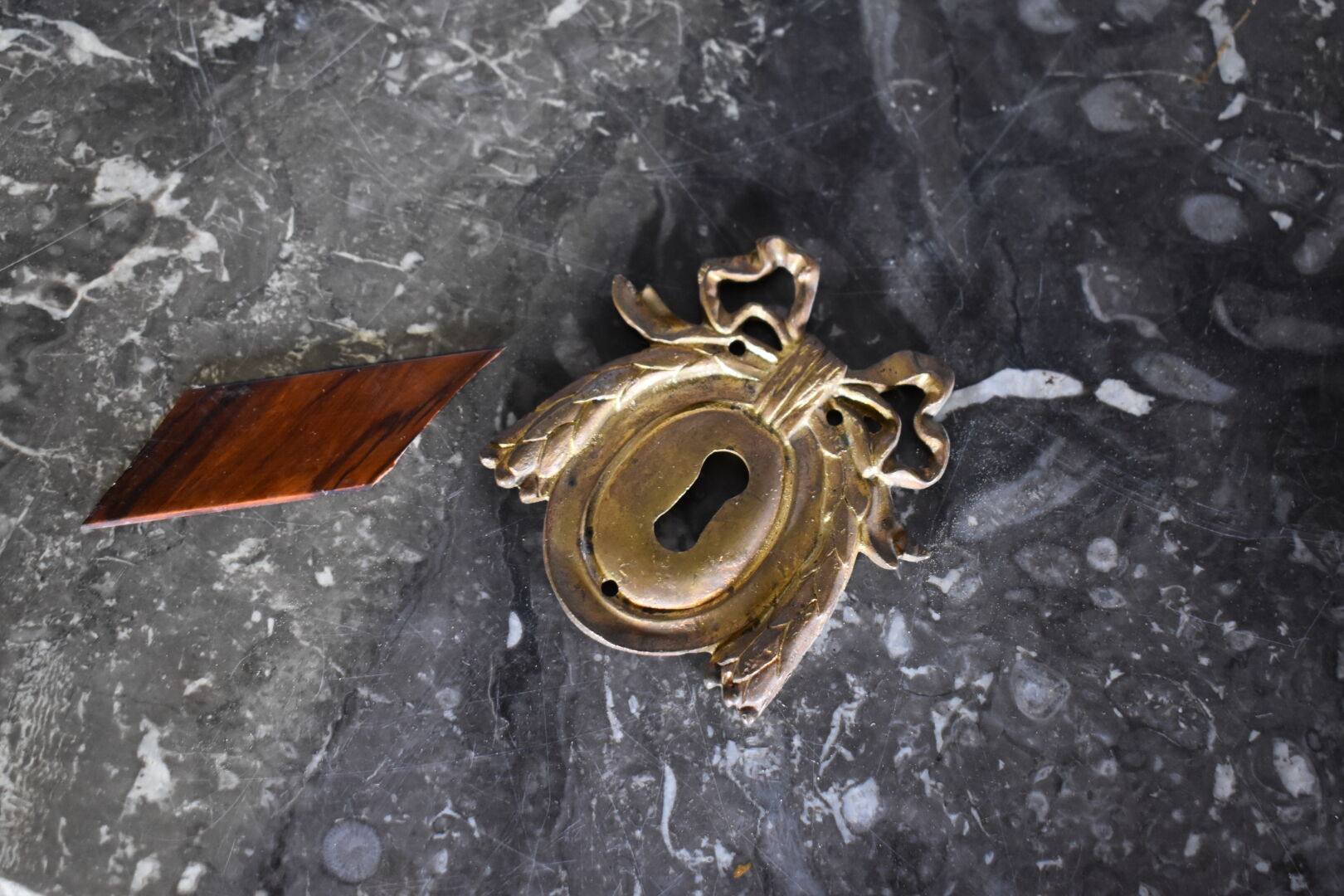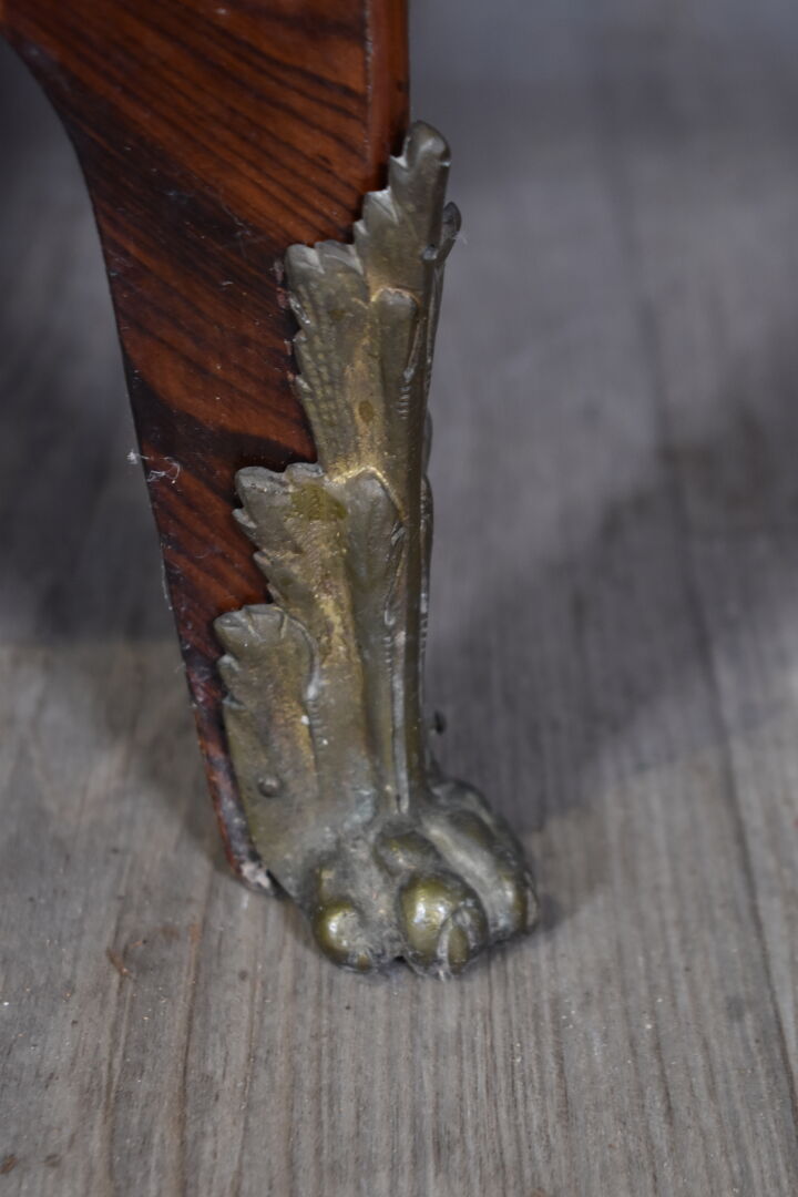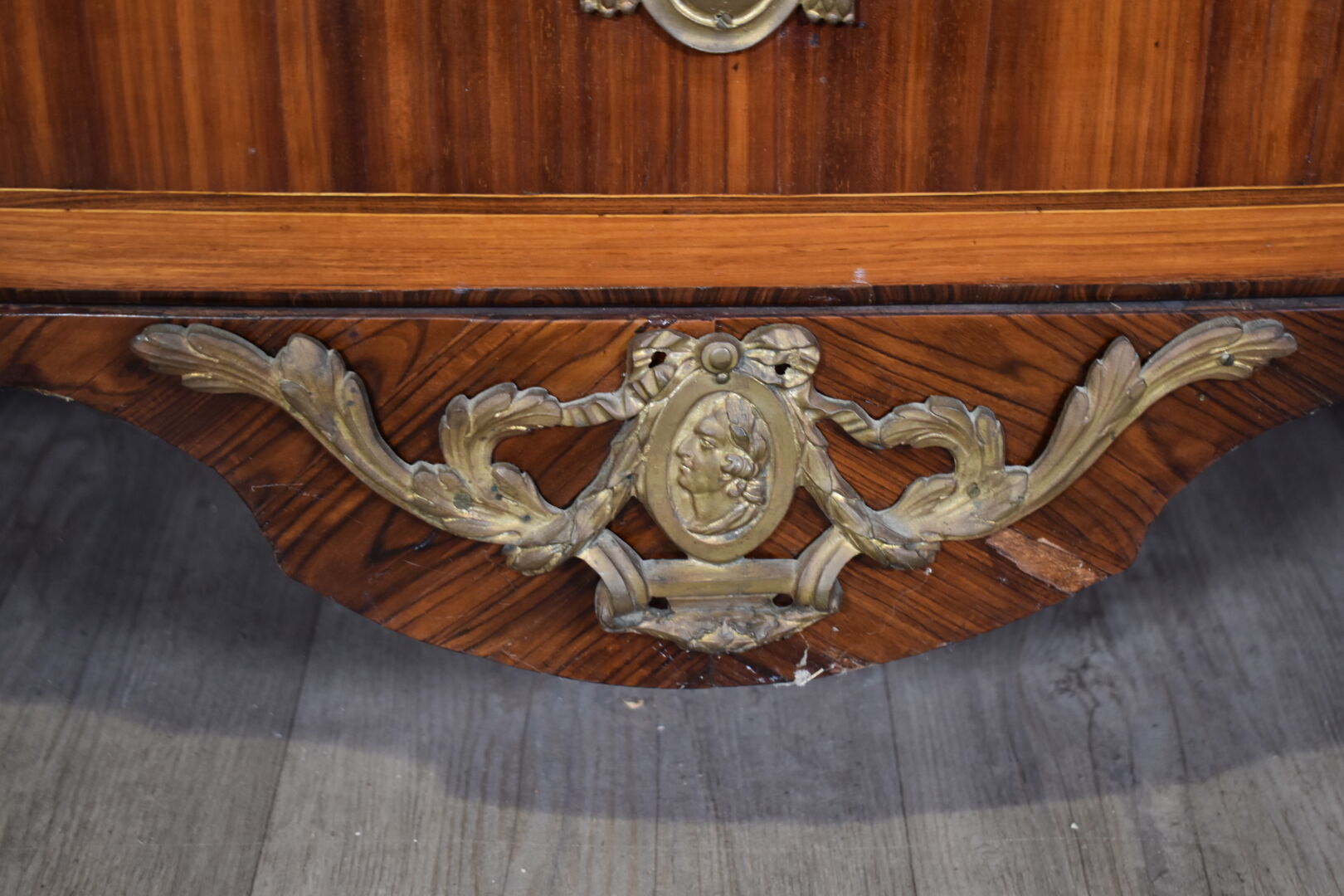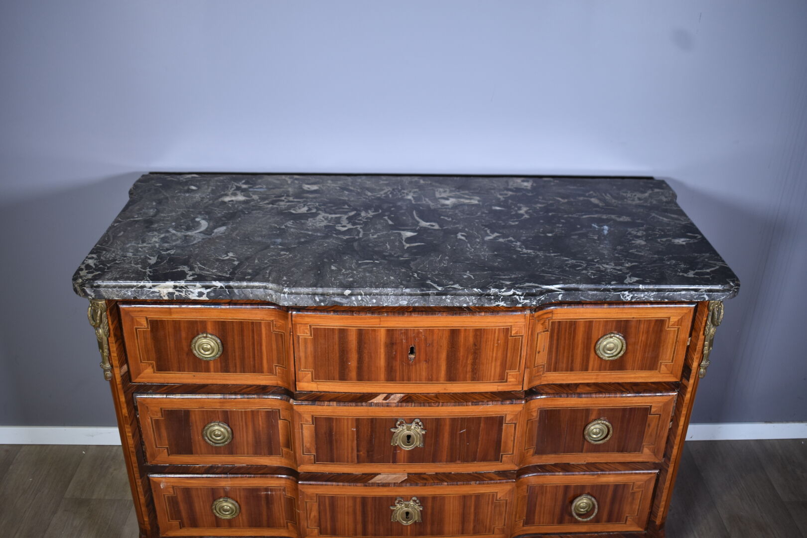 Commode à façade à ressaut central en placage de bois de rose, satiné, bois de violette (éclats et manques) . Elle ouvre à 5 tiroirs sur 3 rangs sur traverse et repose sur des pieds cambrés. Plateau de marbre gris veiné blanc. Ornementation de bronze ciselé telle que entrées de serrure, poignées de tirage (restaurations, un pied anté). En partie d’Epoque Transition Louis XV – Louis XVI. Haut. : 88 cm – Larg. : 132 cm -Prof; : 58 cm.