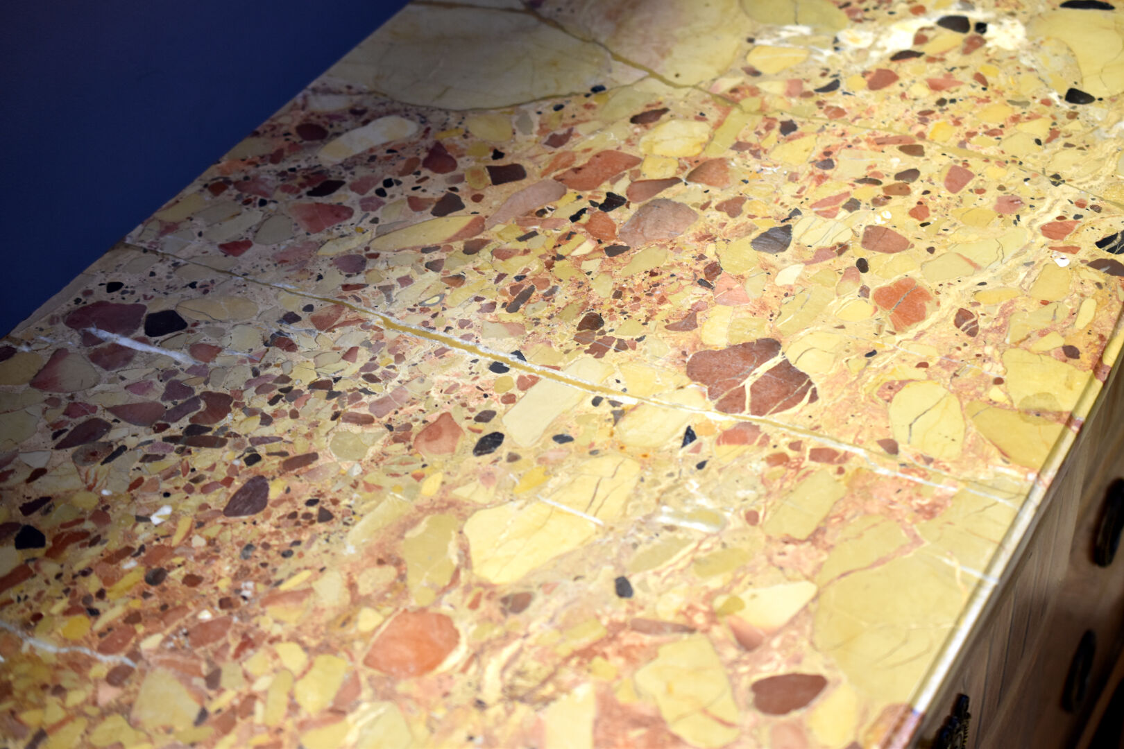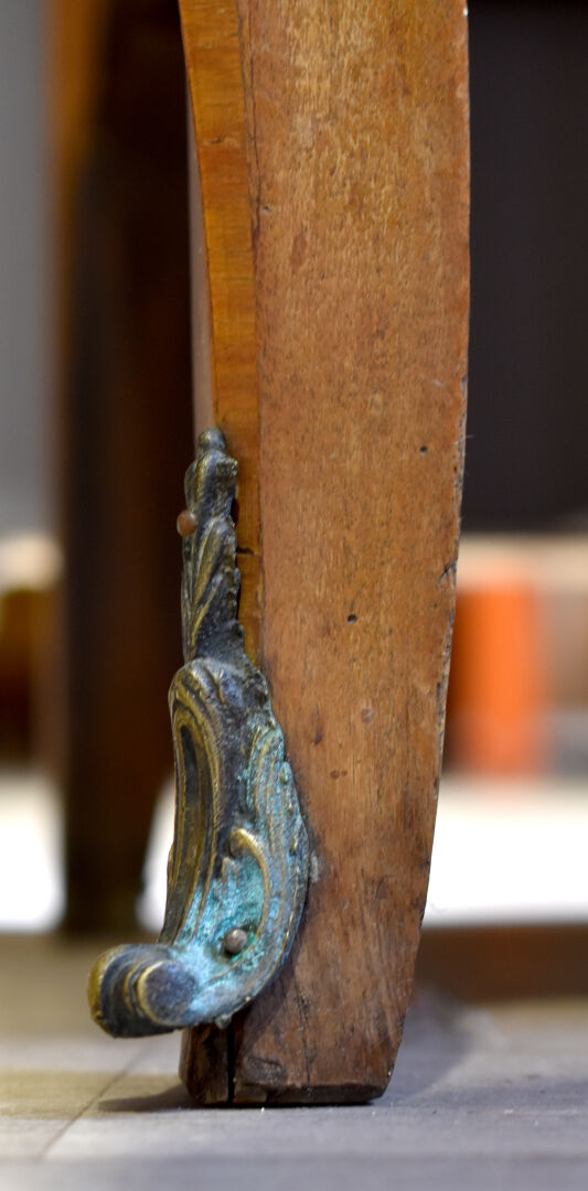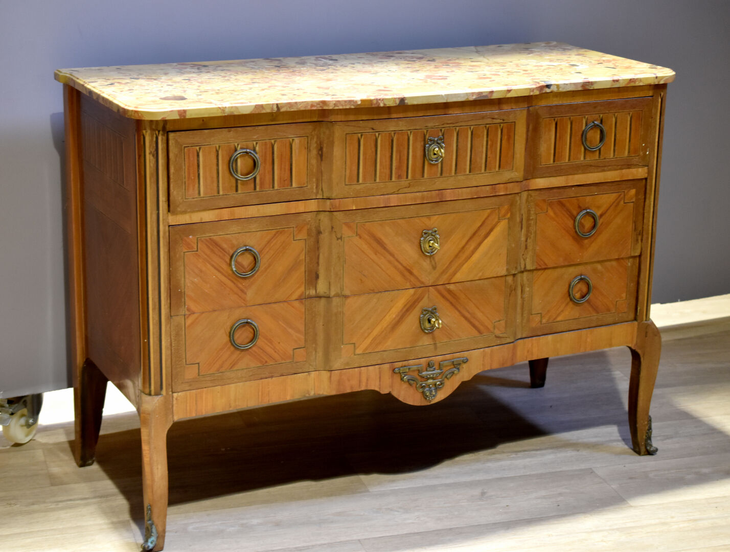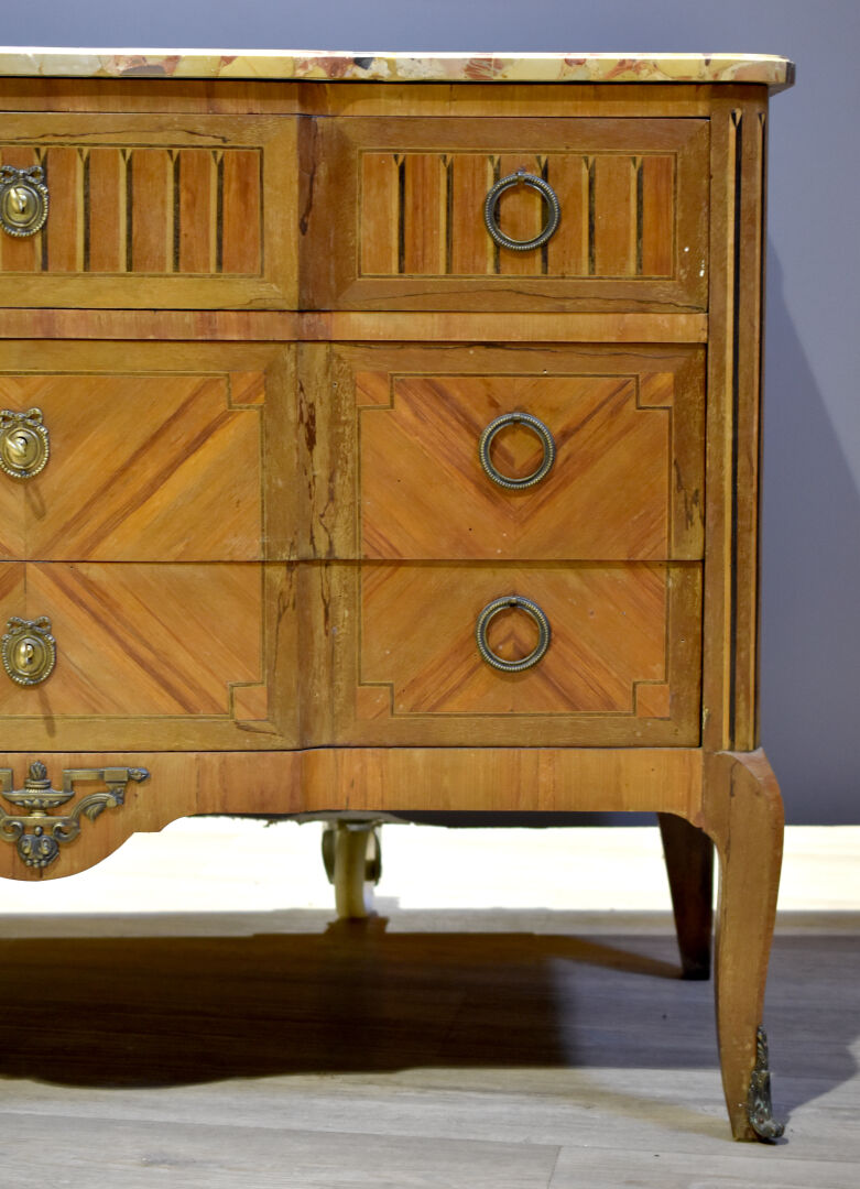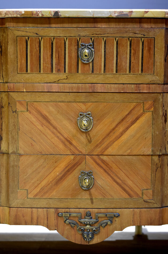 Commode à façade à ressaut central, en placage de noyer et bois blond. Elle ouvre à trois tiroirs et repose sur des pieds cambrés. Plateau de marbre brèche d’Alep (accidenté recollé). Style transition Louis XV-Louis XVI. Haut. : 58 cm – Larg. 120 cm – Prof. : 48 cm.